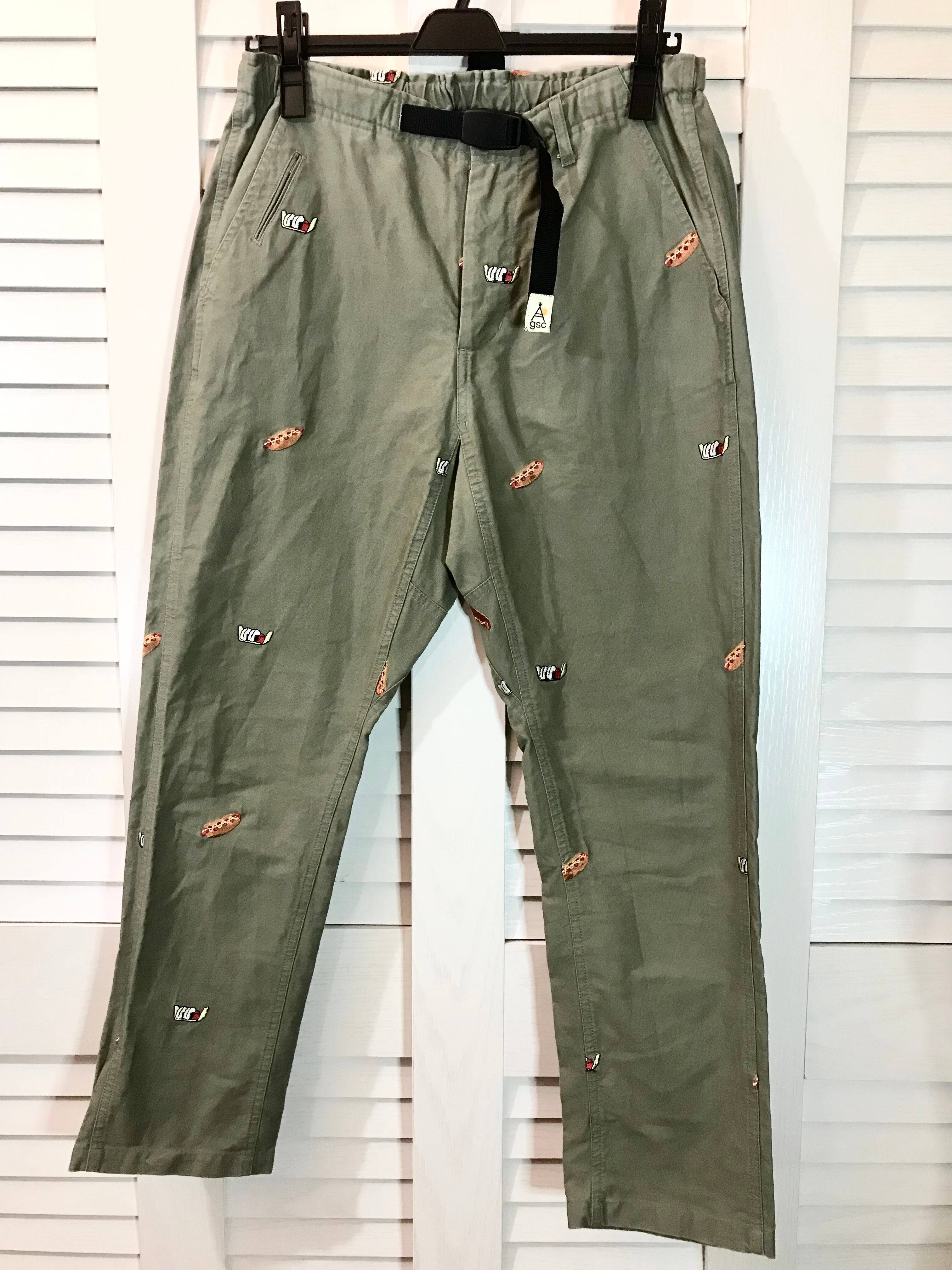 go slow caraban チノクロス ランチ刺繍デザインイージーパンツ カーキ おむすび/タコさんウインナー/ホットドッグ