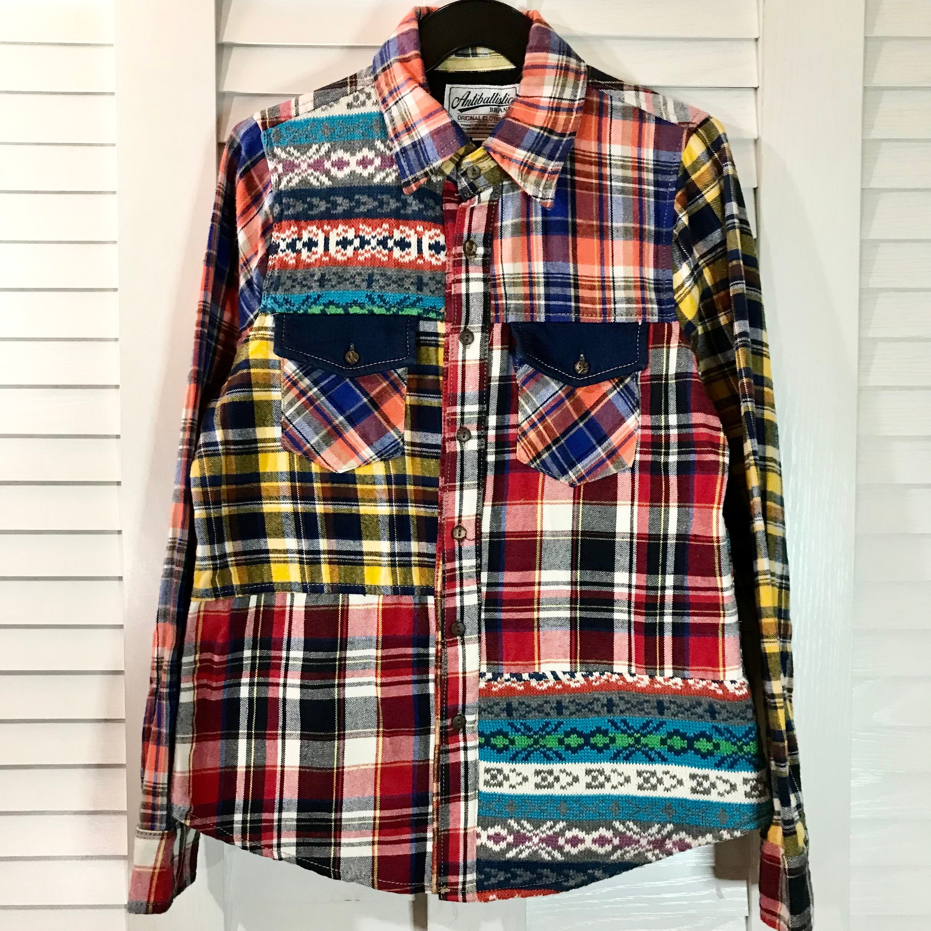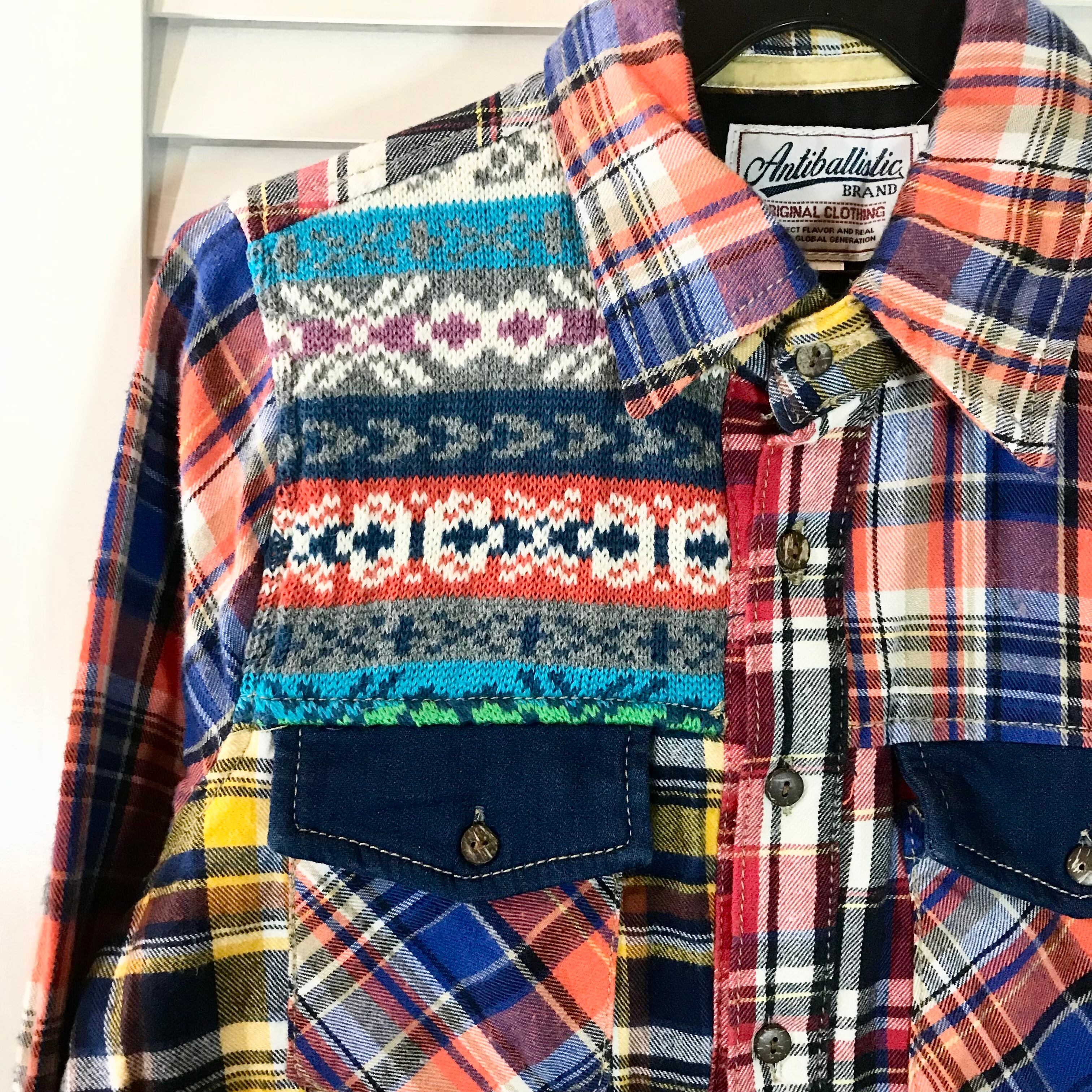 ANTIBALLISTIC クレイジーパターン パッチワークデザインシャツ タータンチェックネル×ジャガードニット×デニム