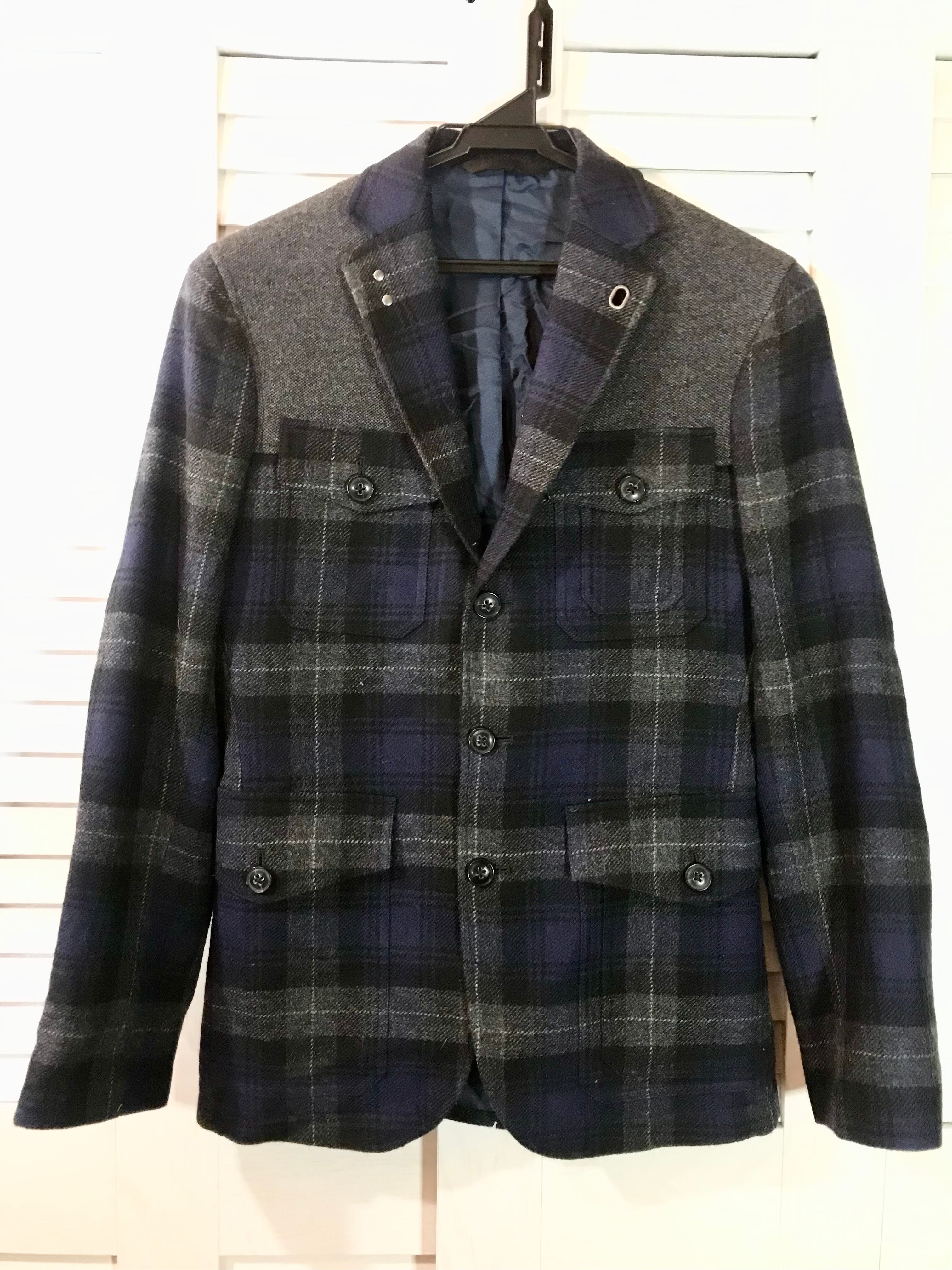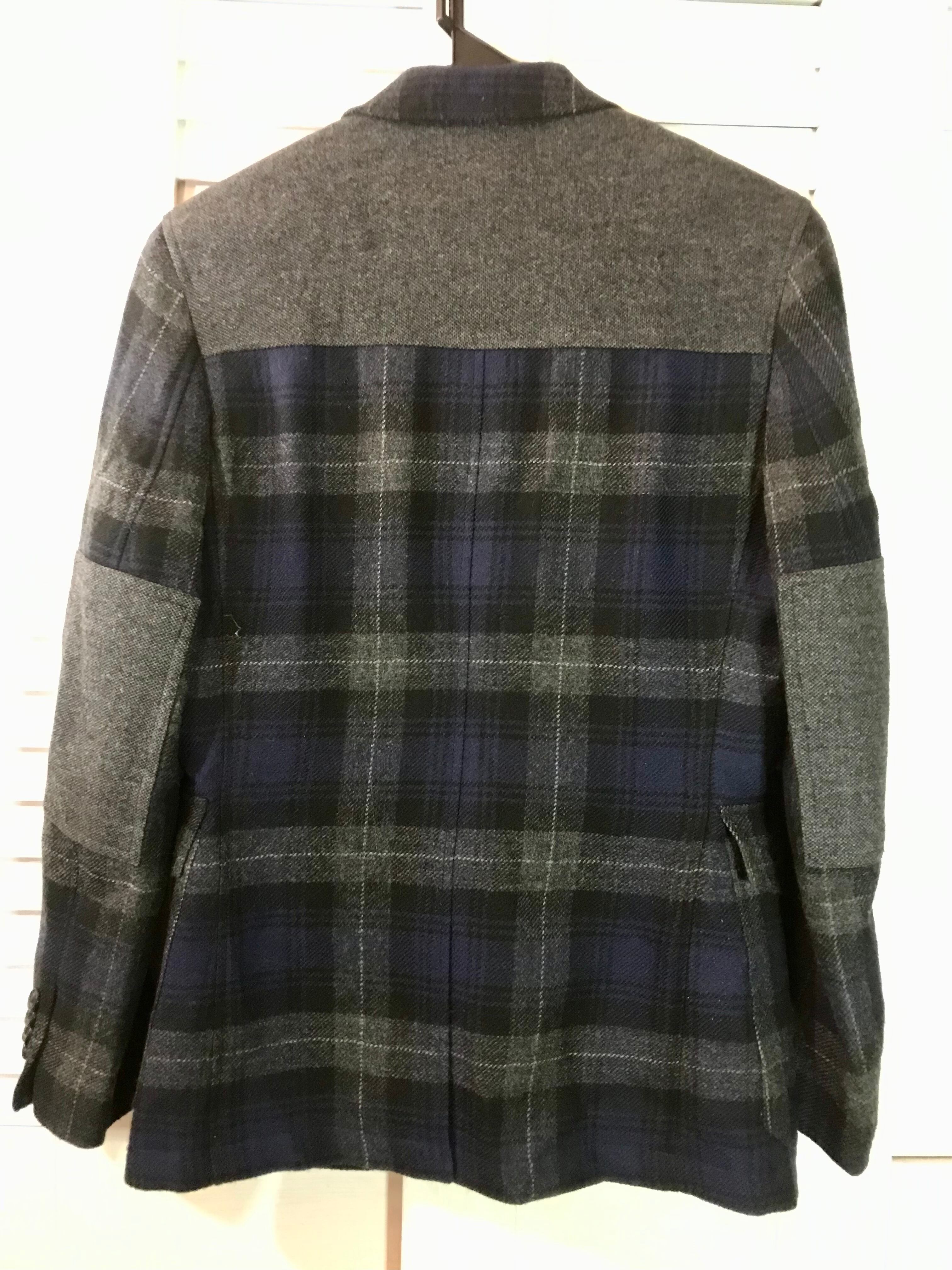 GAP ツィードヨーク×エルボーパッチ タータンチェック ウールデザインテーラードジャケット ネイビー×グレー