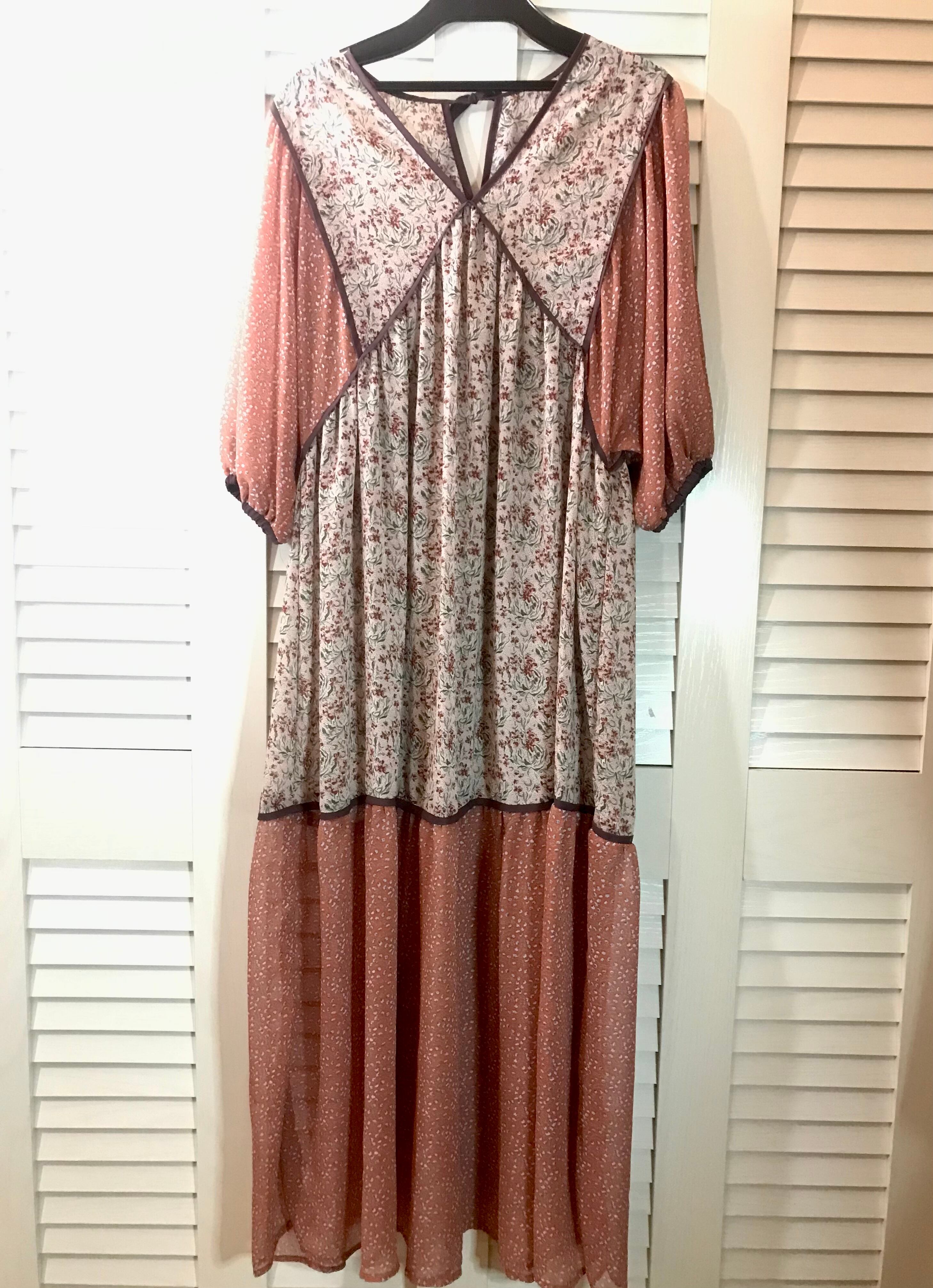 natural couture パッチワークアンティークフラワーパターンシフォンワンピ サーモンピンク