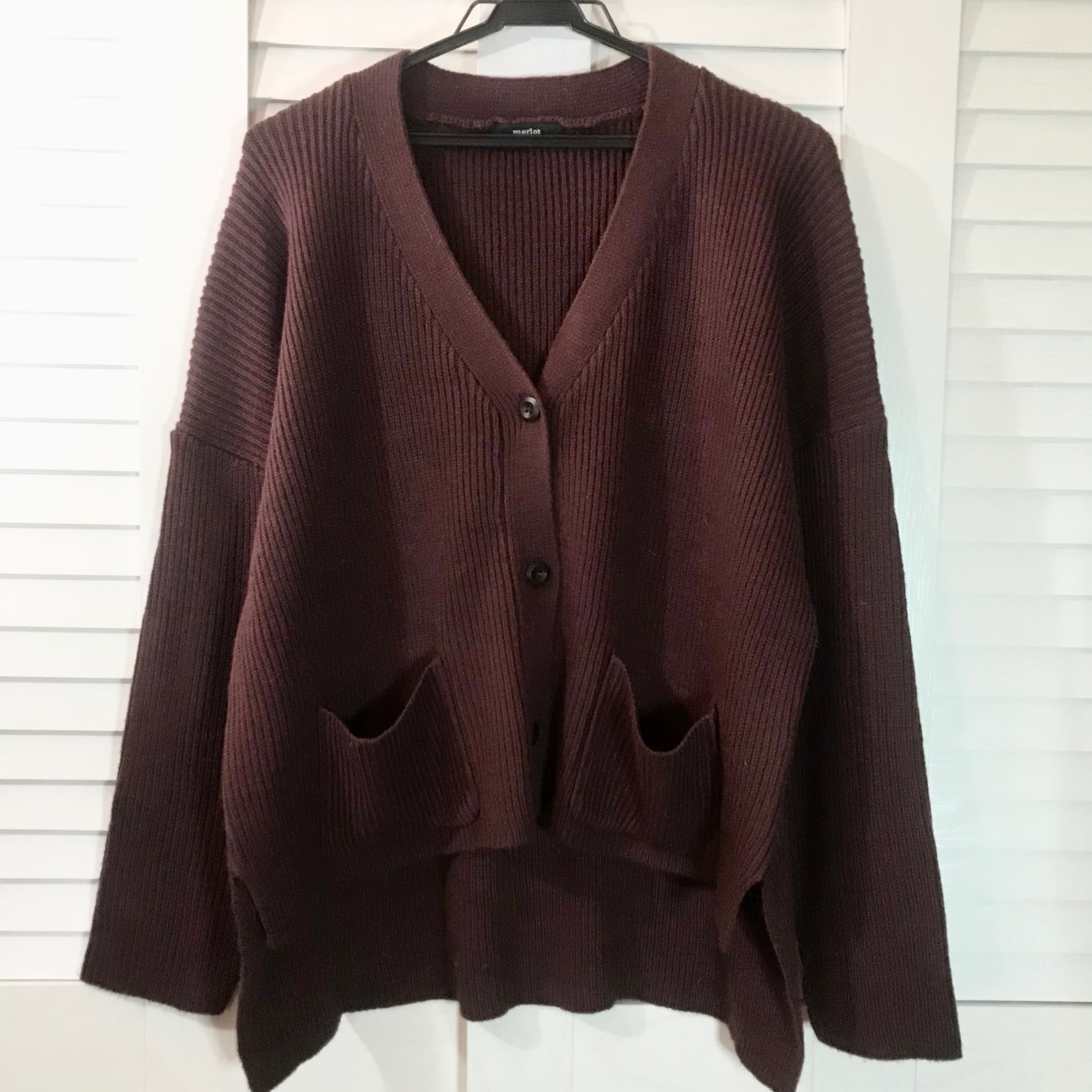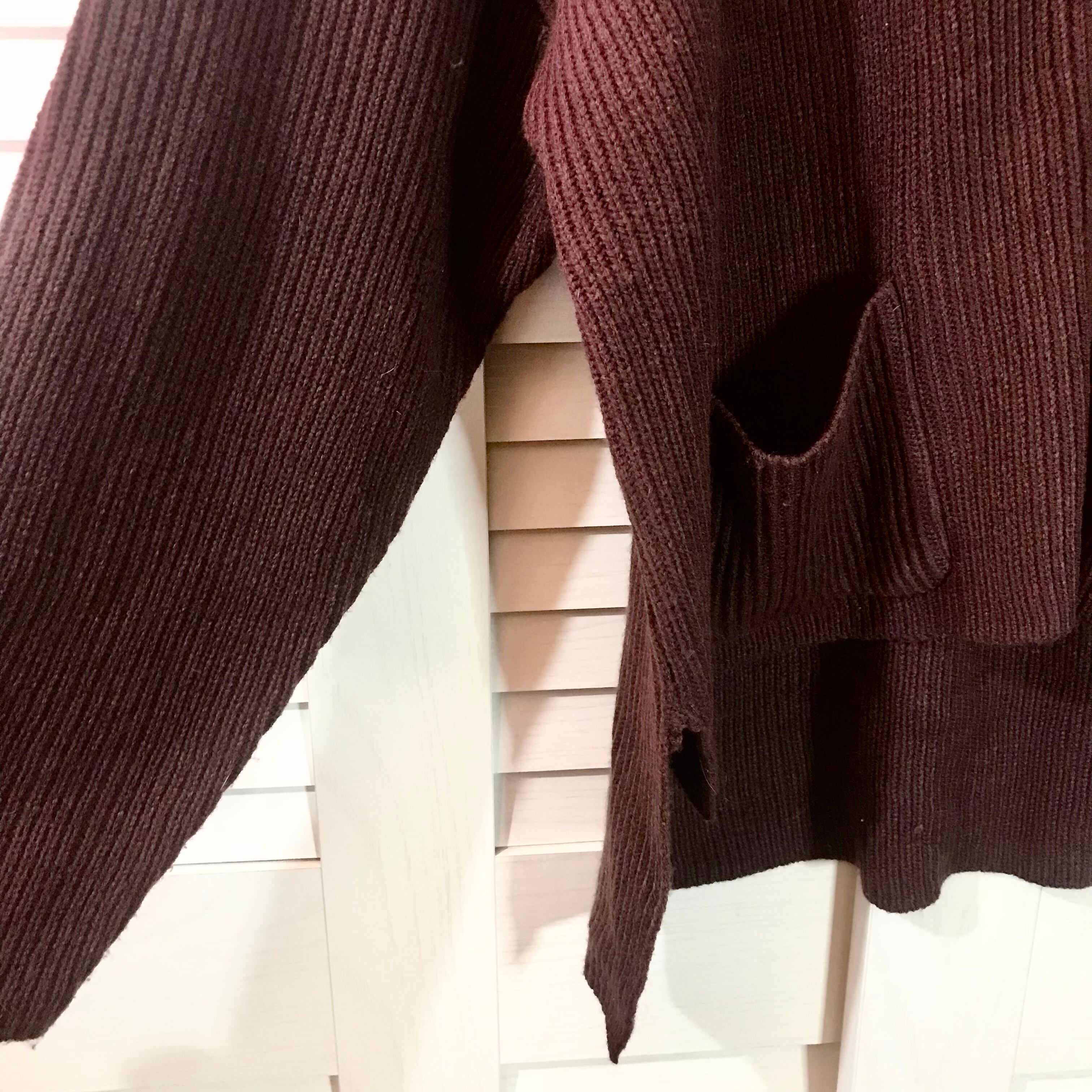 merlot 前上がりデザインのリブニットカーデ ブラウン