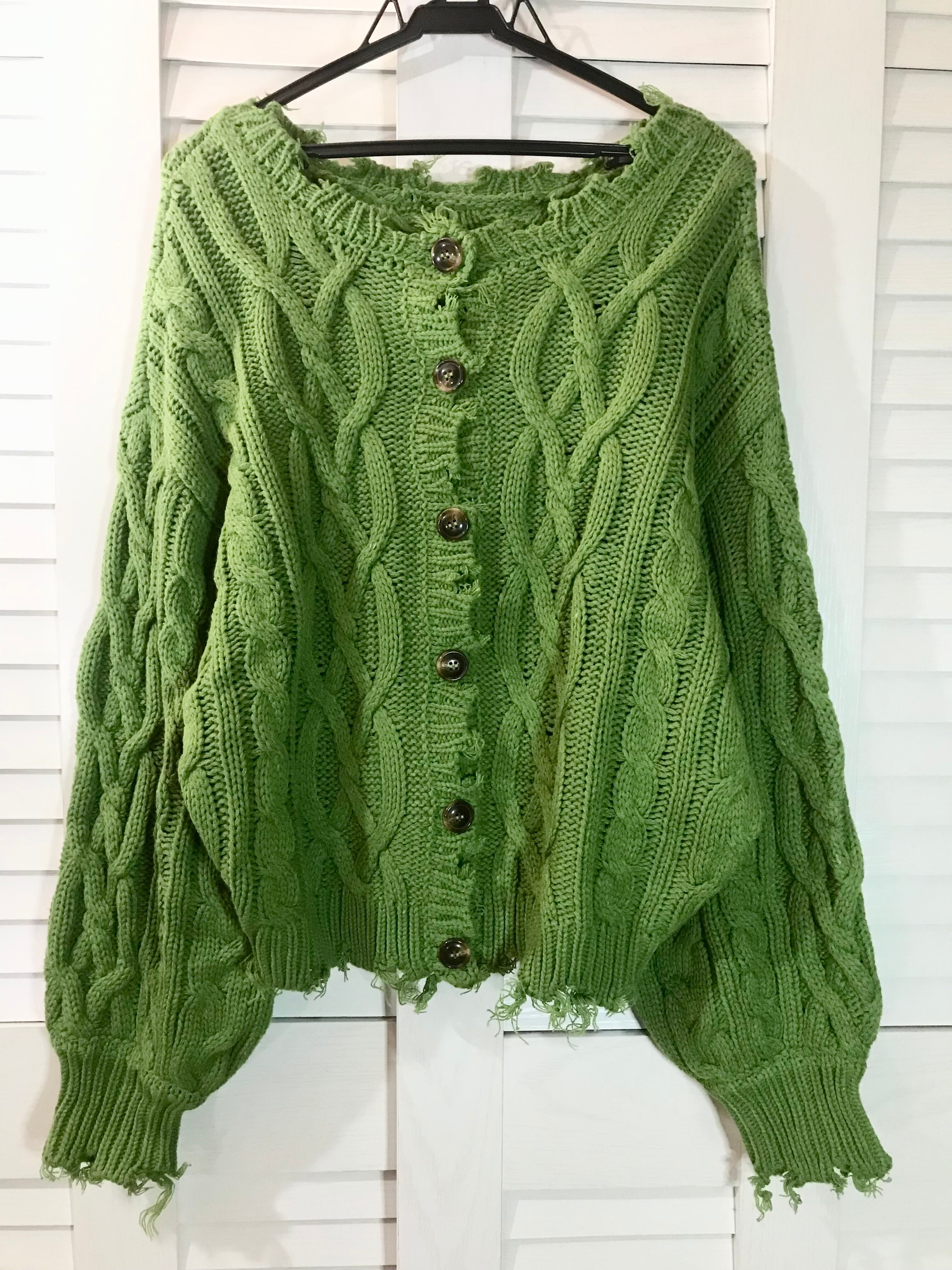 apres jour mignon ズタボロ キャンディスリーブアラン模様ニットカーデ キミドリ