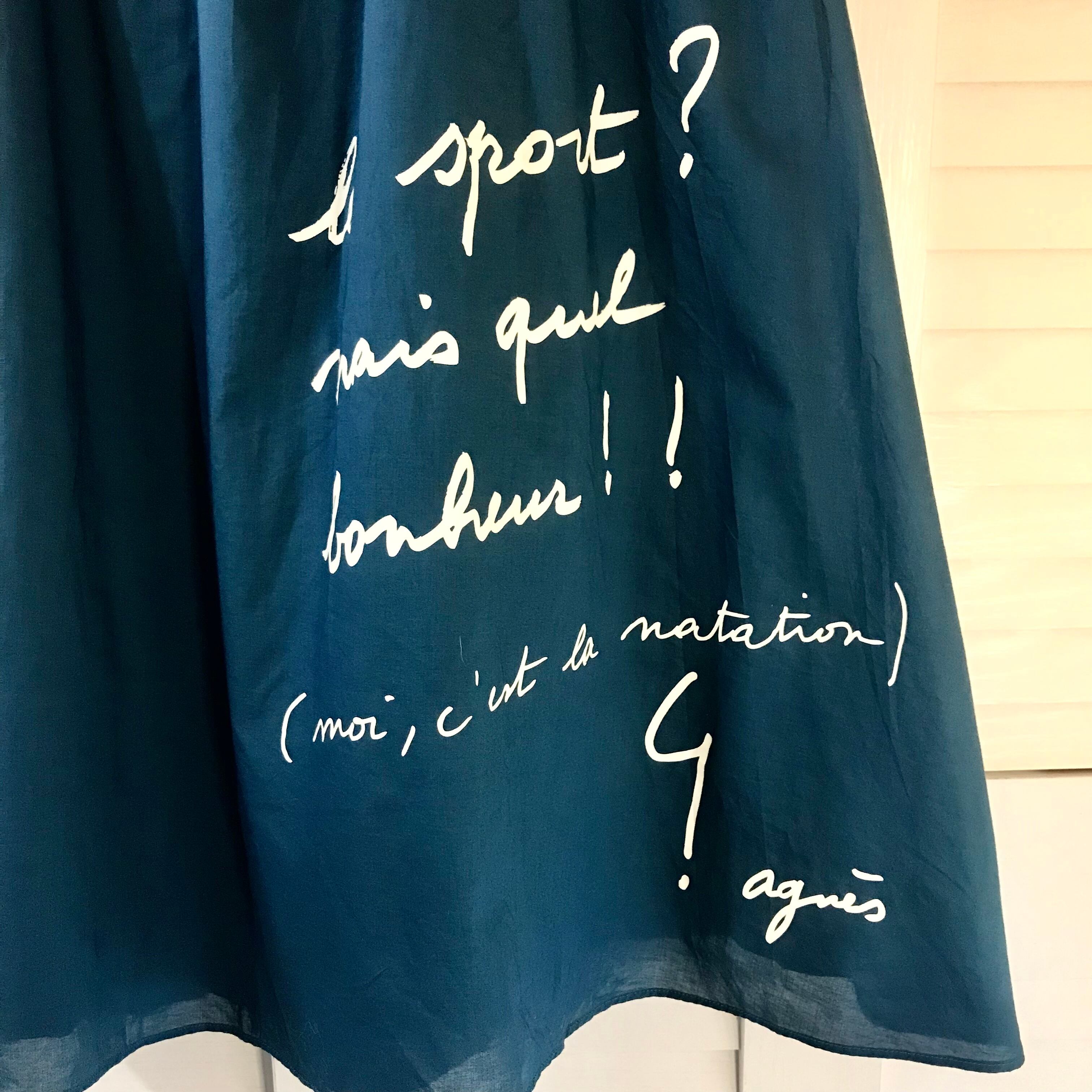 agnies b. 定価2万!ベルト付きダブルコットンのメッセージフレアースカート ブルー