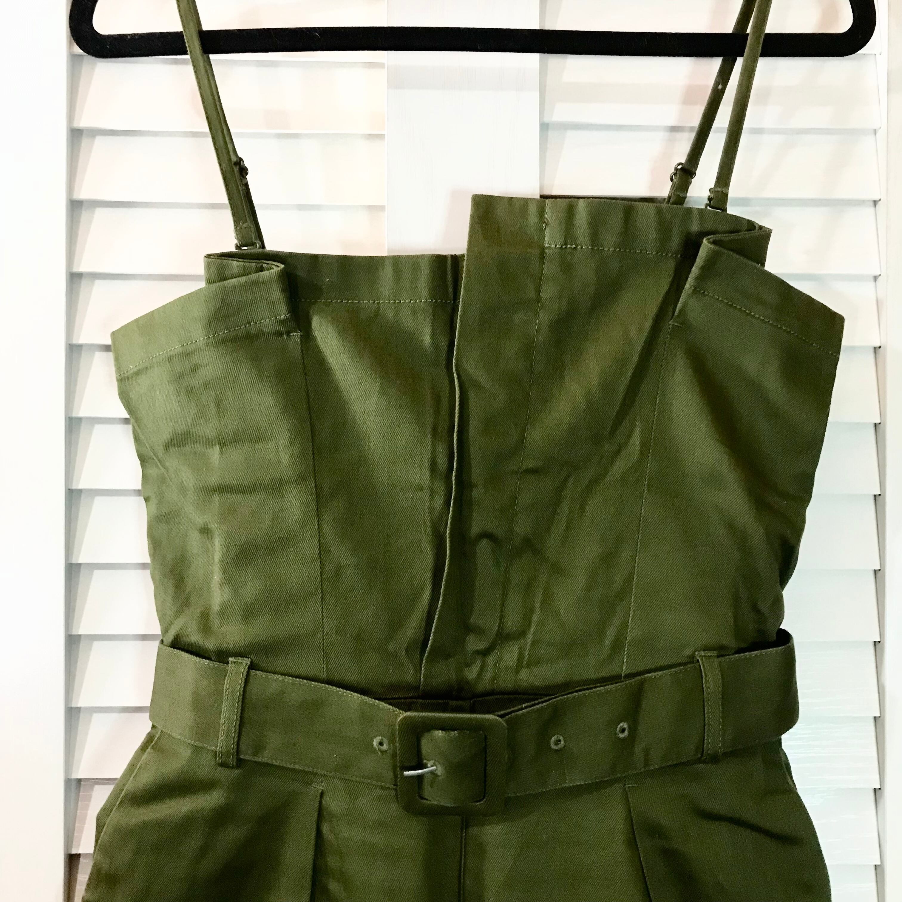 KBF ストレッチチノクロスの変形タックサロペットパンツ 共布ベルト付き カーキ