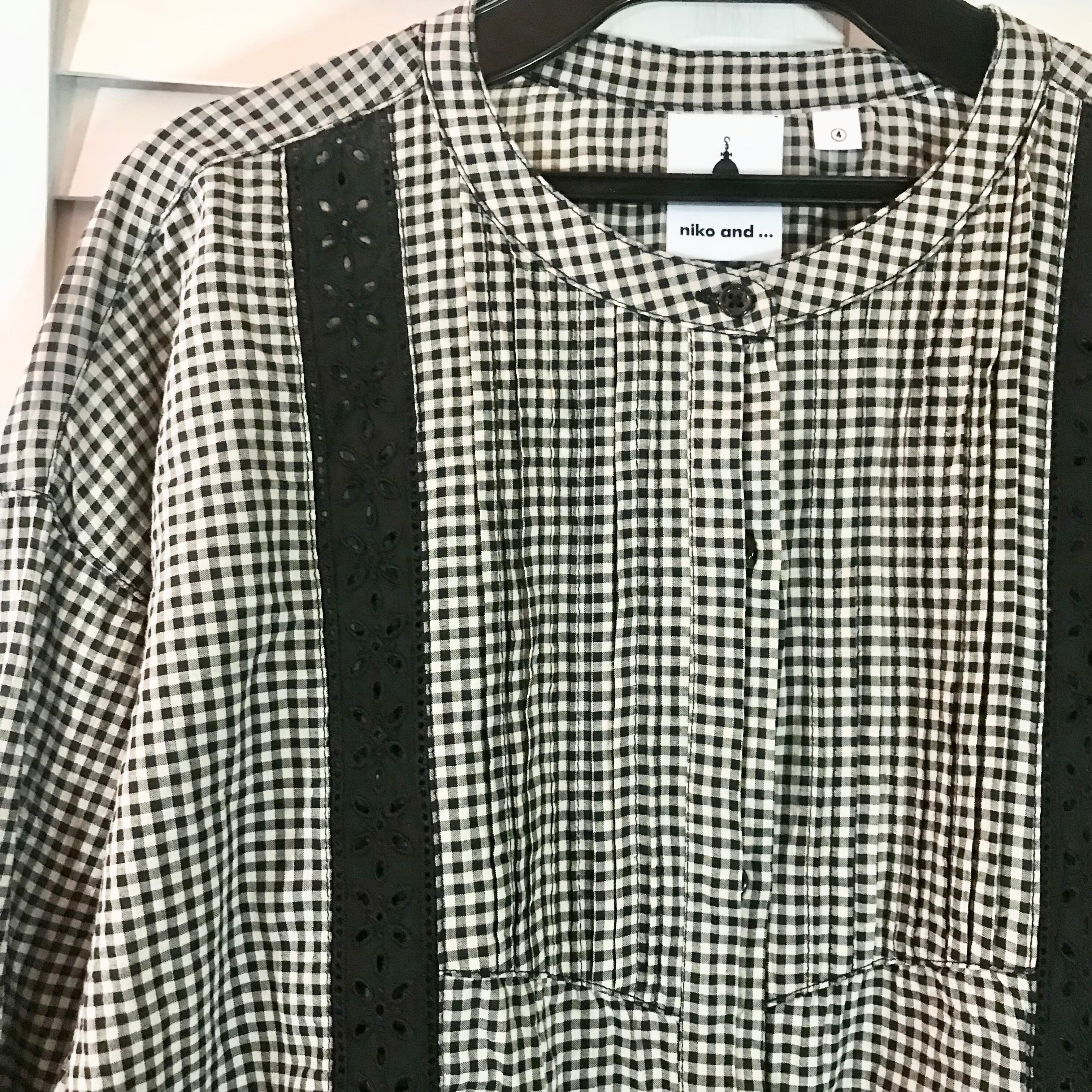 niko and… ギンガムチェック×ブラックレースのピンタックバルーンスリーブブラウス ブラック