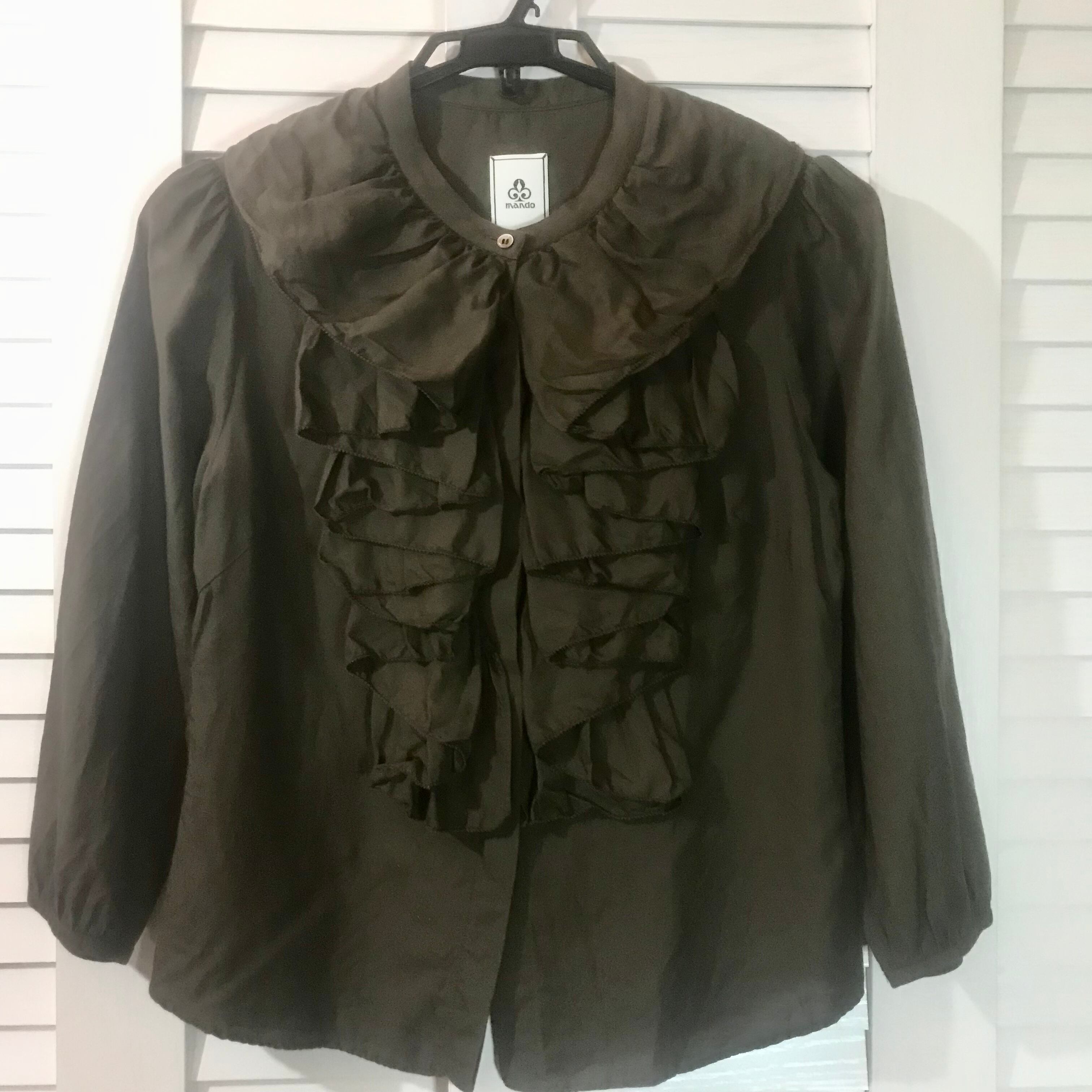 mando ミドルネックのドレープフリルコットンブラウス カーキ