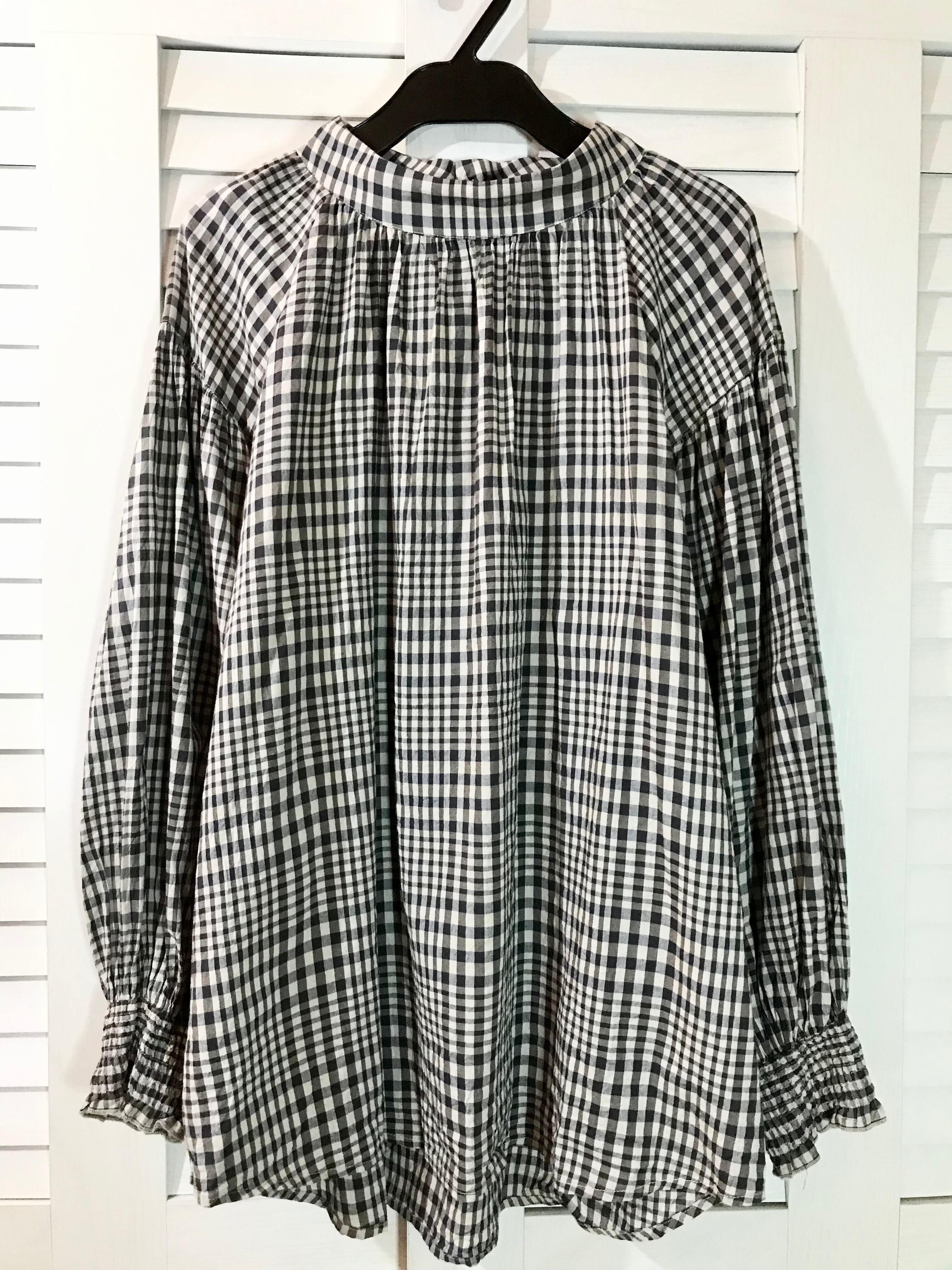 GLOBAL WORK ミドルネック ボリュームスリーブチェックブラウス ブラック×ブルー