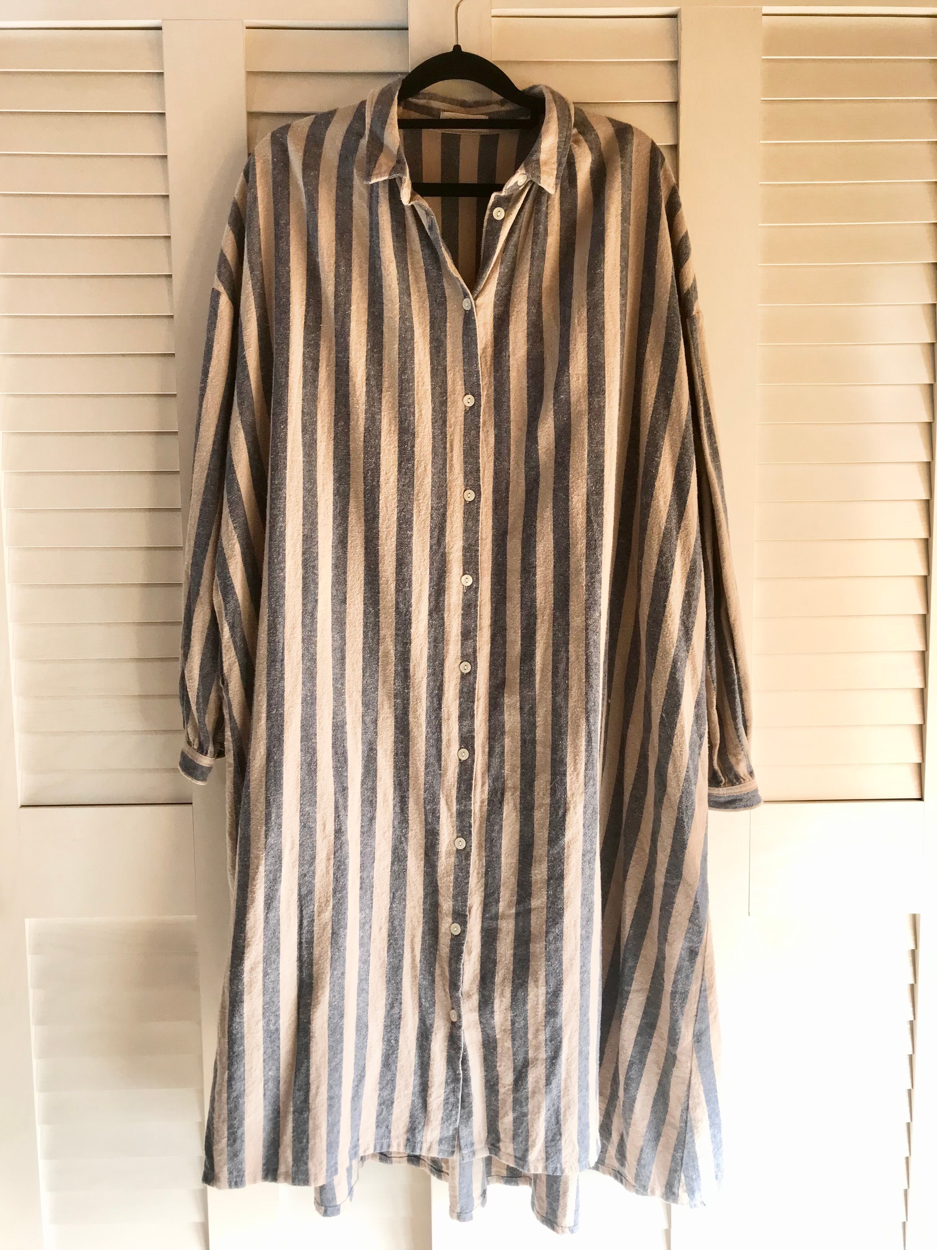 Samansa mos2 リネン混フランネル素材のストライプボリュームシャツワンピ インディゴ×ページュ