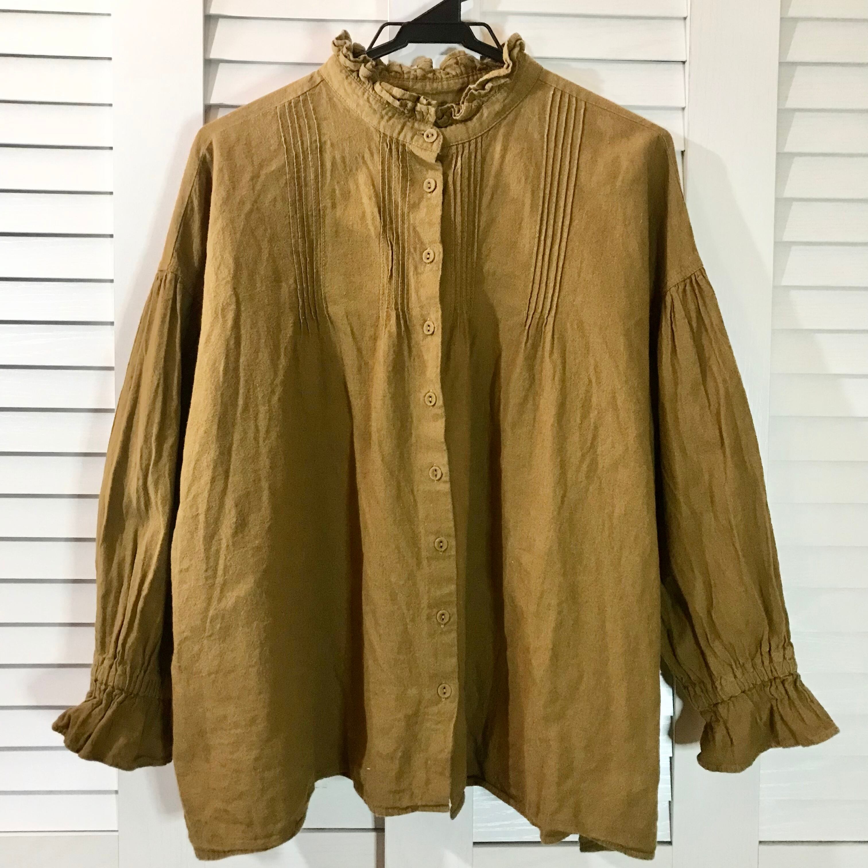 Samansa mos2 リネン混ミドルネックのキャンディースリーブ ピンタックボリュームブラウス ゴールドベージュ