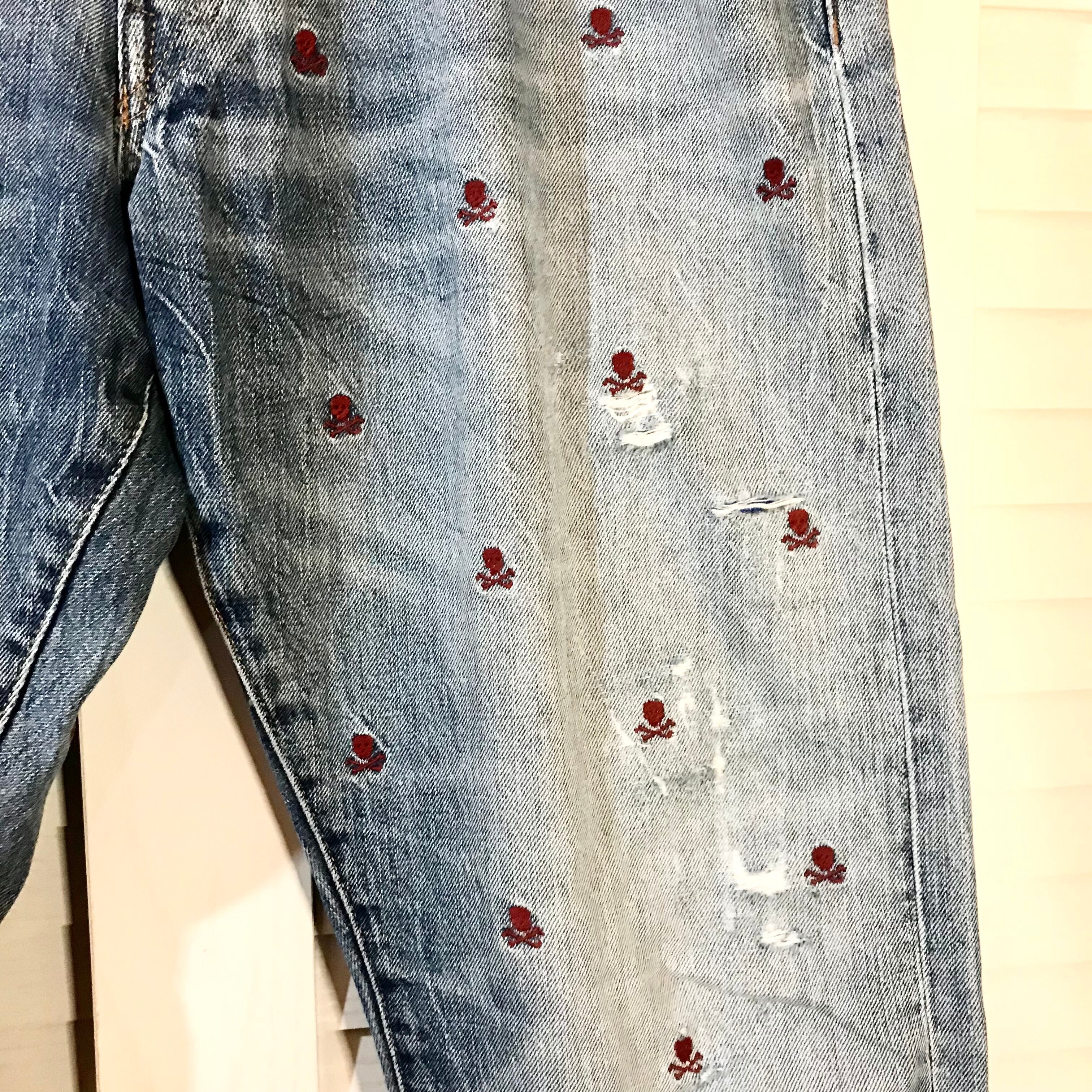 Polo RALPH LAUREN レア!USEDダメージ加工 ドクロ刺繍柄ルーズストレートジーンズ