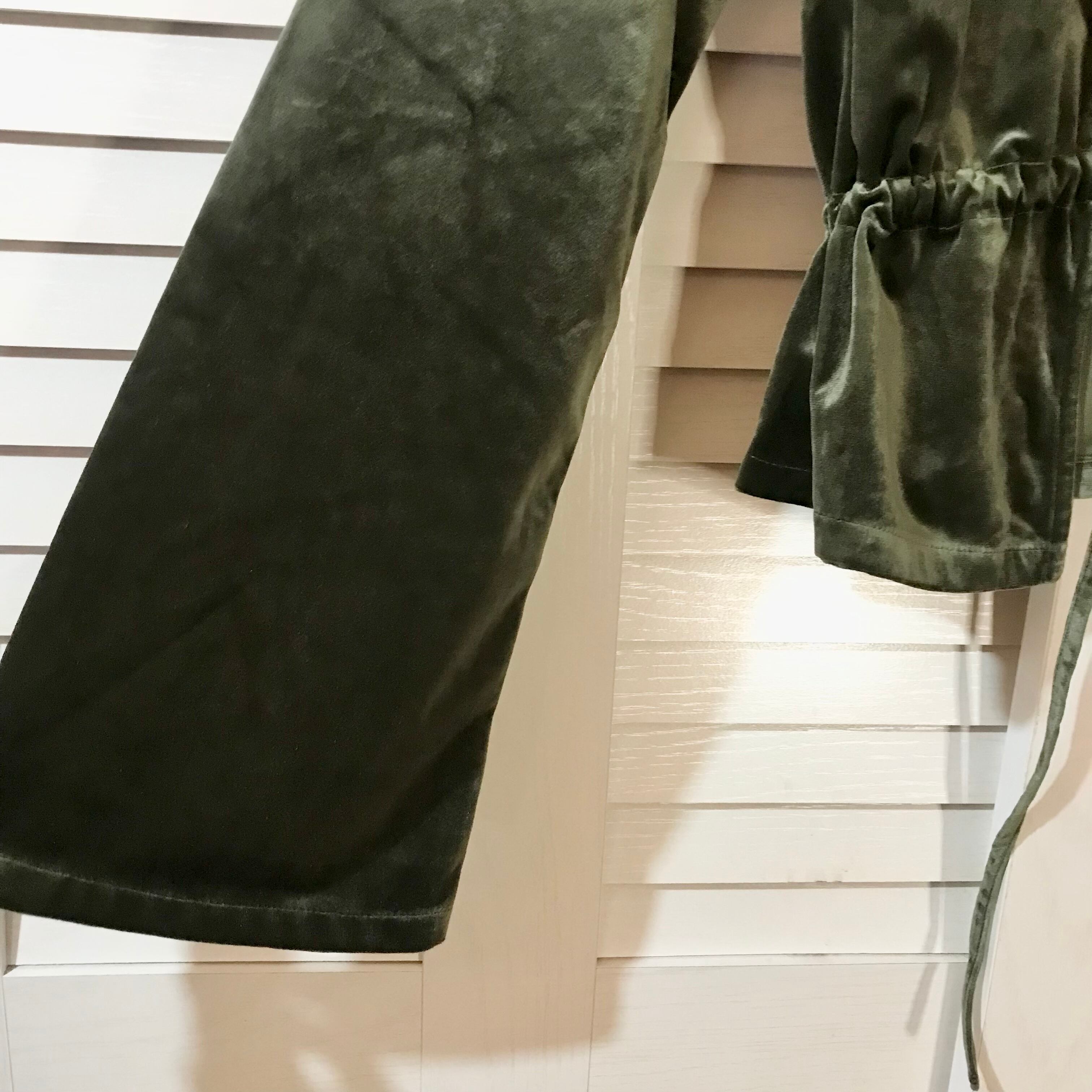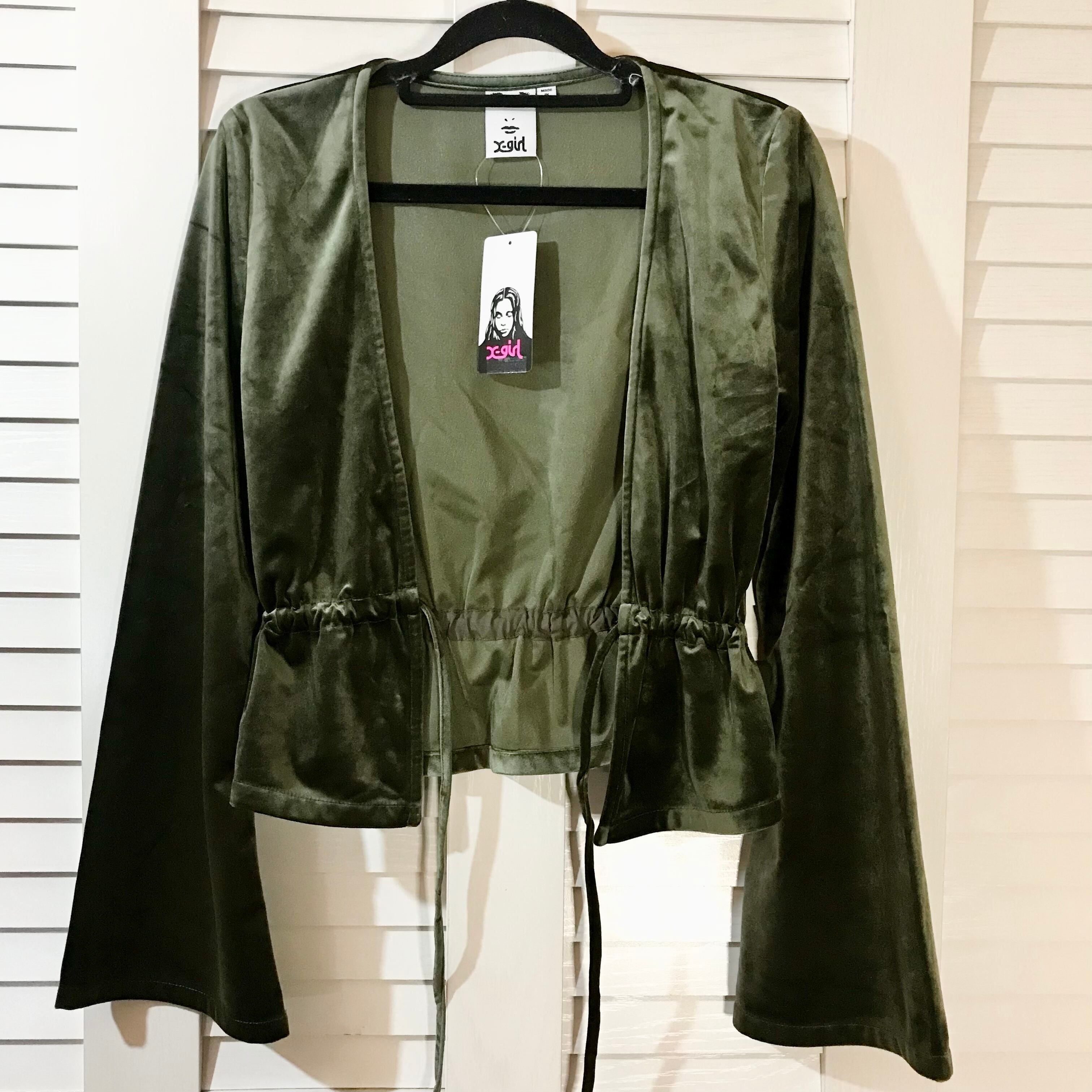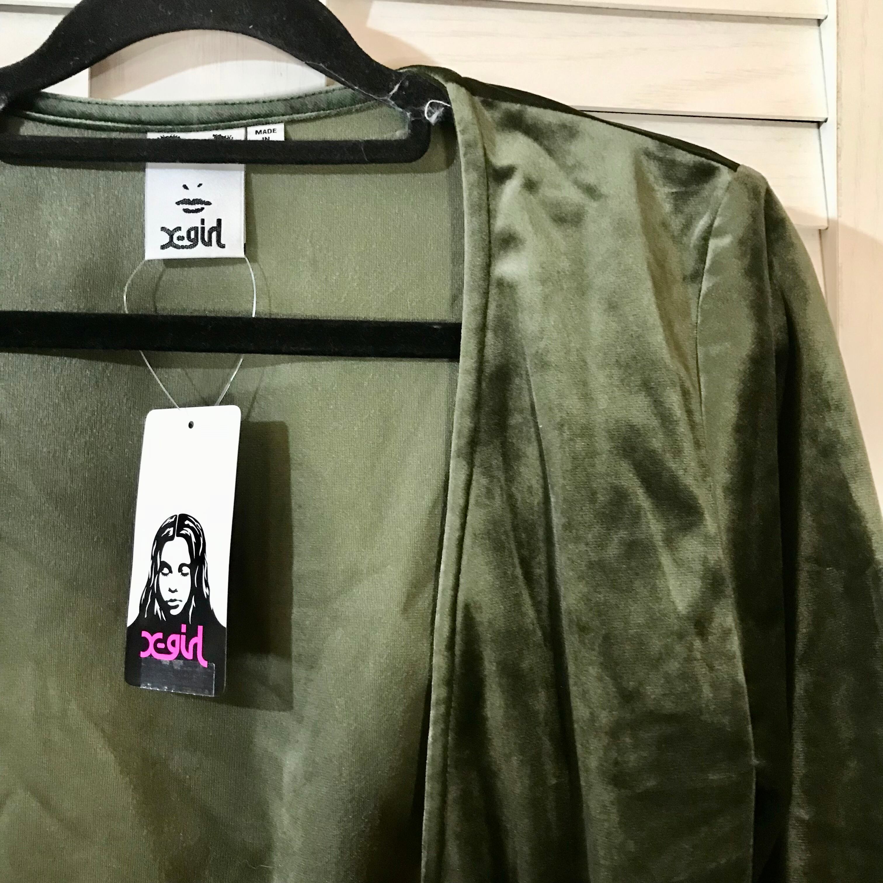 X-girl フレアースリーブ ベロアショート丈カーデ カーキ