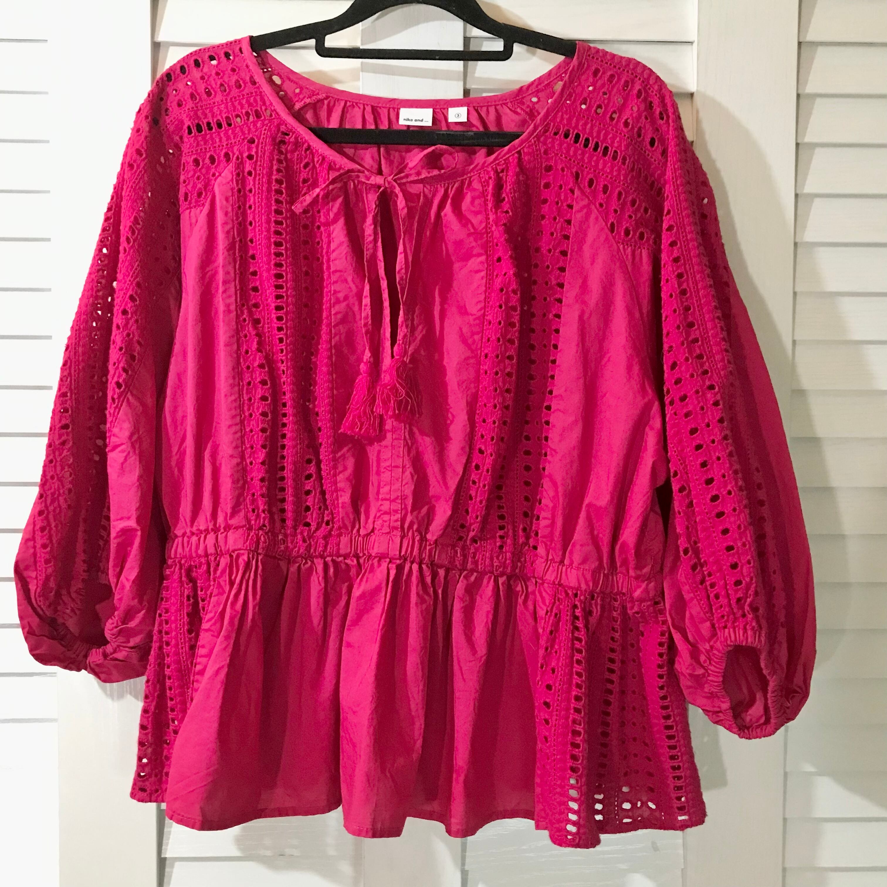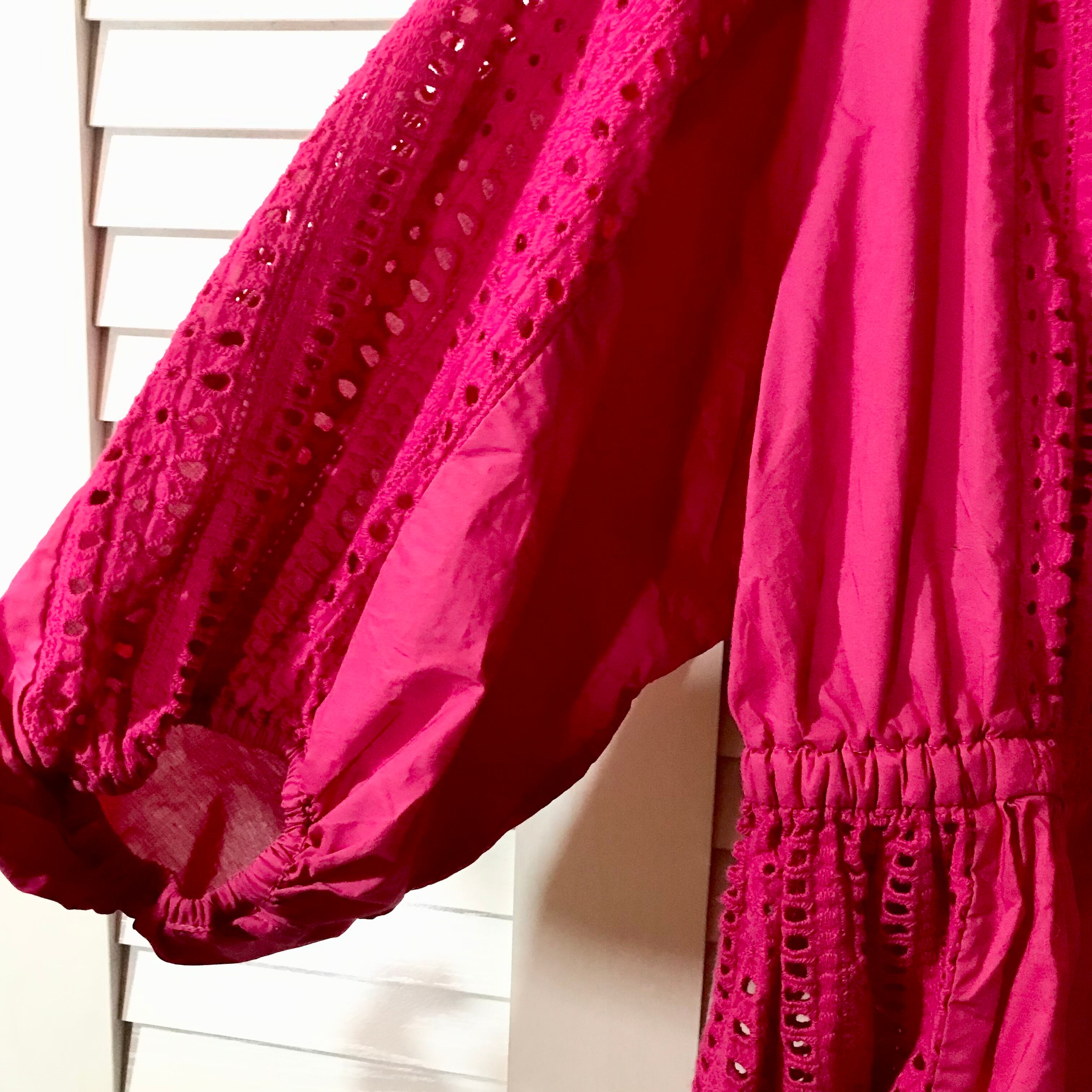 niko and… ショッキングピンクのラグランボリュームスリーブ カッティングレースコットンチュニックブラウス