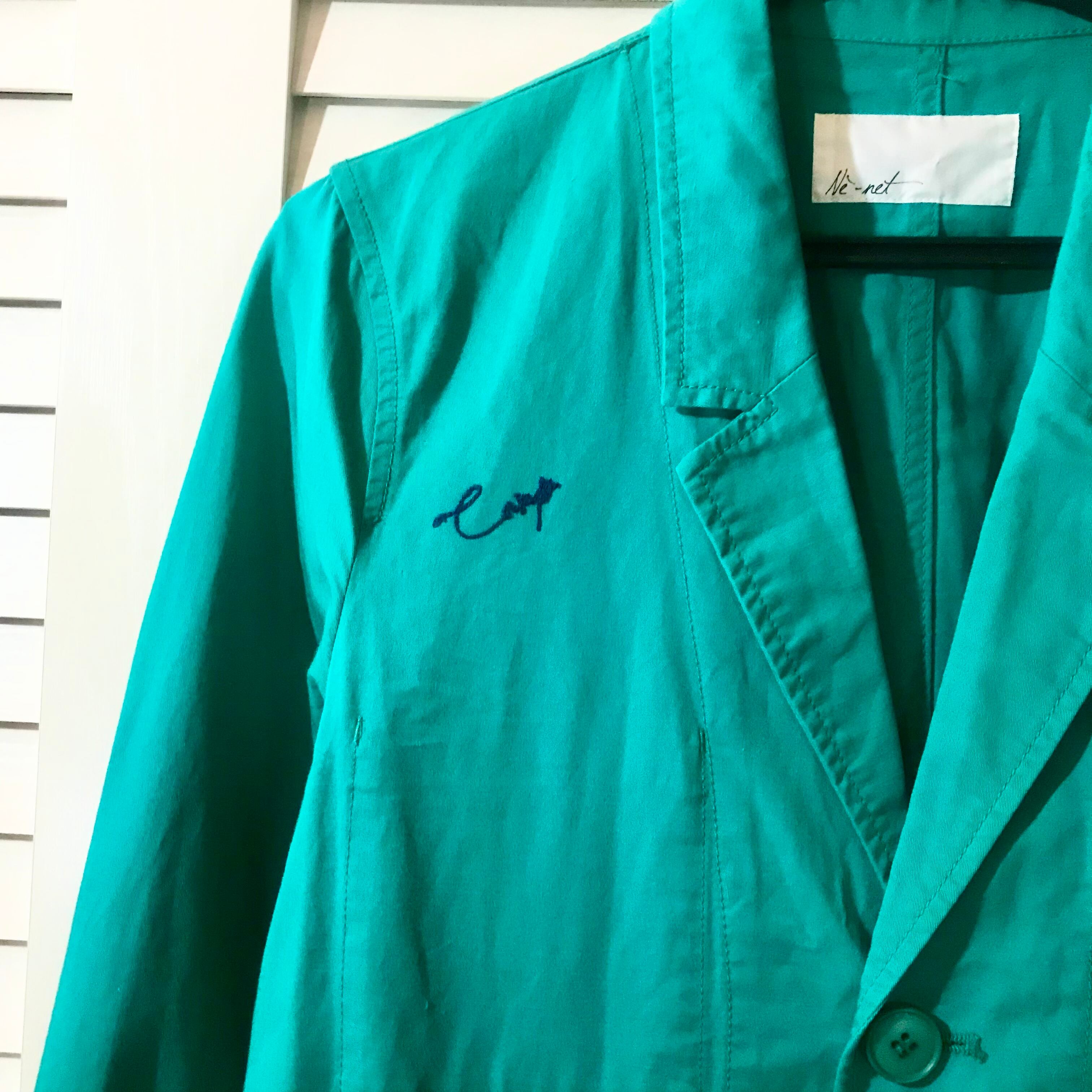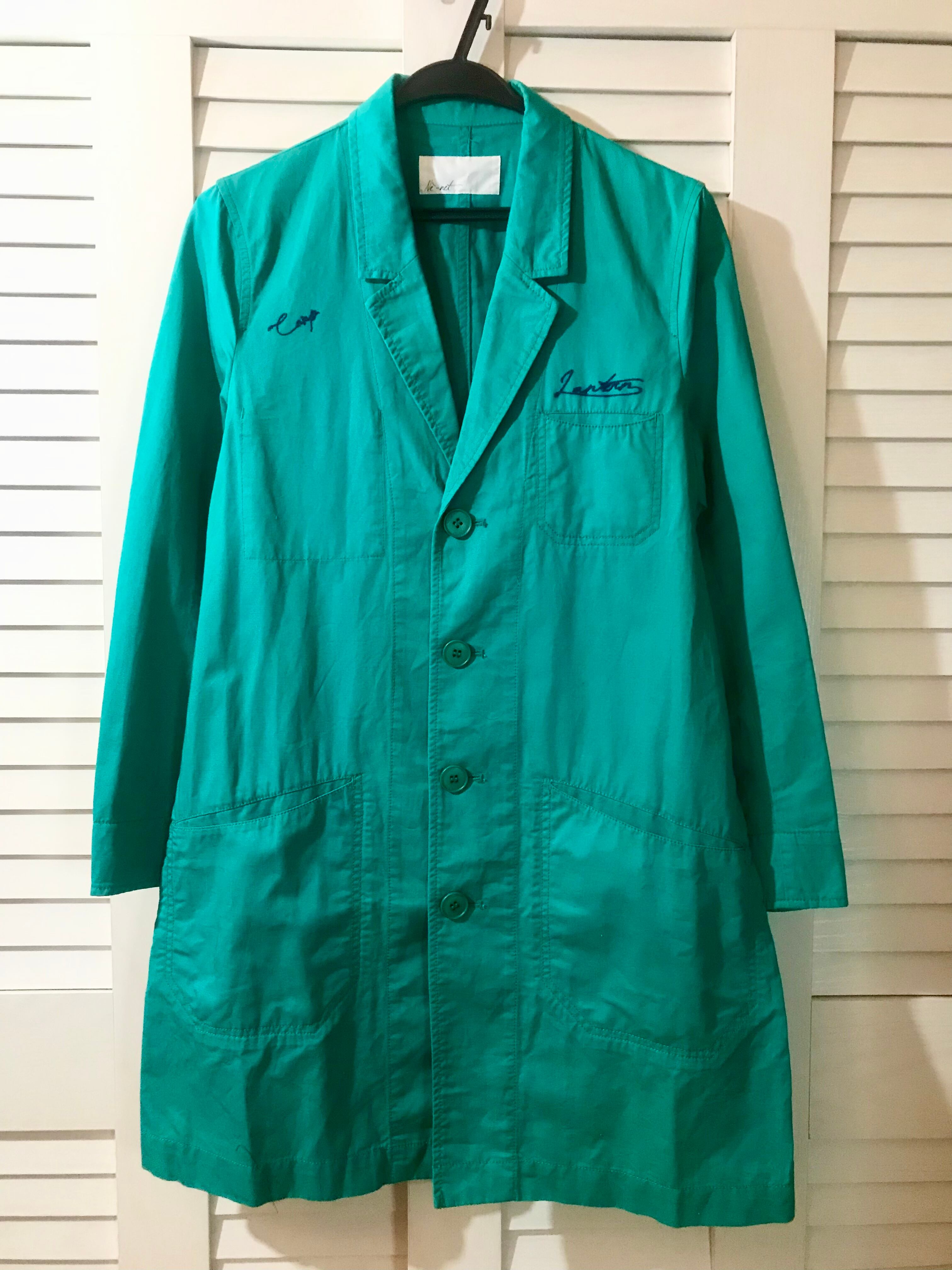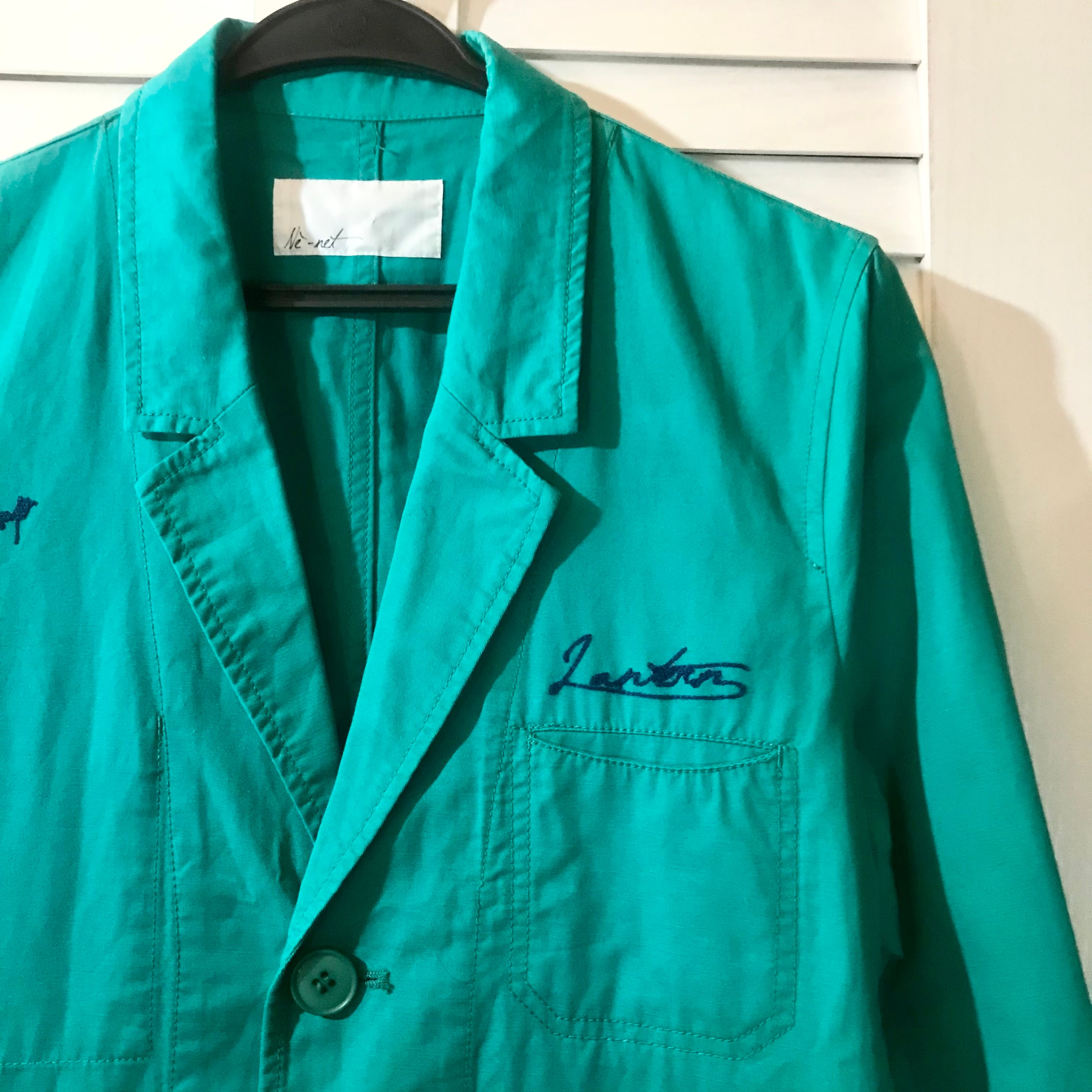Ne-net ポイント刺繍 コットンリネン テーラードチェスターコート エメラルドグリーン