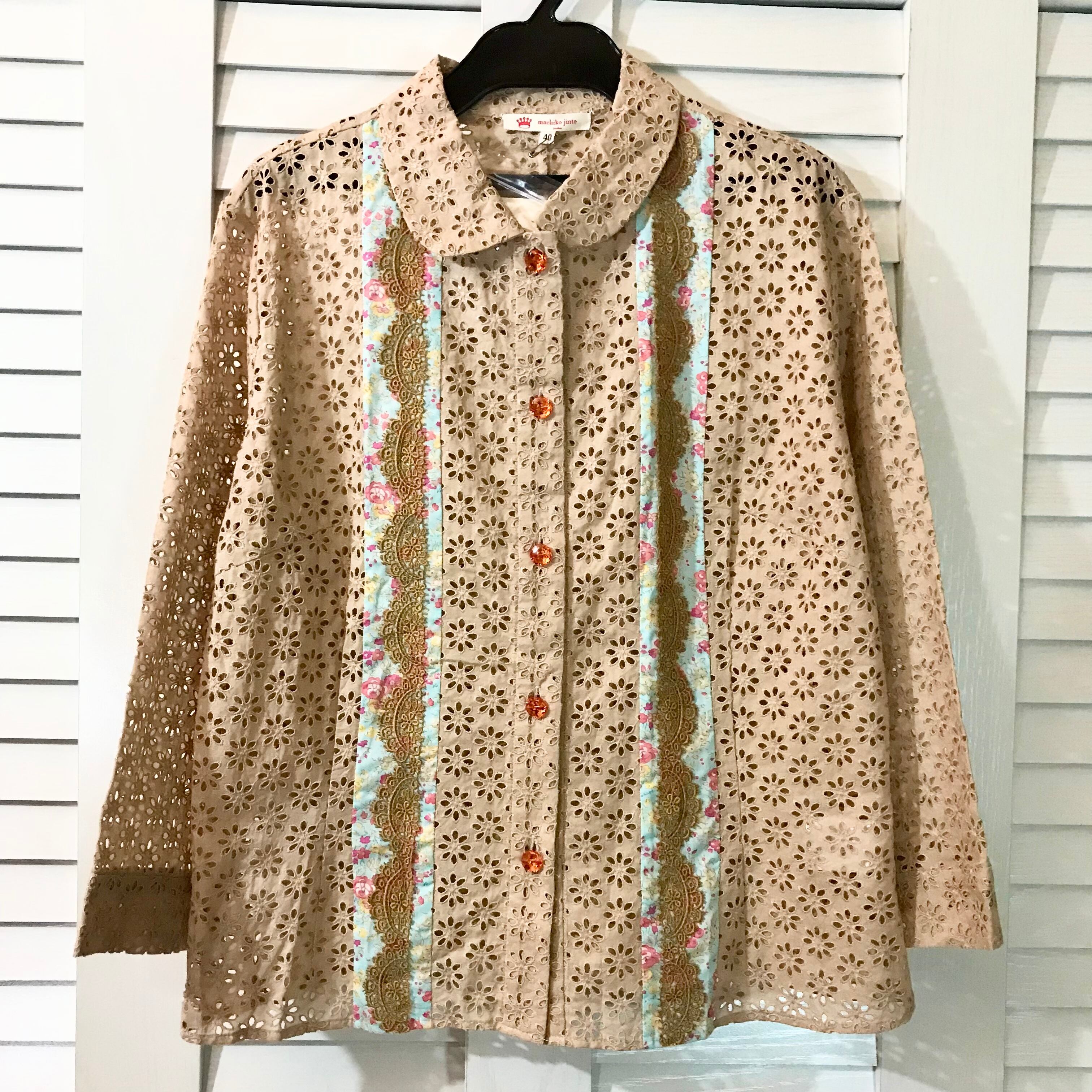 machiko jinto 1点物!オーダーメイドブラウス カッティングレース地 クリスタルボタン アメリカンファブリック&アンティークレース使い ベージュ