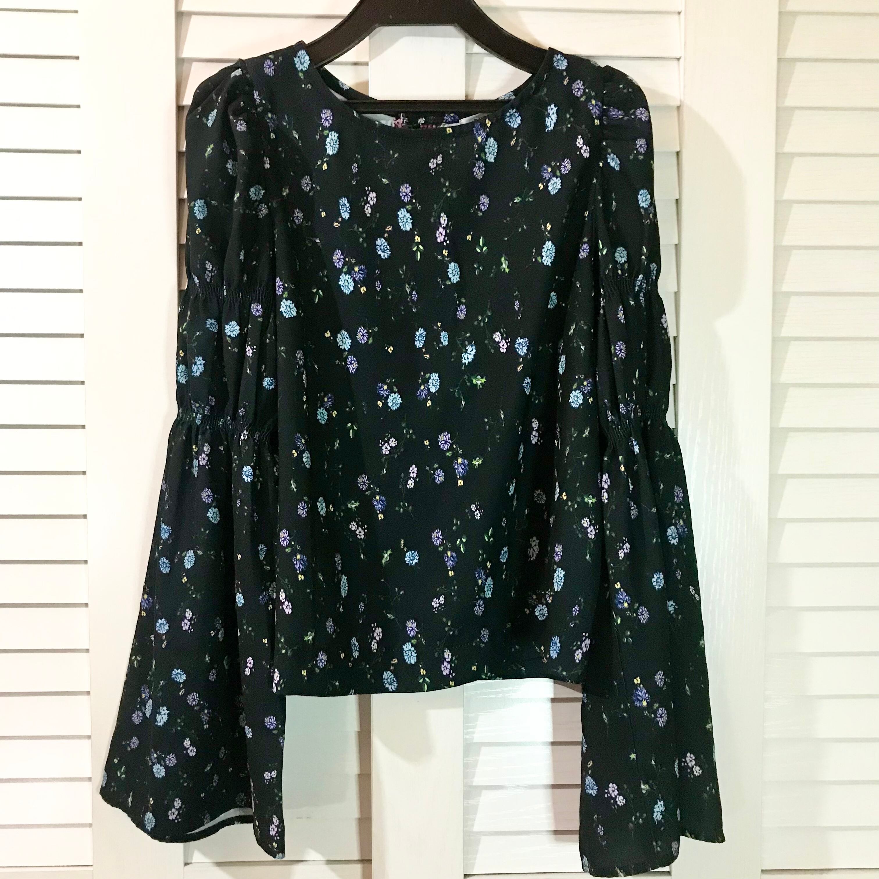 ROSE BUD フラワープリント シャーリングティアードスリーブブラウス ネイビー