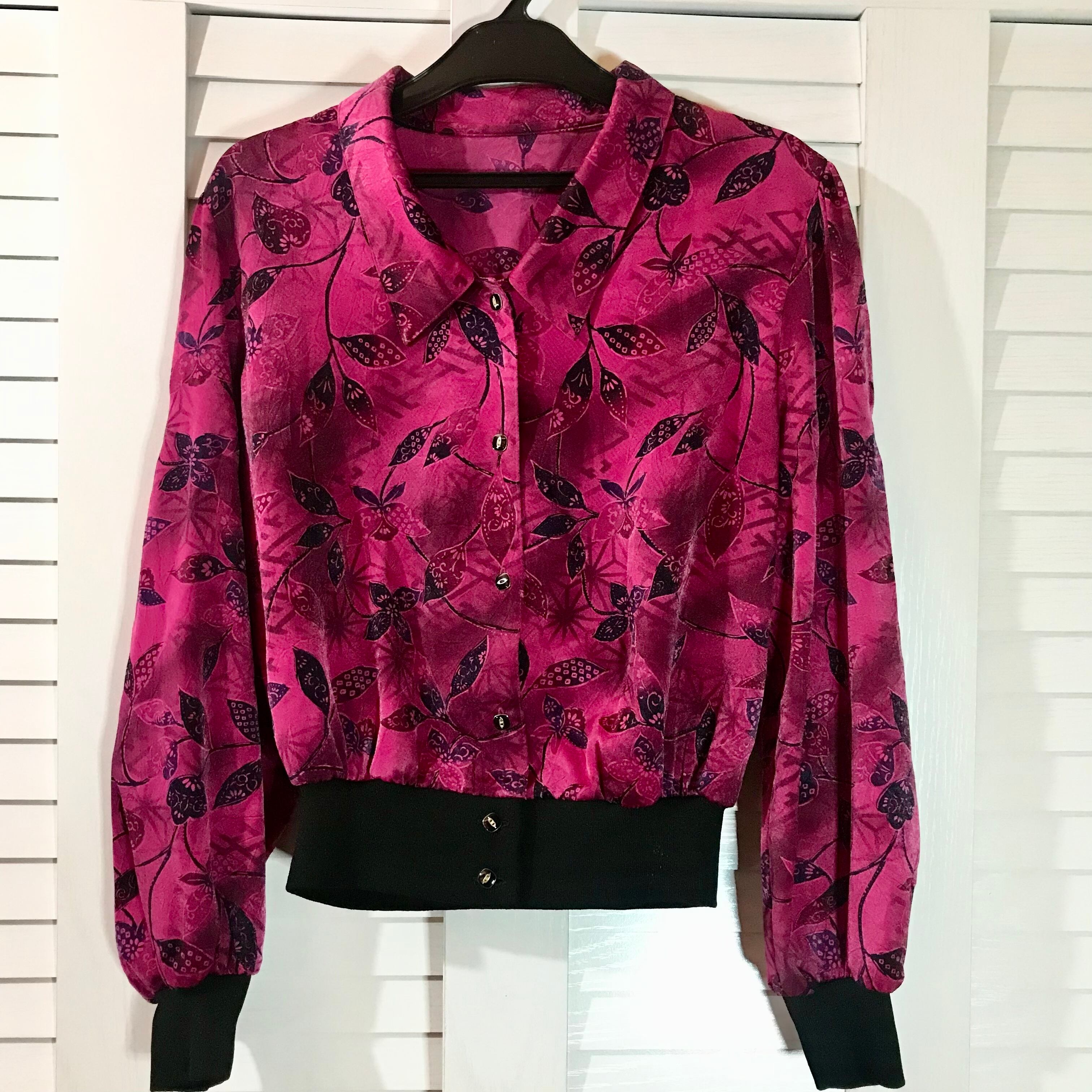 【国産古着】昭和レトロなハートリーフプリント サテンブラウス ピンクパープル | お洋服屋さん 『GOKKO』