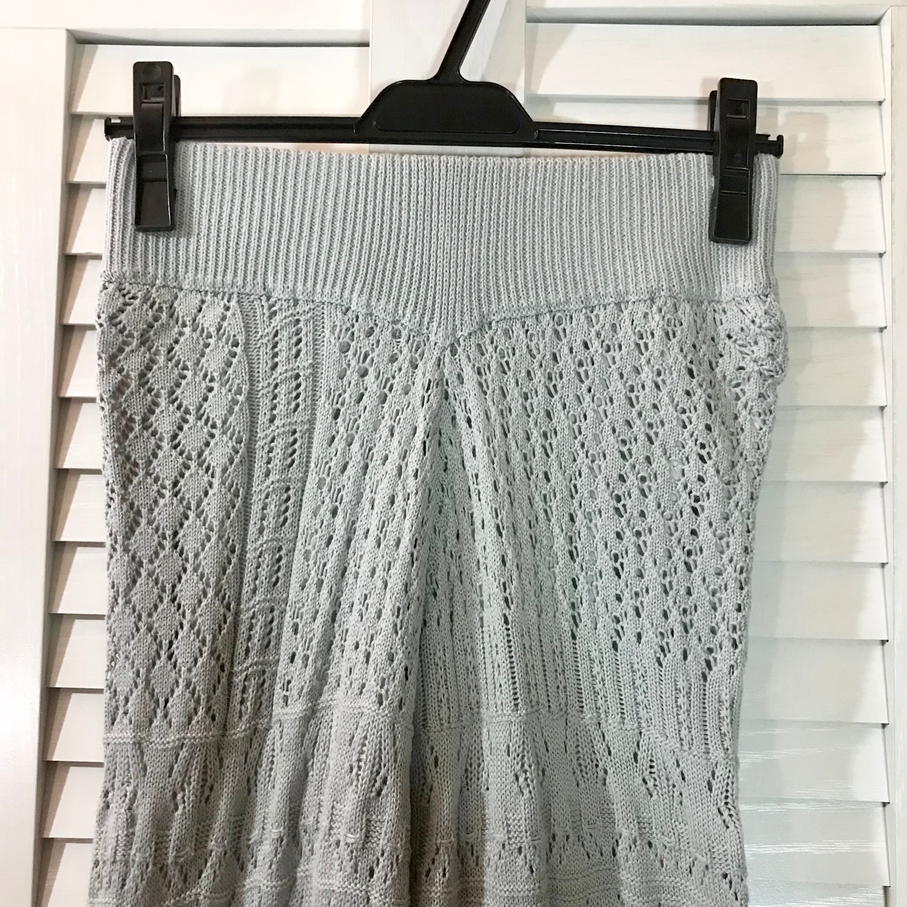 Chico アシンメトリー柄 透かし模様のコットンニットパンツ サックスブルー