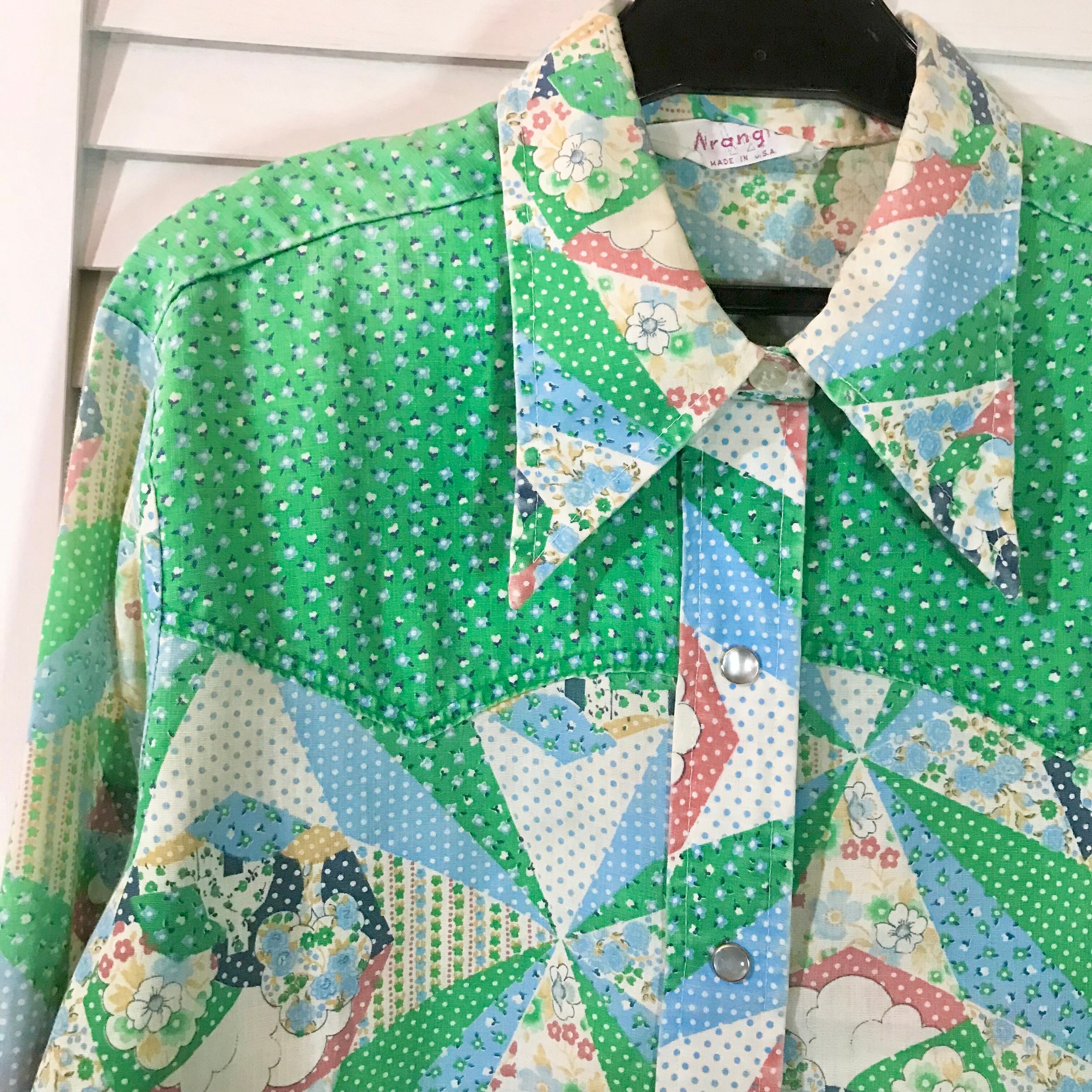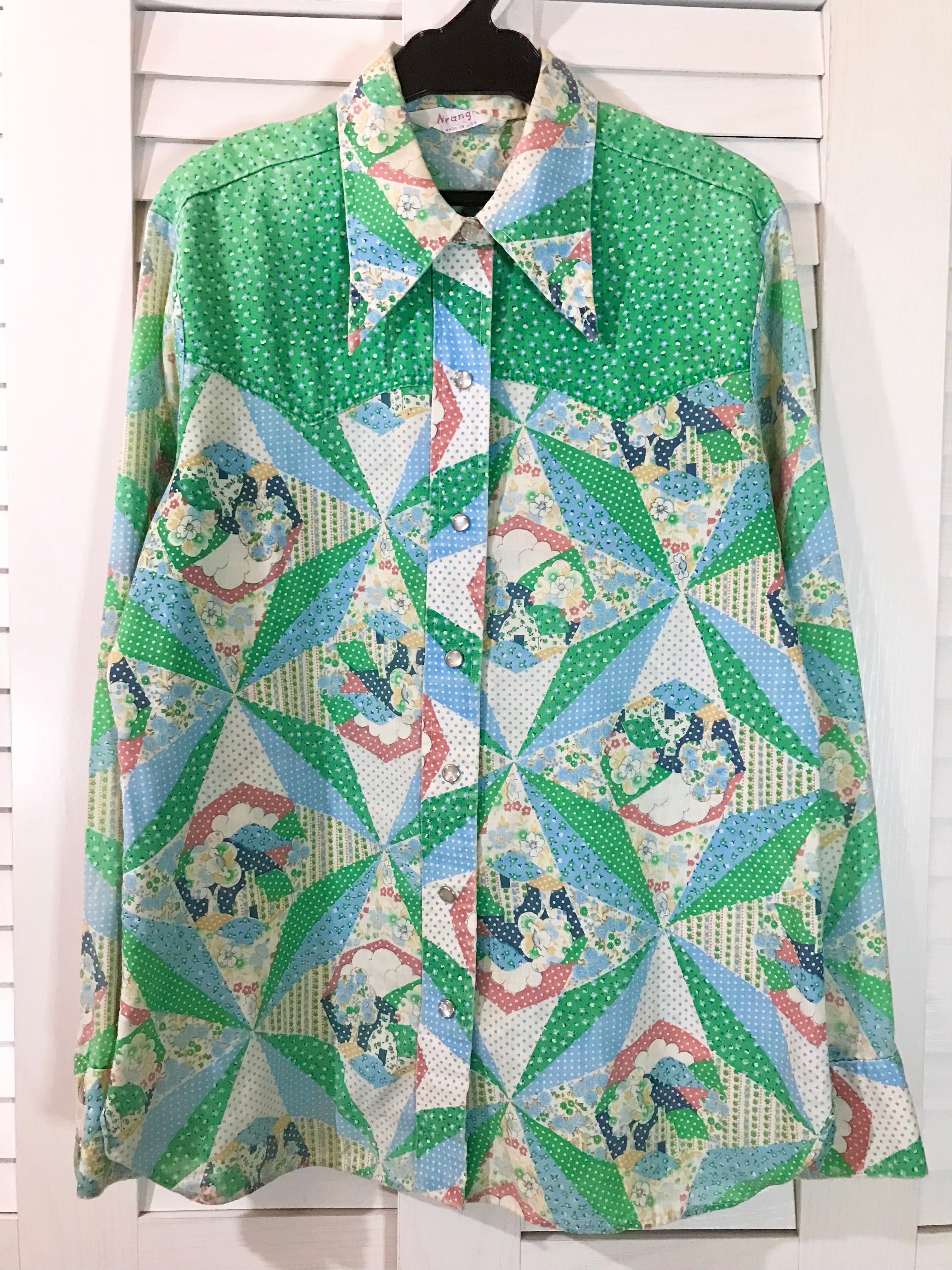 【古着屋購入】70S US古着USED パッチワークプリント ウエスタンシャツ グリーン