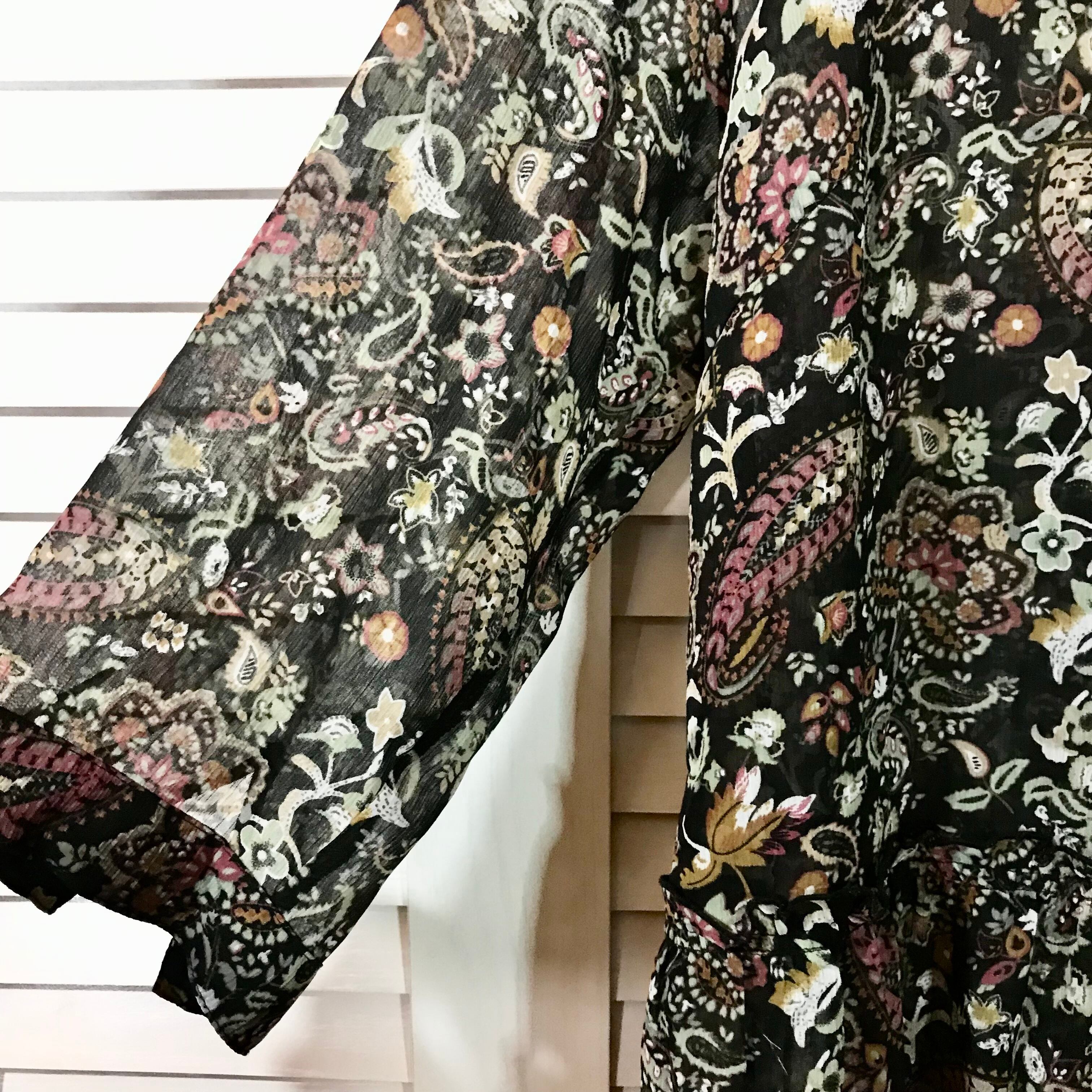 ELBONNY ヨーロピアン ボタニカルプリント シアー素材のティアードチュニックブラウス ブラック