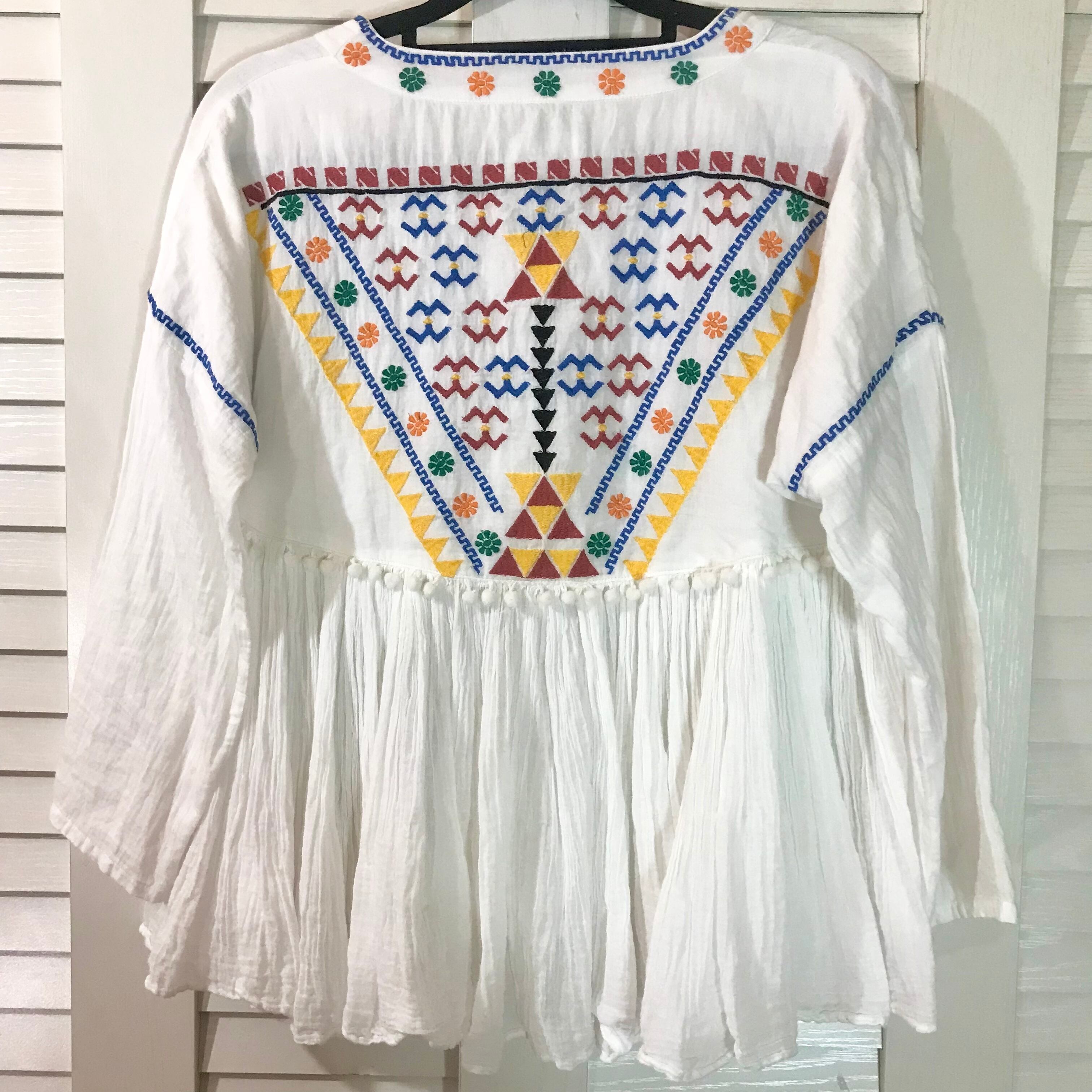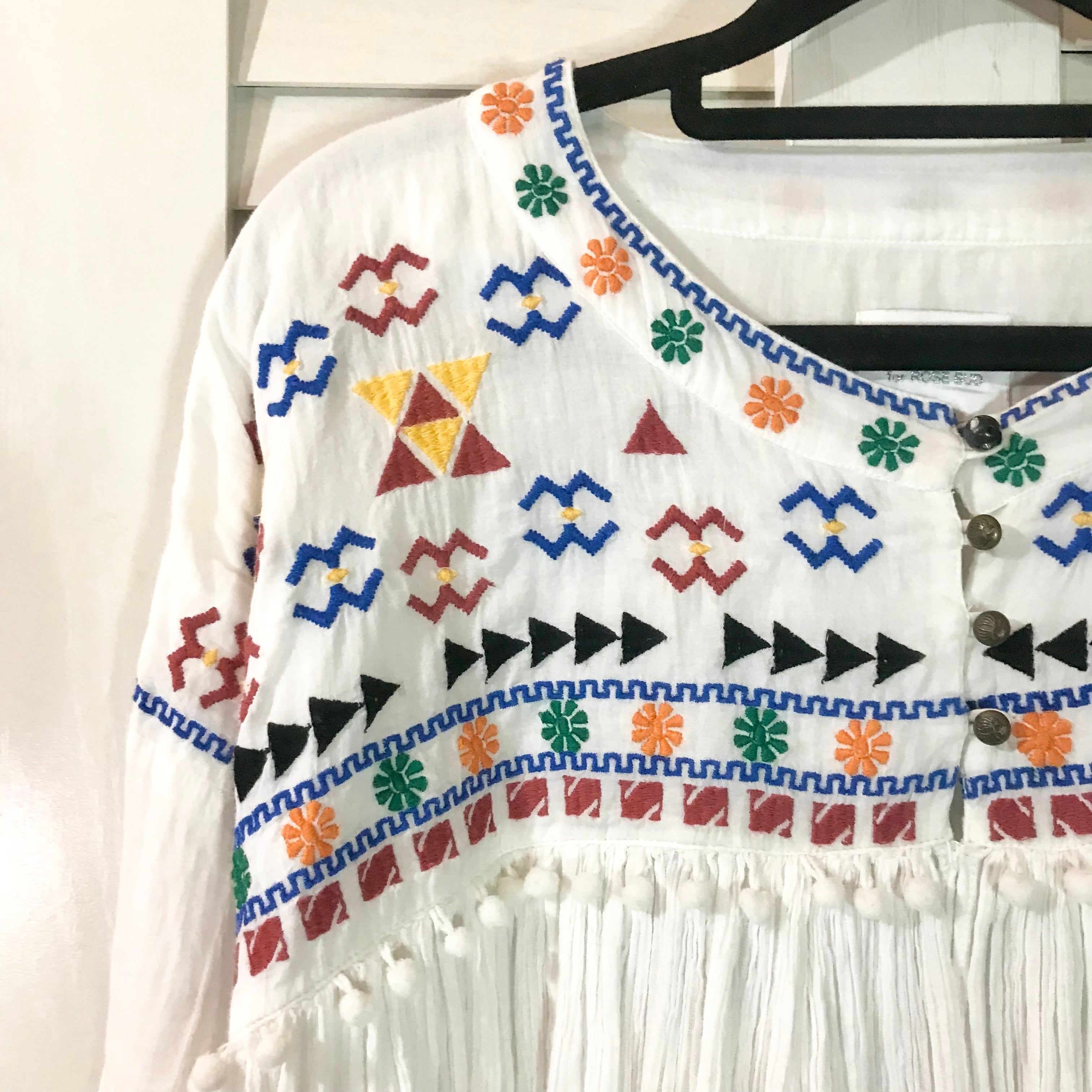 ROSE BUD カラフル幾何学刺繍 ポンポンブレード コットン楊柳チュニックブラウス オフホワイト