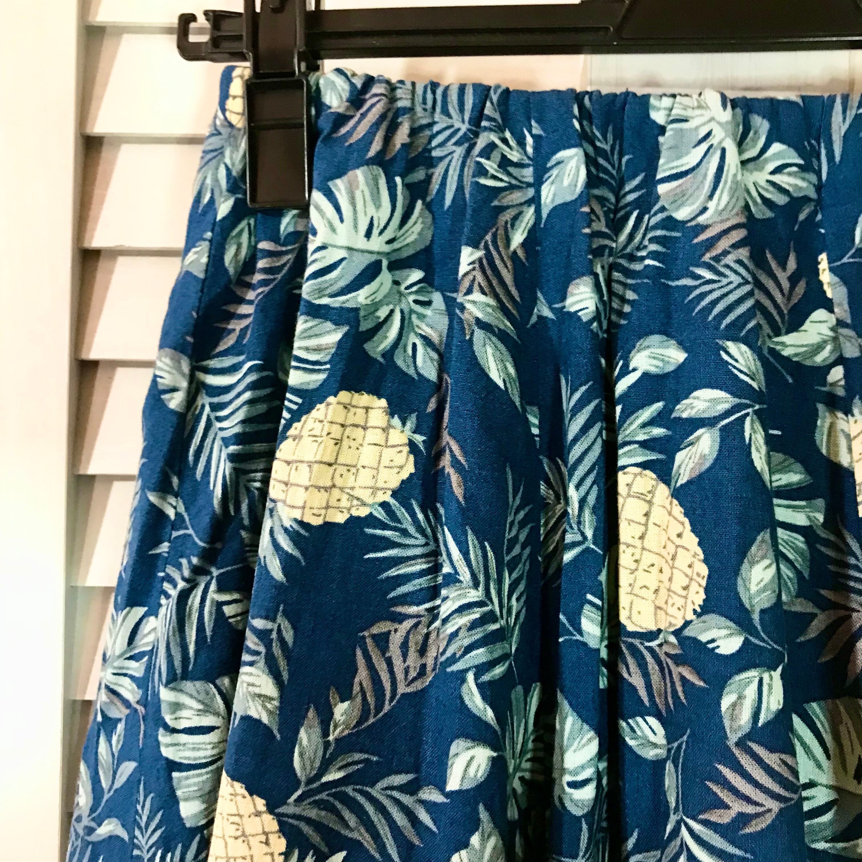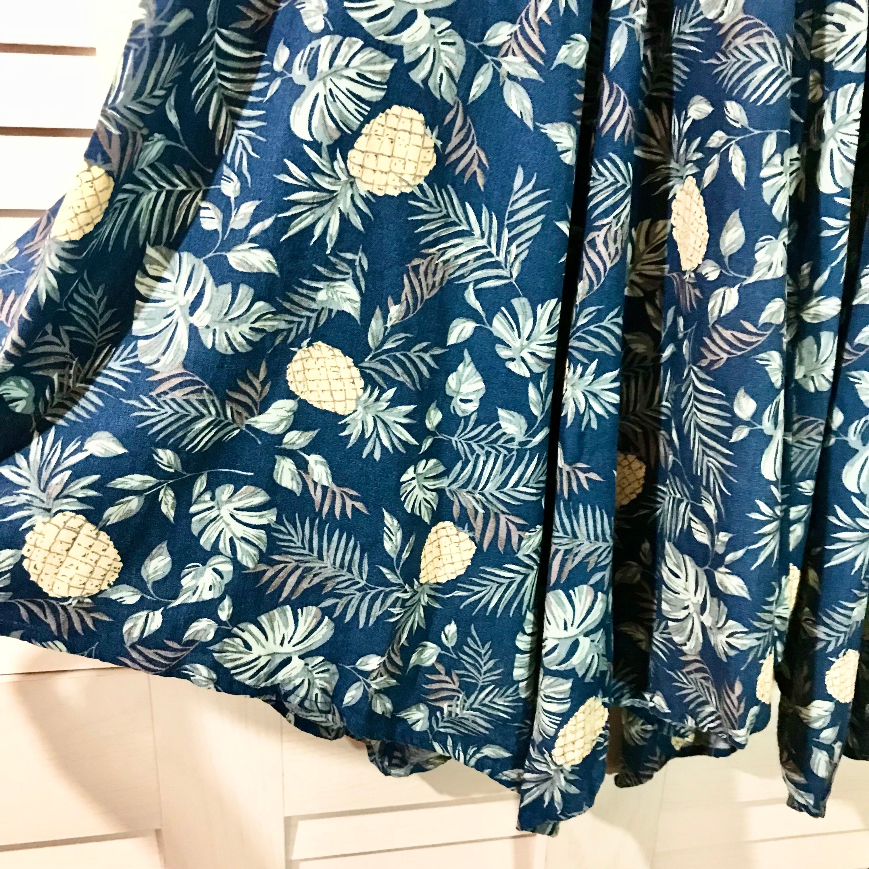 BEAMS ヴィンテージアロハ柄 イレギュラーヘムフレアーギャザースカート ネイビー