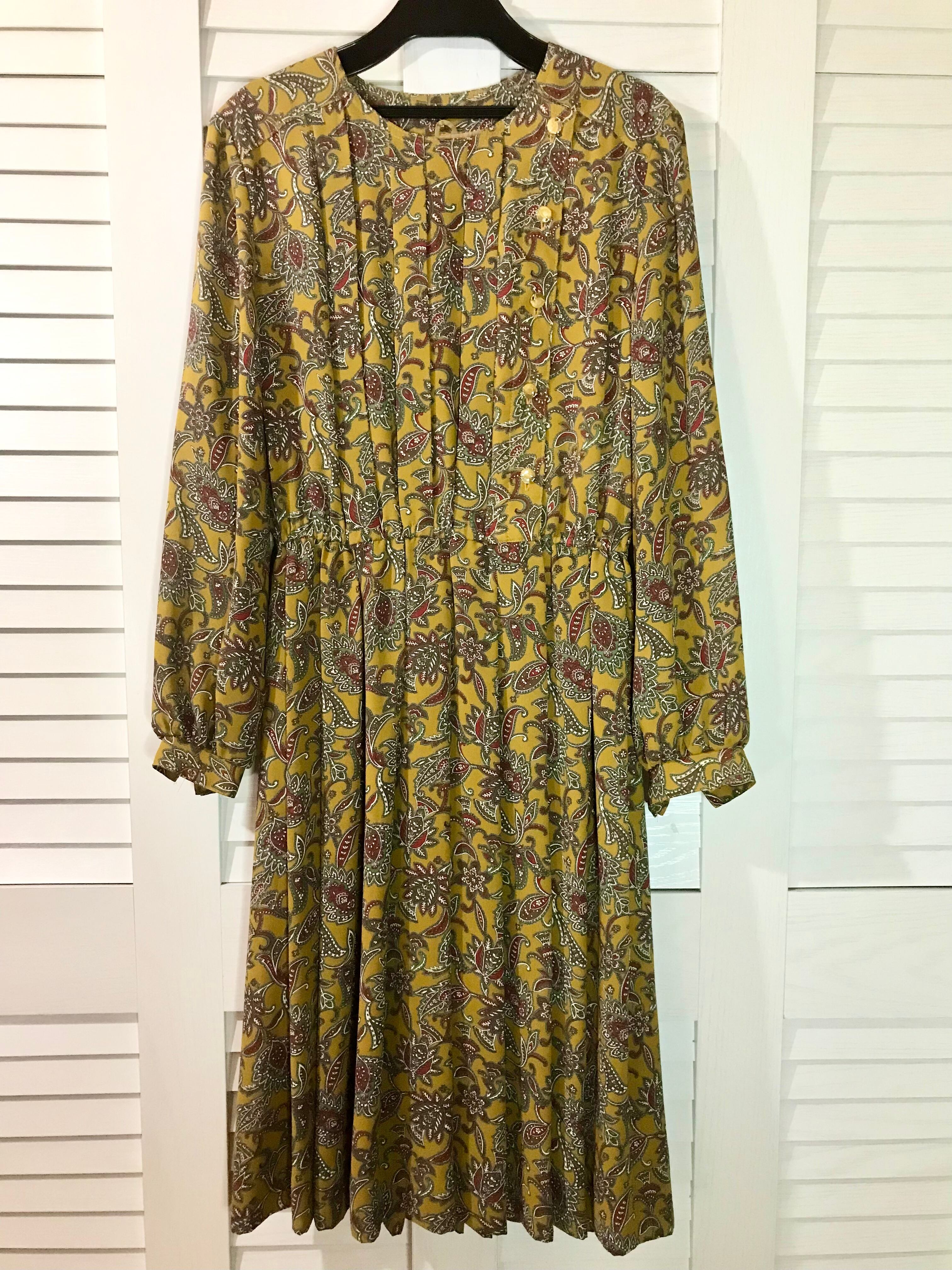 【国内古着】ヴィンテージ フラワーペイズリー 胸元プリーツデザインワンピ マスタード