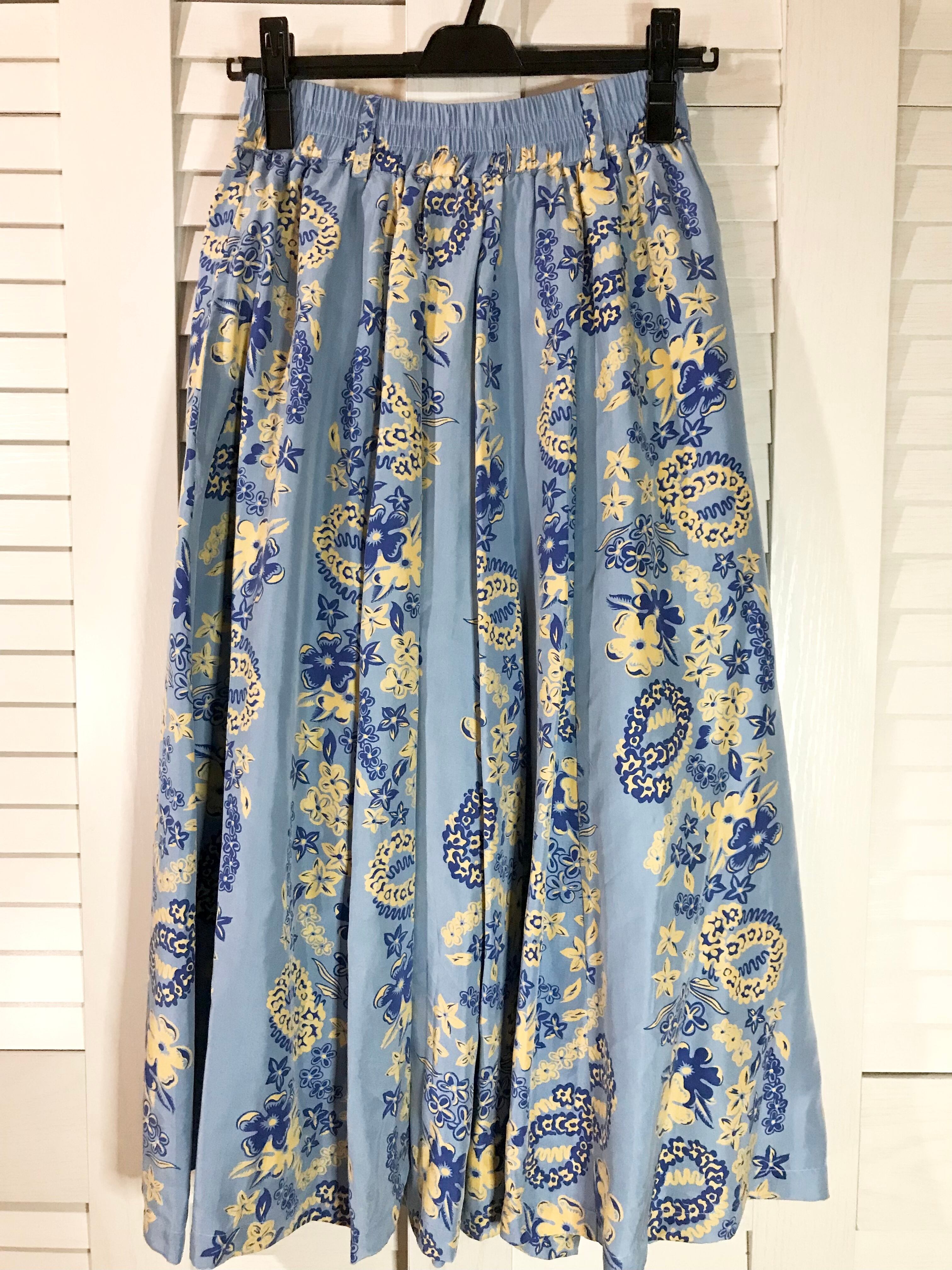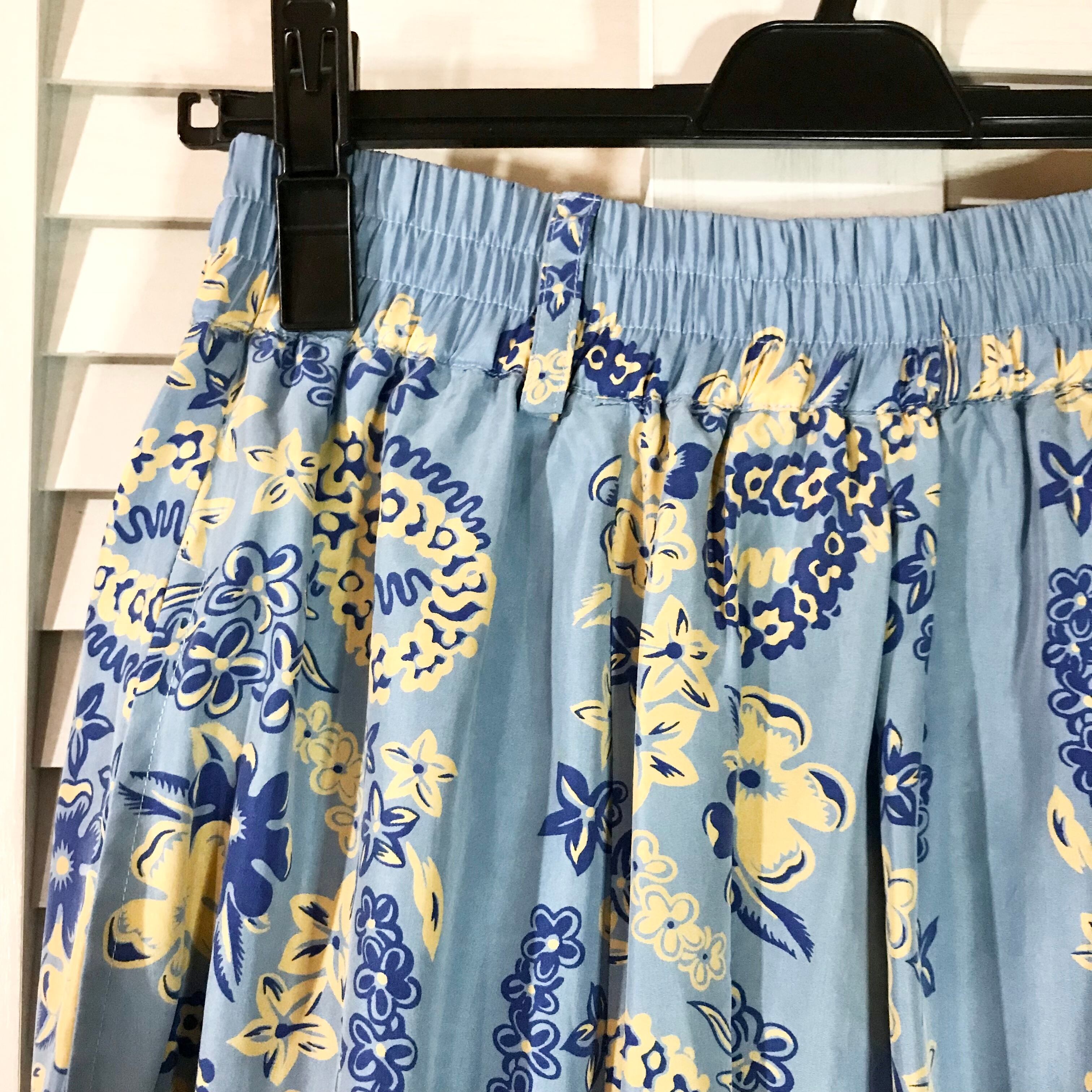 Pearls ヴィンテージ風ハワイアンプリント シルクフレアースカート サックスブルー