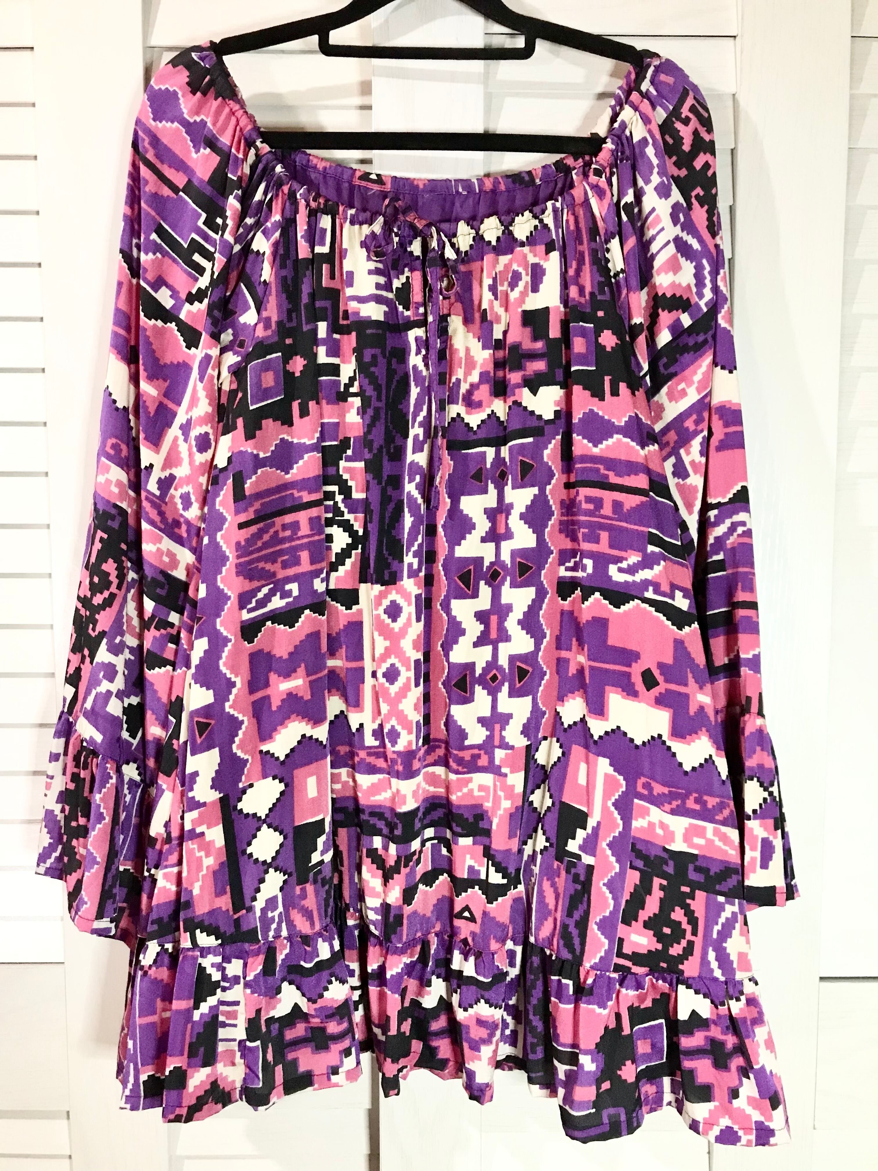 LOVE GIRLS MARKET 90S!!モロッコ柄フレアースリーブ ナイロンティアードチュニックブラウス ピンク×パープル