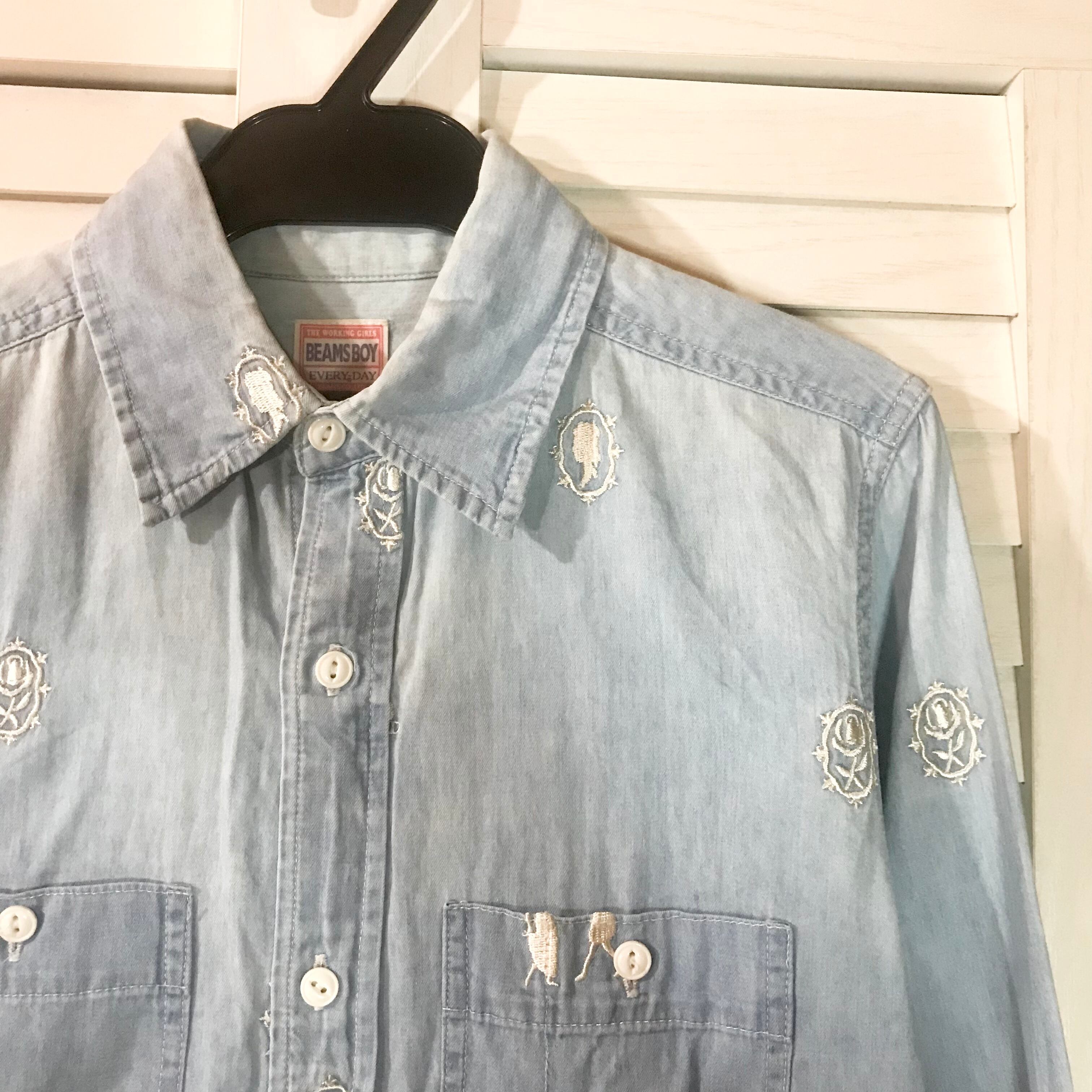 BEAMS BOY 貴族モチーフ刺繍 ケミカルウォッシュダンガリーシャツ ライトブルー