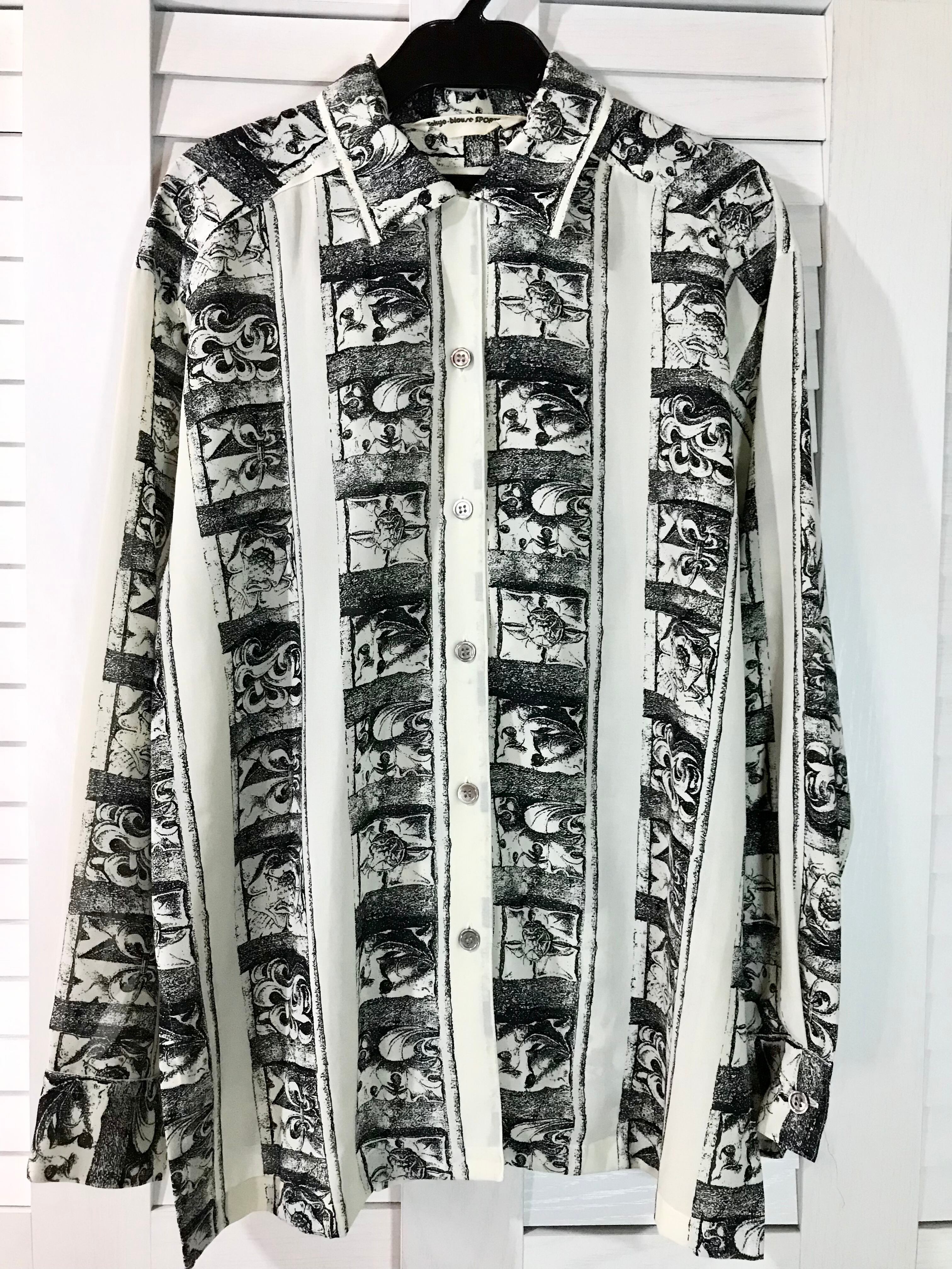 【国産古着】70Sヴィンテージ 総柄モノトーンプリント ジョーゼットブラウス【東京ブラウス】 ホワイト×ブラック