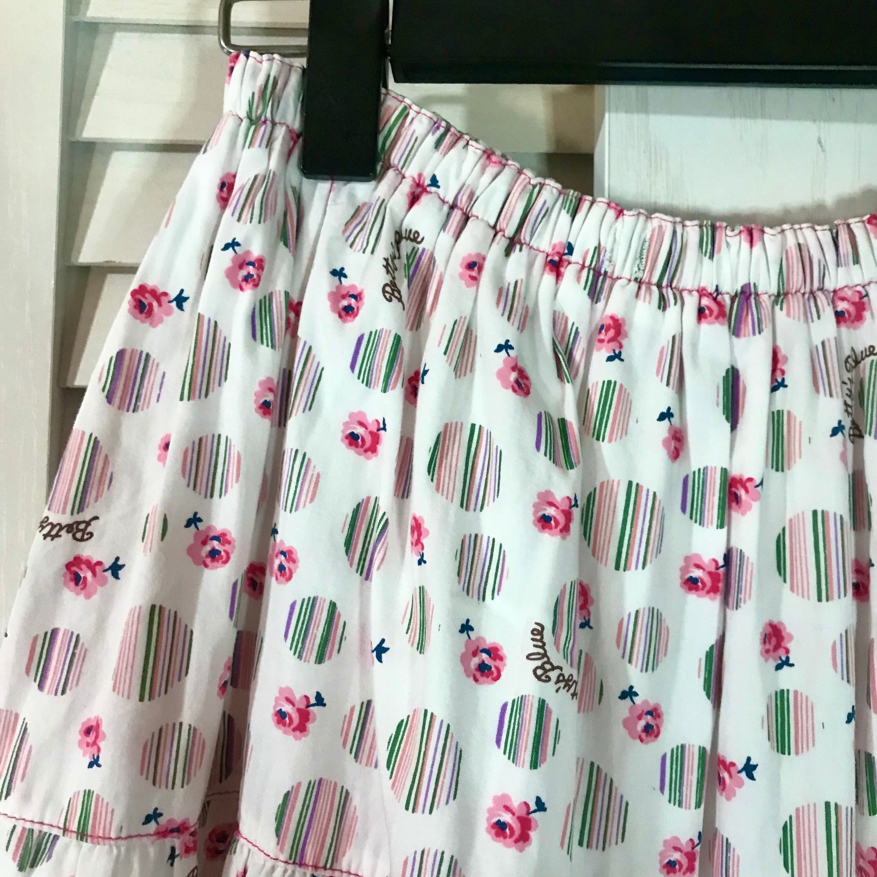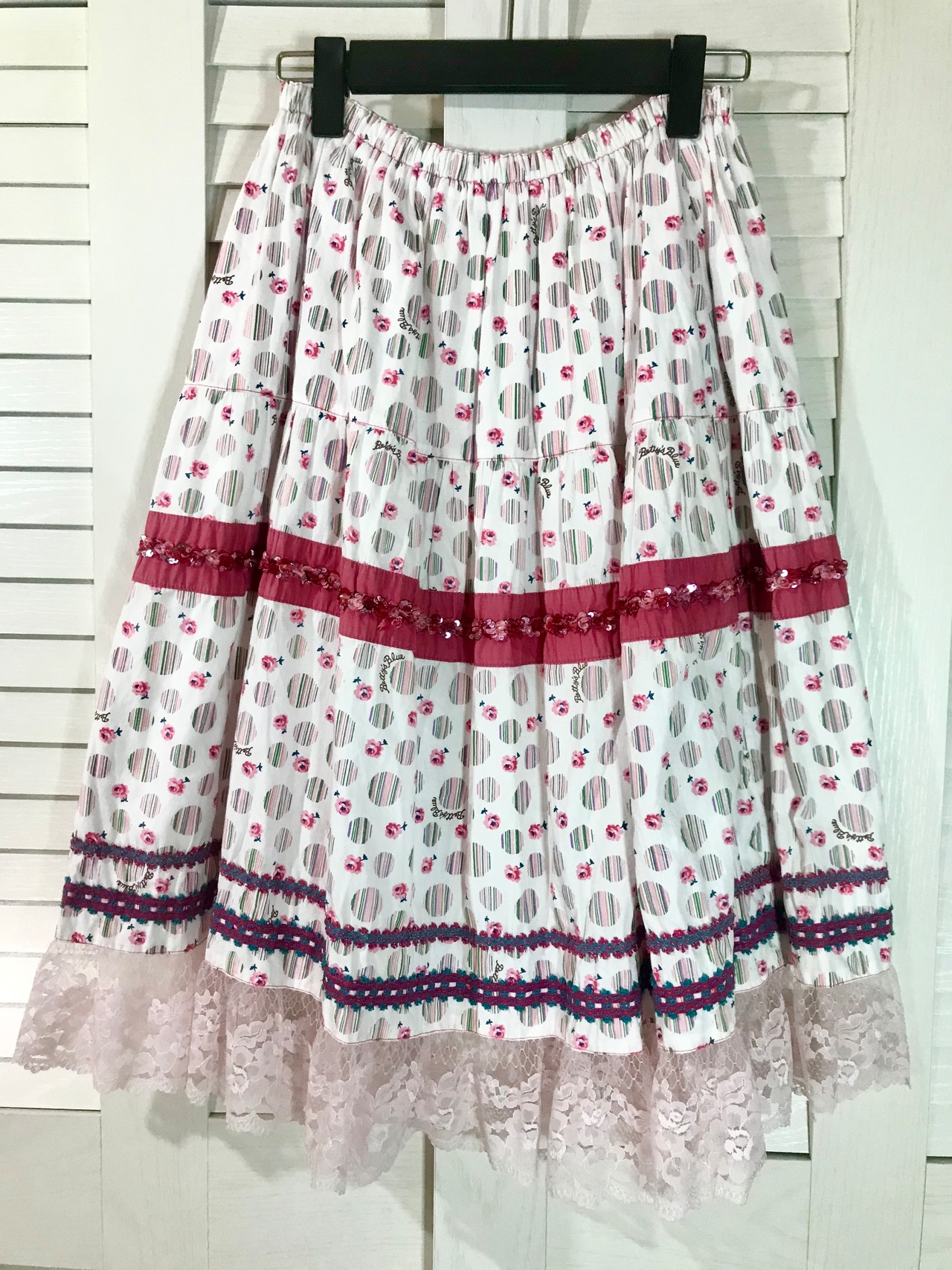 すあまさん専用◎Betty's Blue 激アツ!90S Betty's Blue マルチストライプドット チロリアンテープ&ビーズ刺繍 レース使いティアードスカート ホワイト