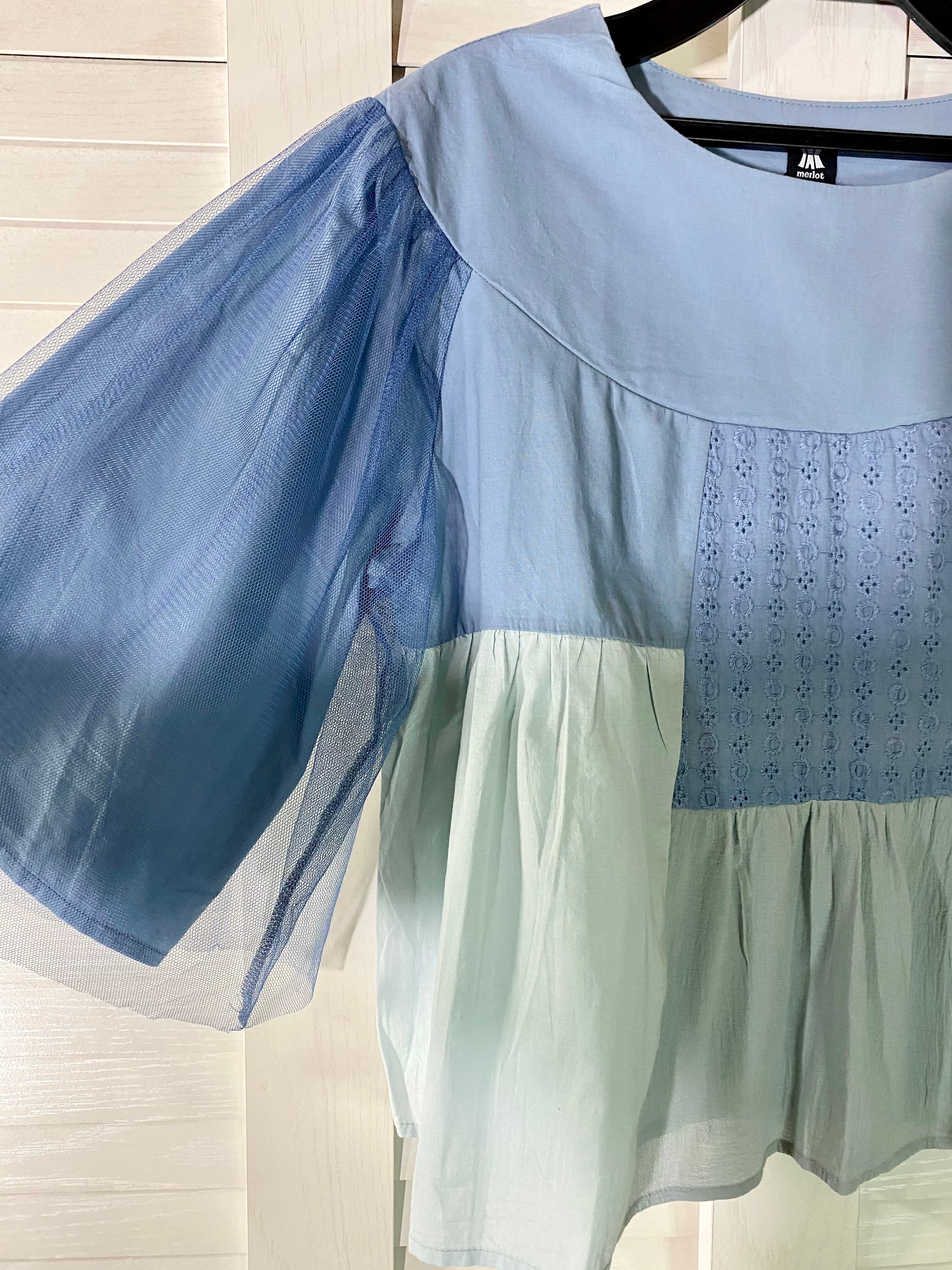 merlot チュール袖パッチワークブラウス サックスブルー