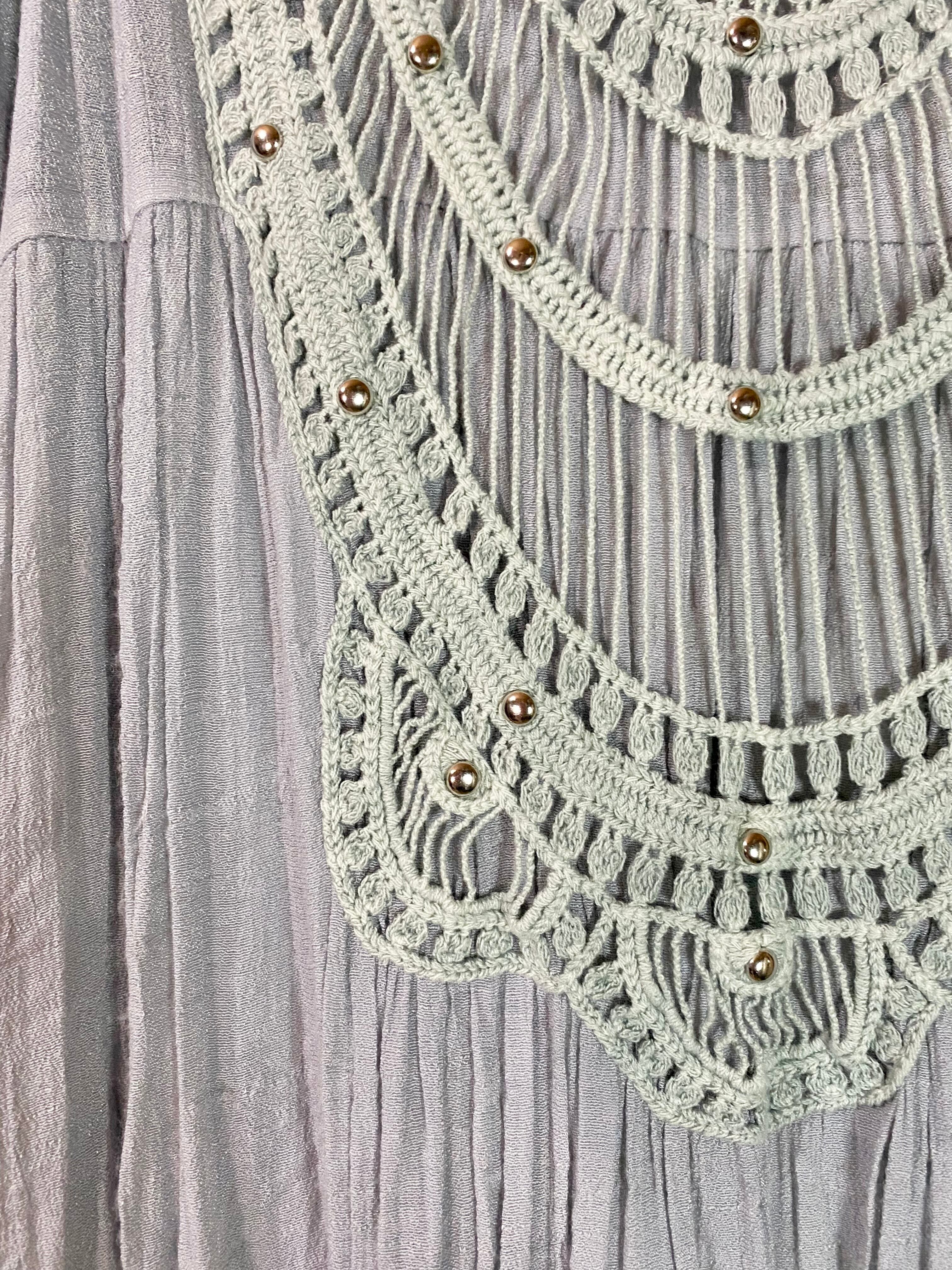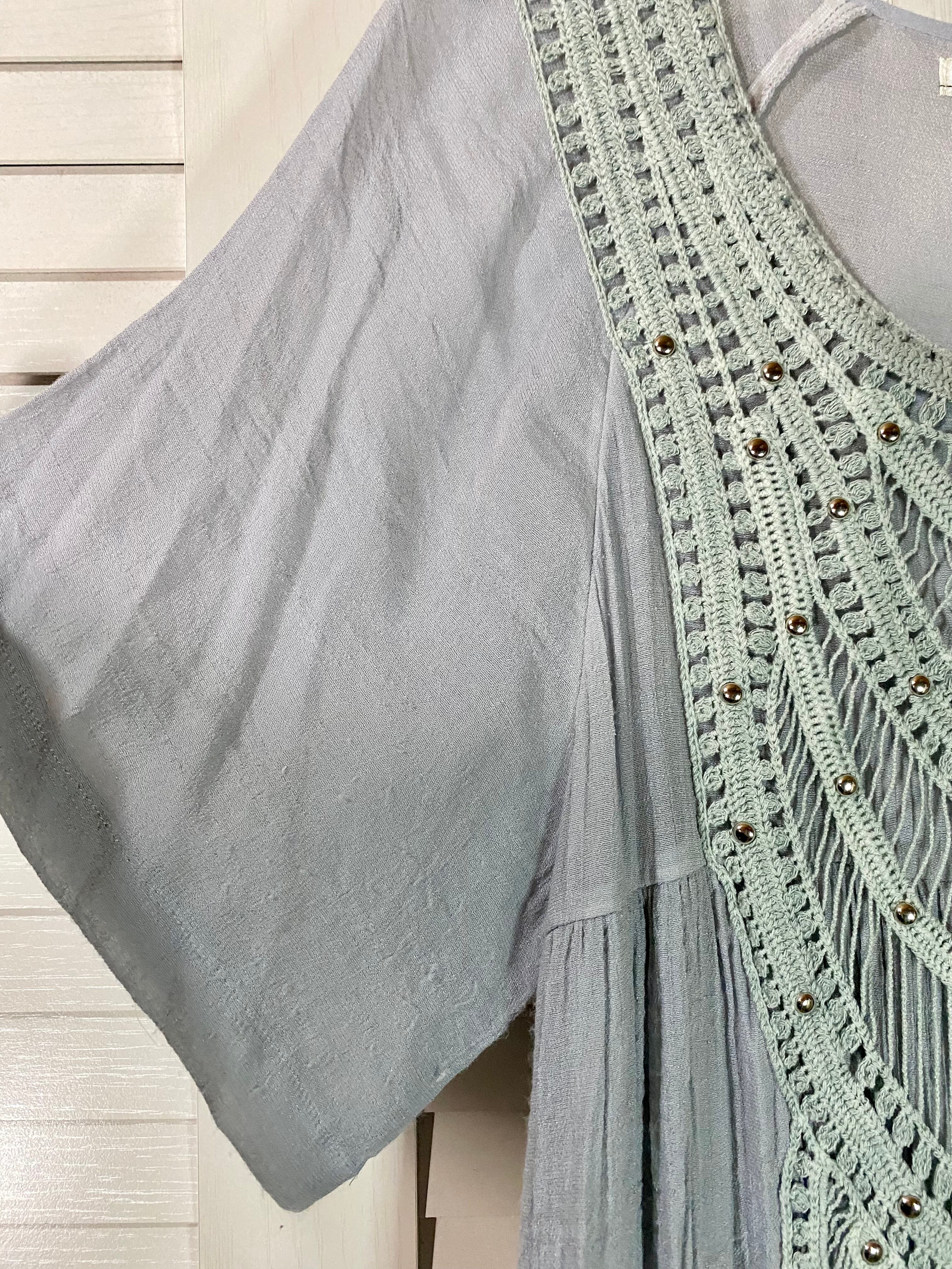 ゆーみん専用◎インナータンク付き◆silent worth カギ編みレース&スタッズ&フリンジ ポリレーヨン楊柳チュニックワンピ サックスブルー