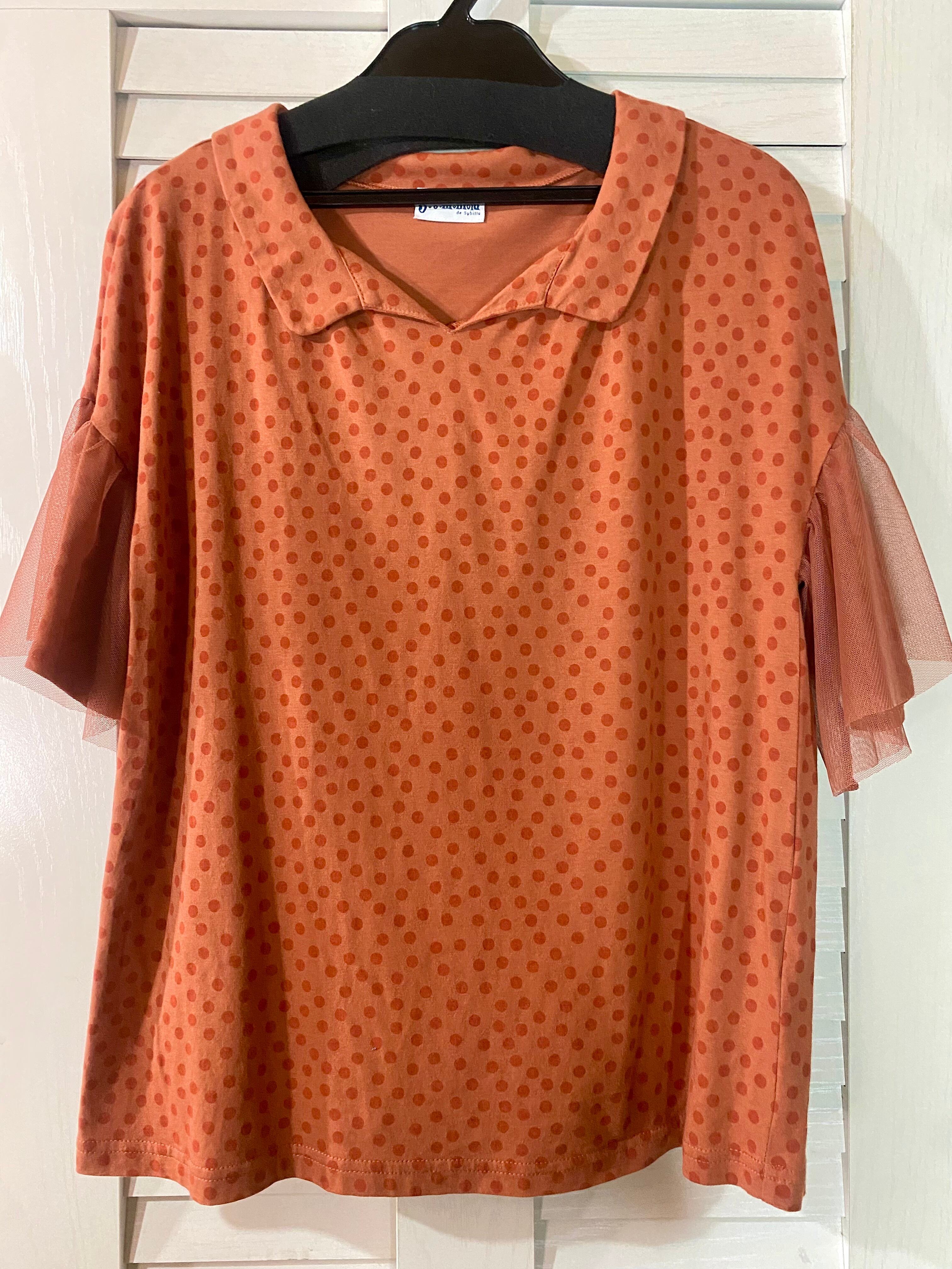 Jocomomola ドット&チュールカットソーブラウス オレンジ