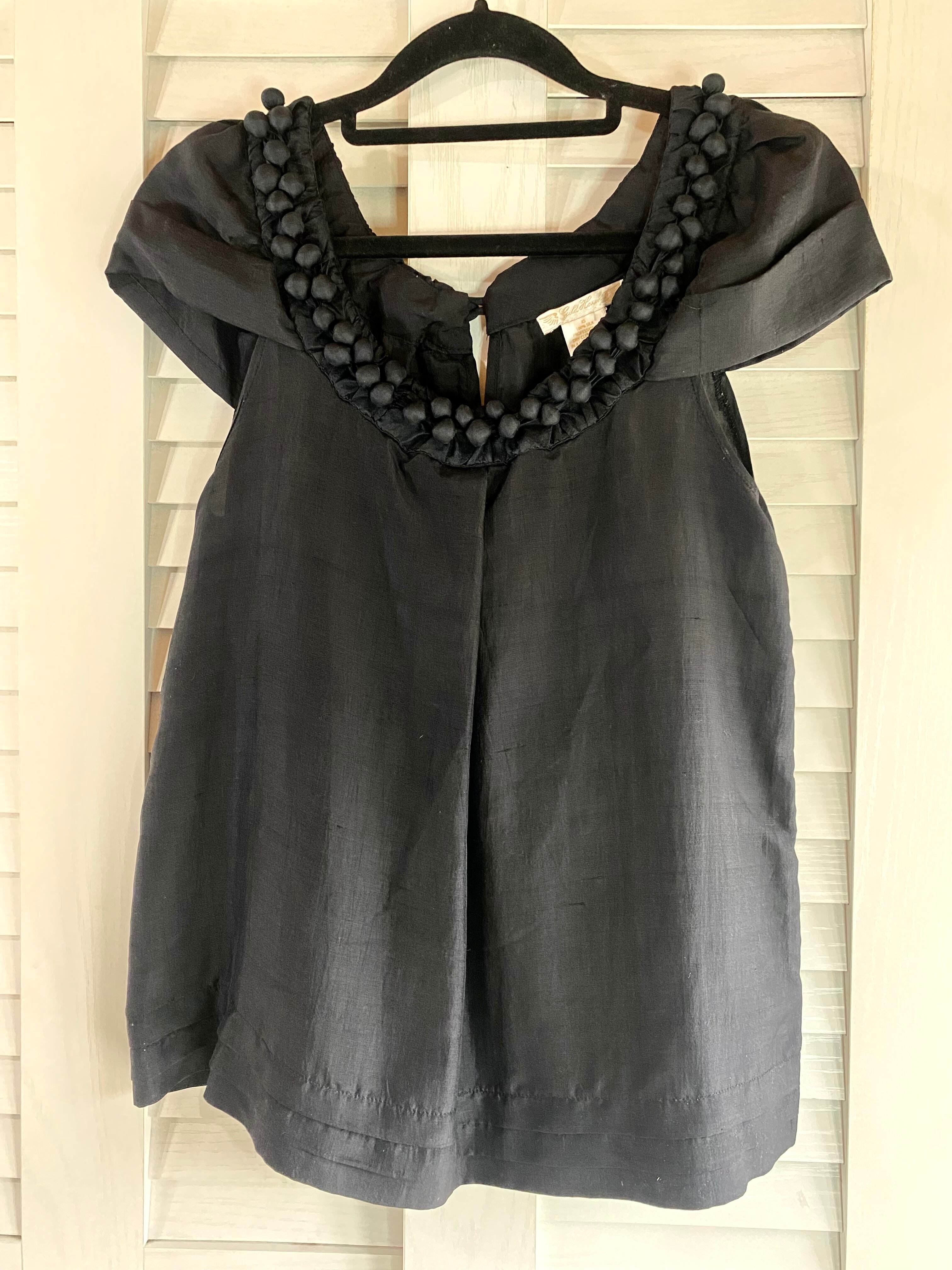 #9 Gold Howk ポンポンデザインカラー フレンチスリーブ シルクブラウス ブラック