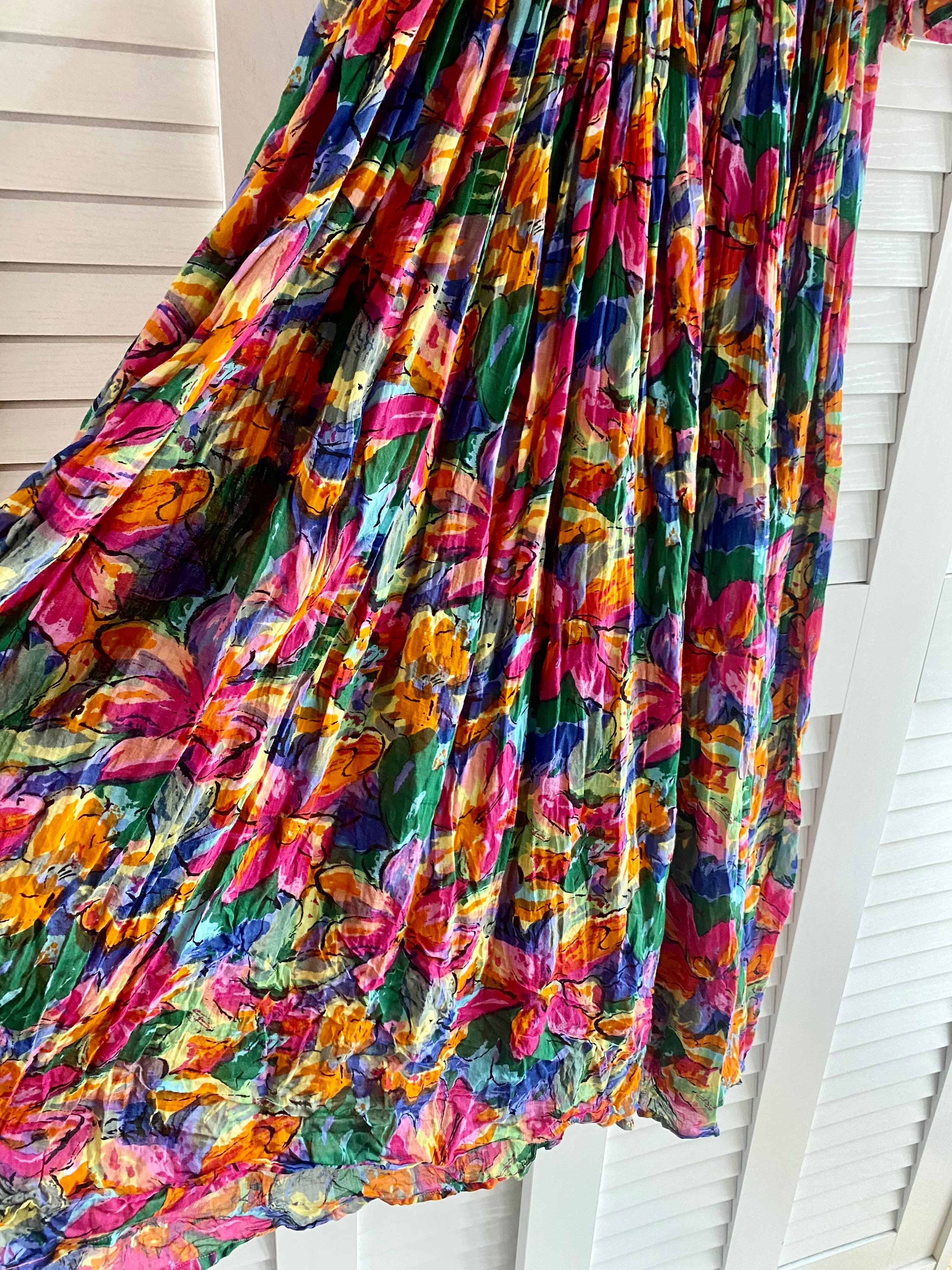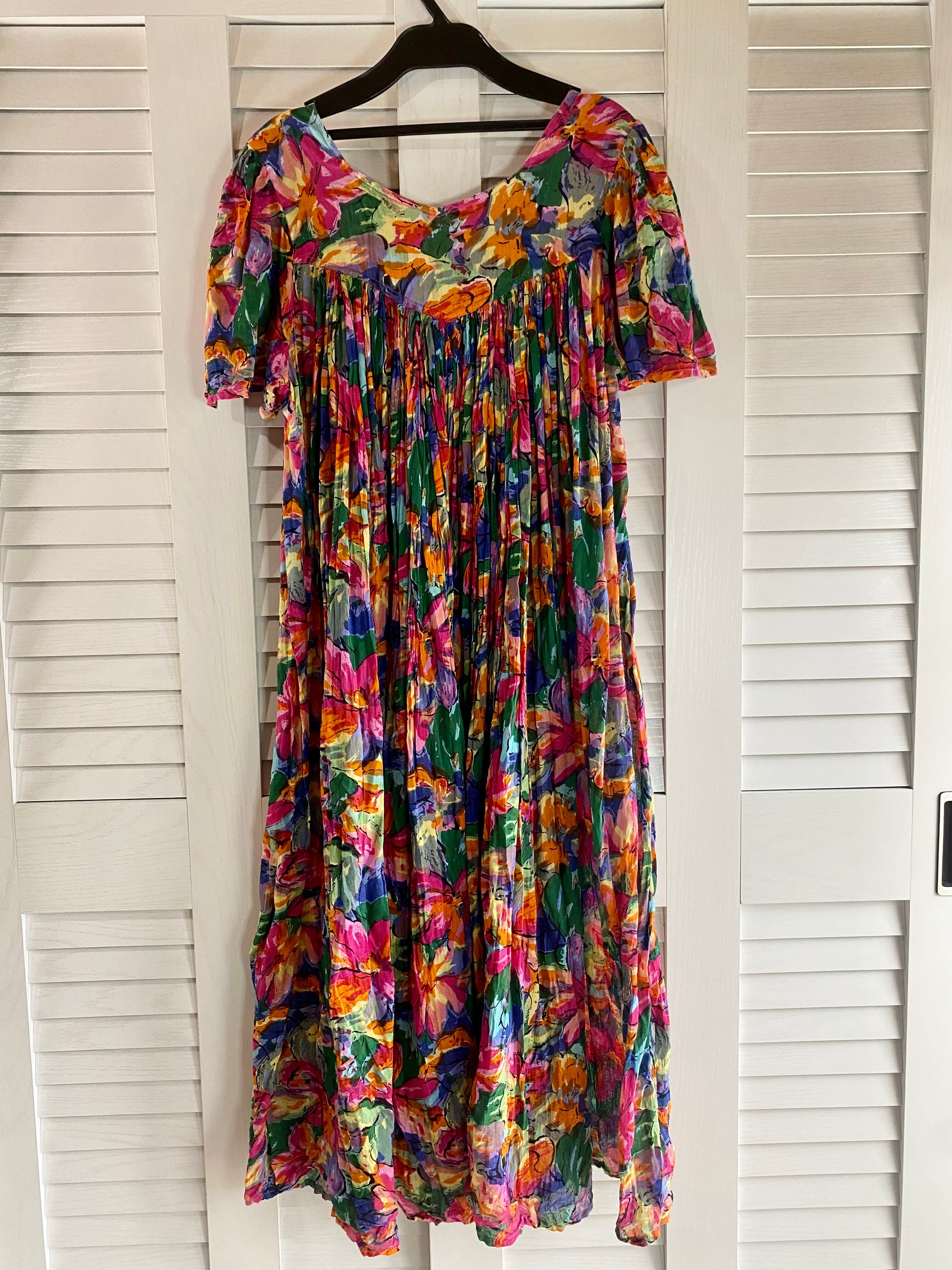 #10【古着屋購入】70Sヴィンテージ フラワープリント コットンガーゼワッシャー加工ボリュームワンピ マルチカラー