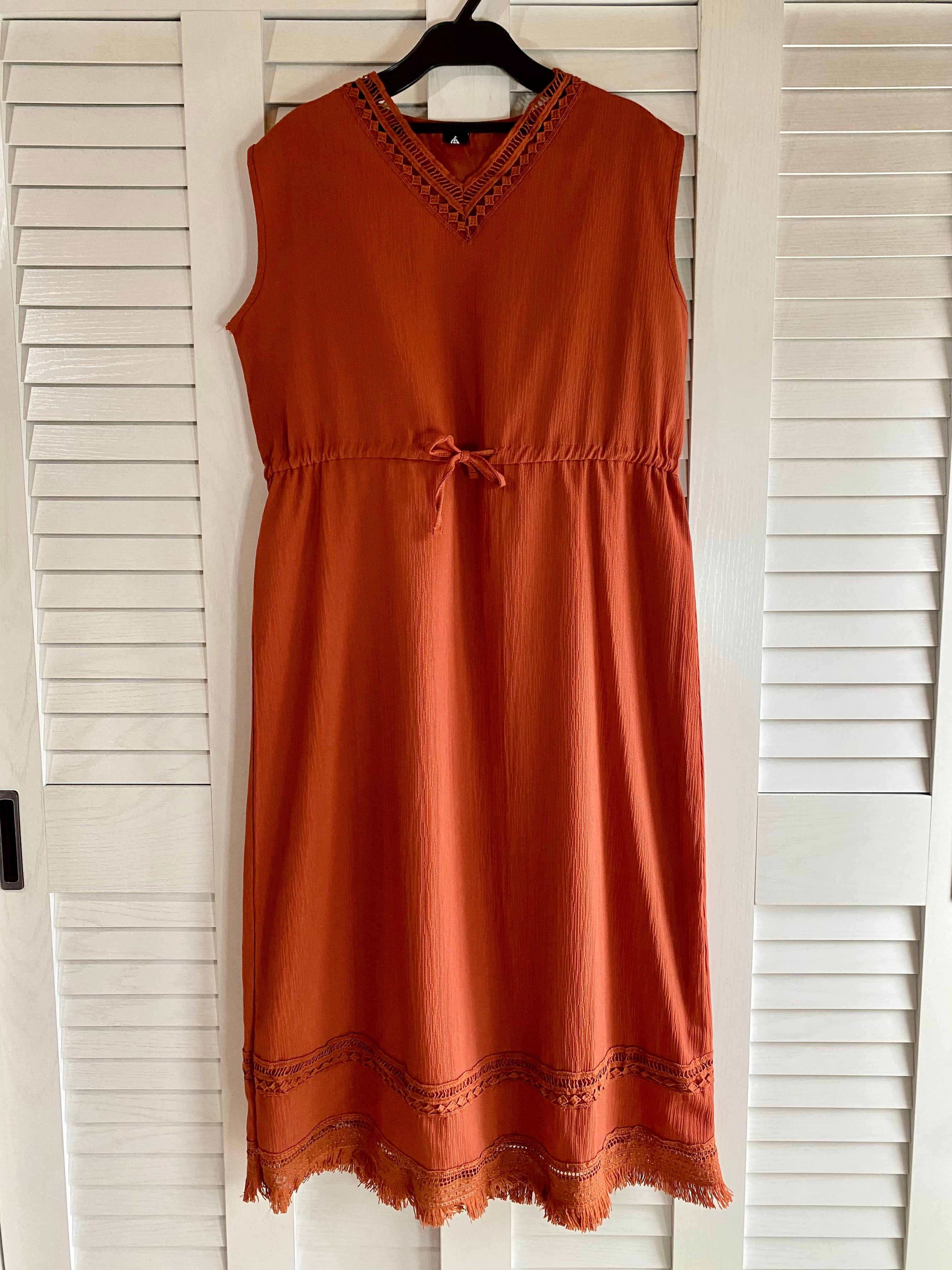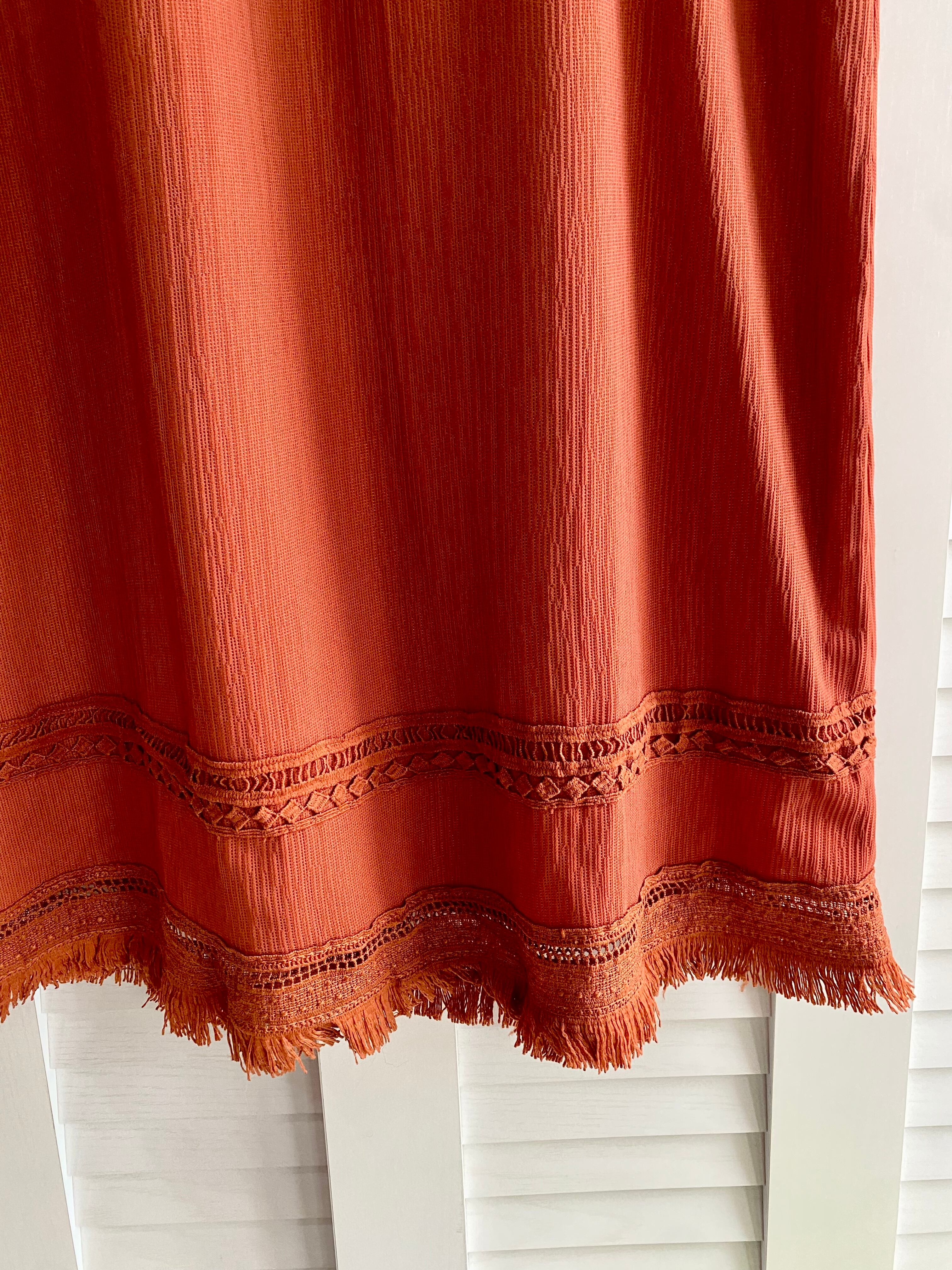 #11 merlot ケミカルレース&フリンジ 楊柳ノースリーブワンピ ダークオレンジ