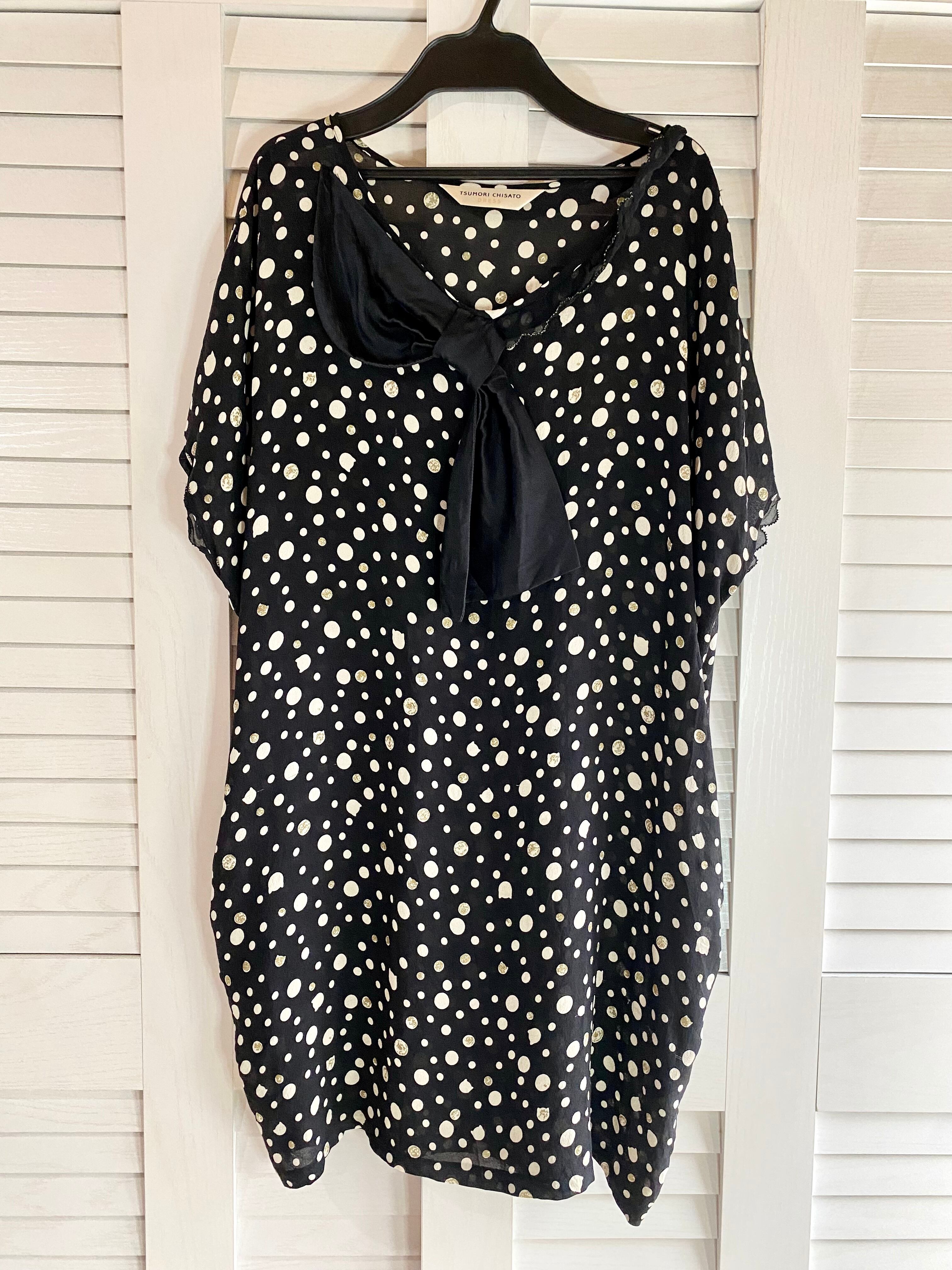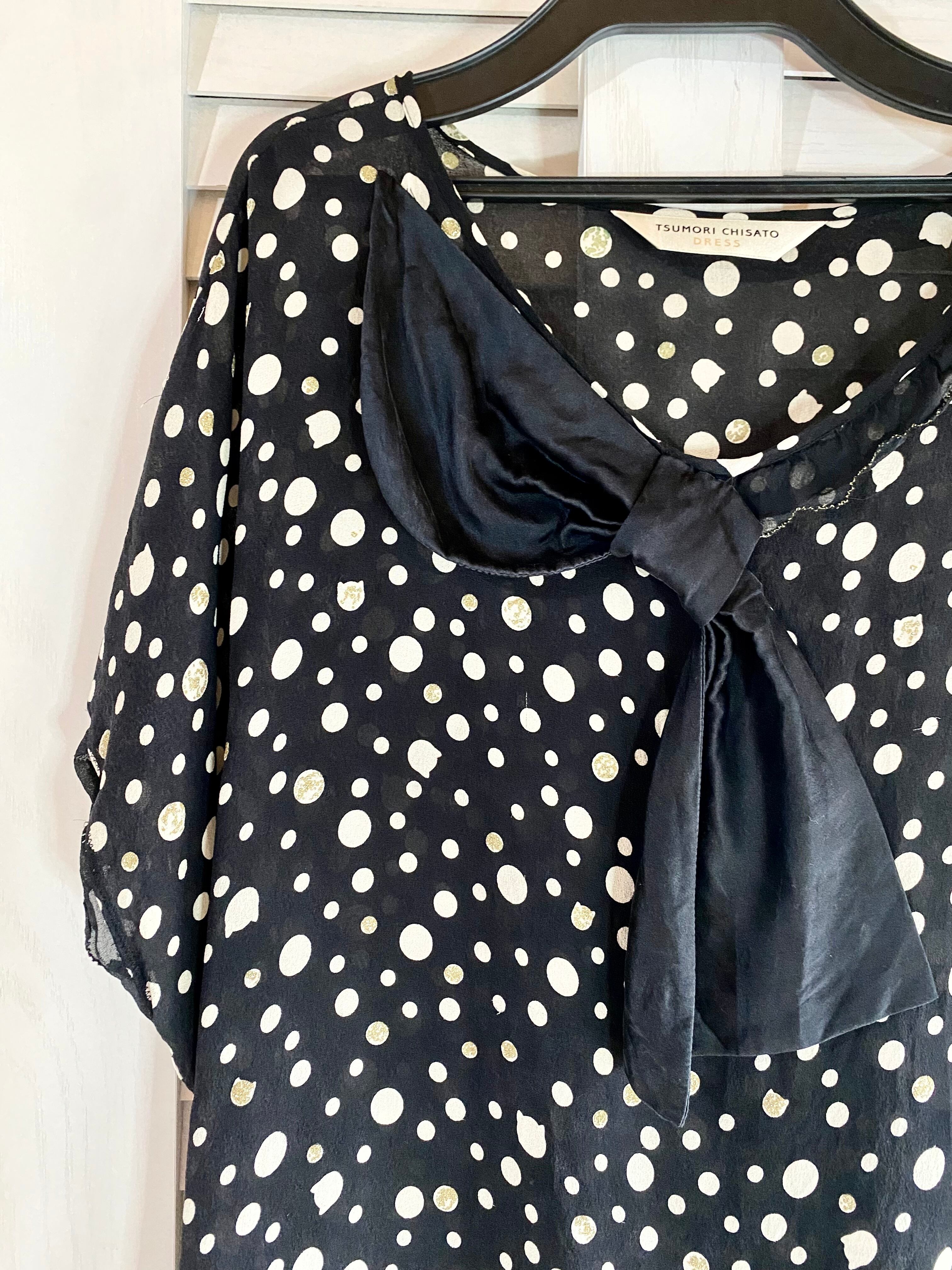 TSUMORI CHISATO ネコドット ストレッチジョーゼット アシメデザインカラー コクーンワンピ ブラック