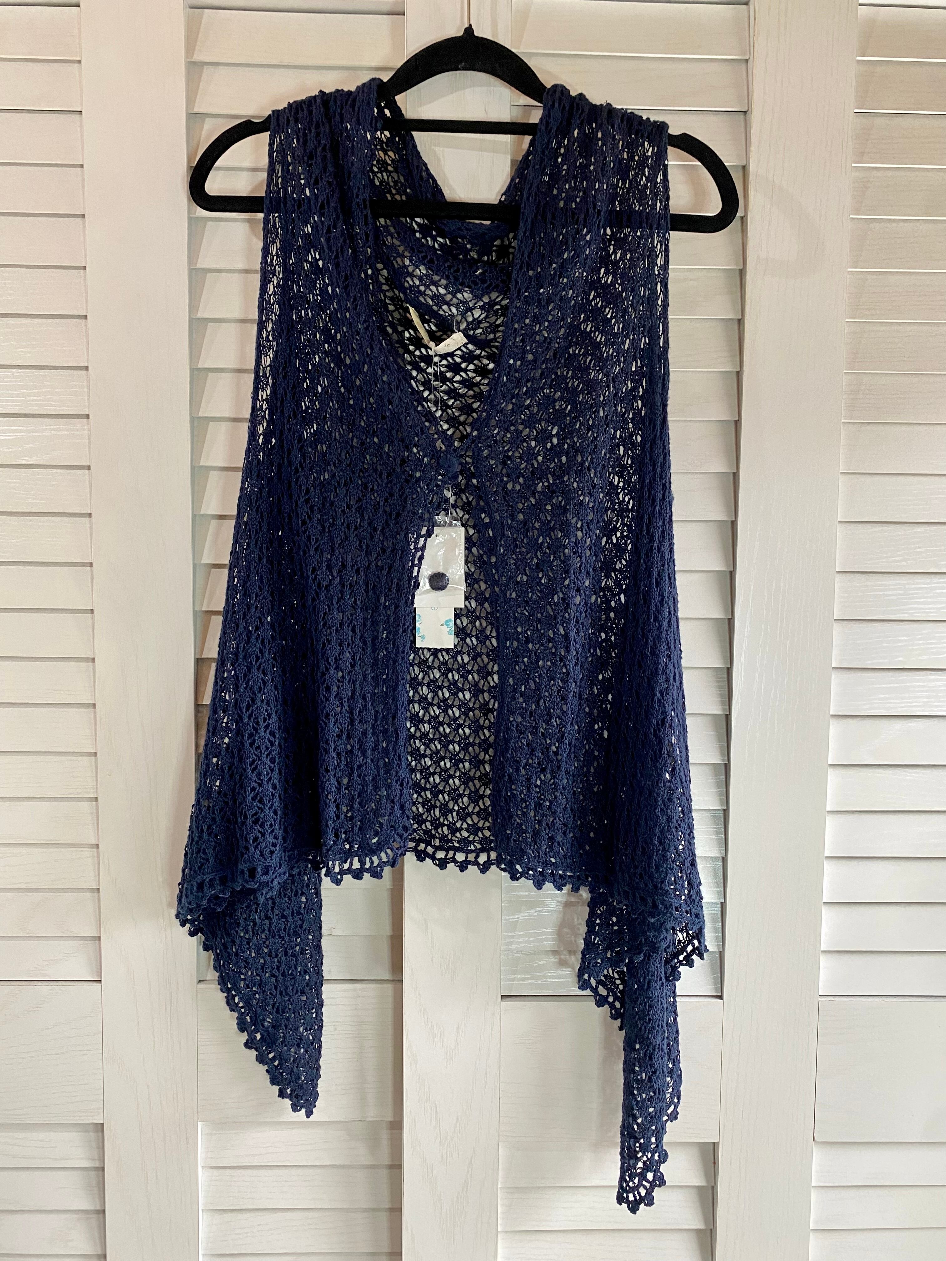 #13 shuca コットンリネン 透かし編みイレギュラーニットジレ ネイビー