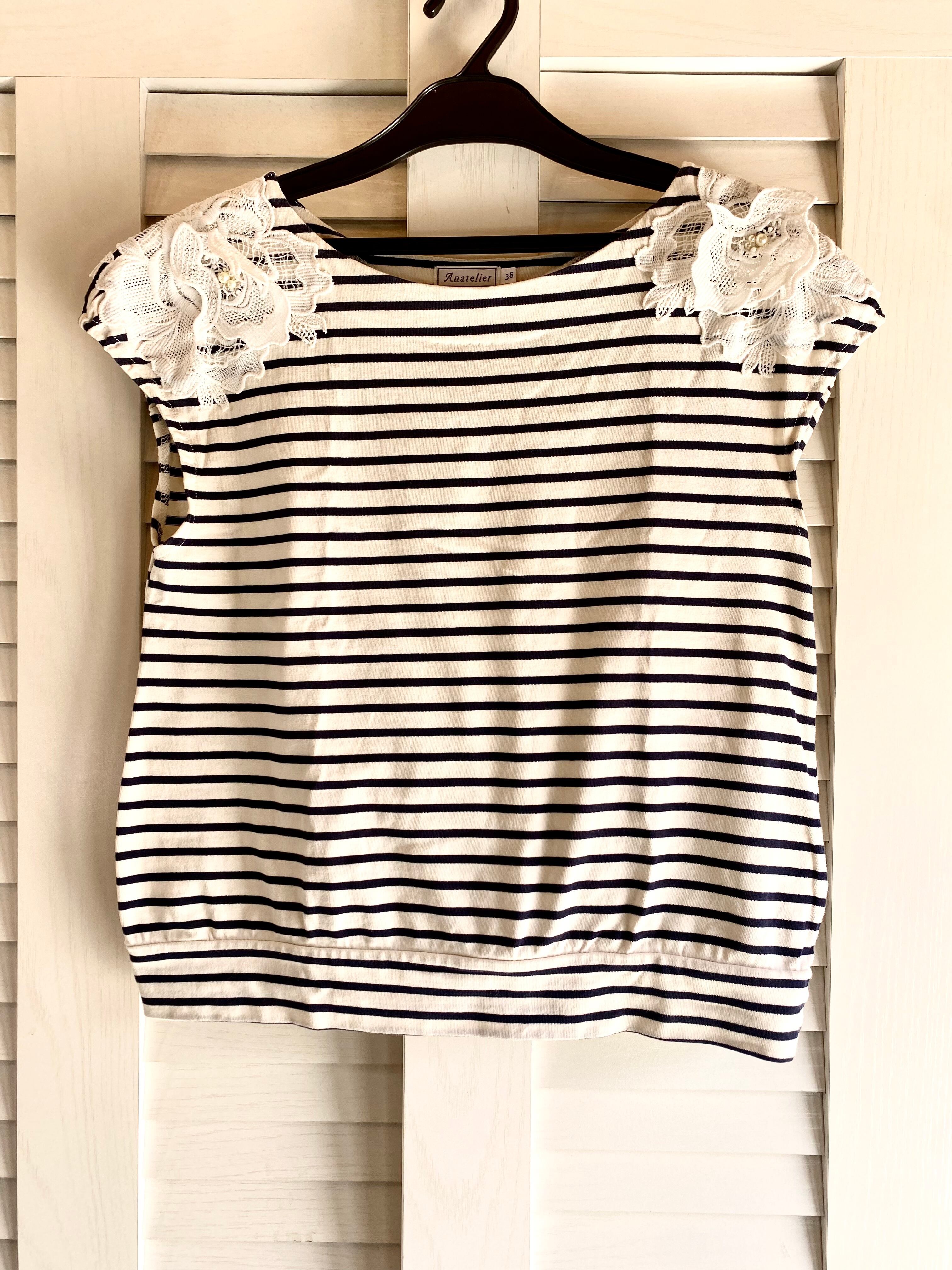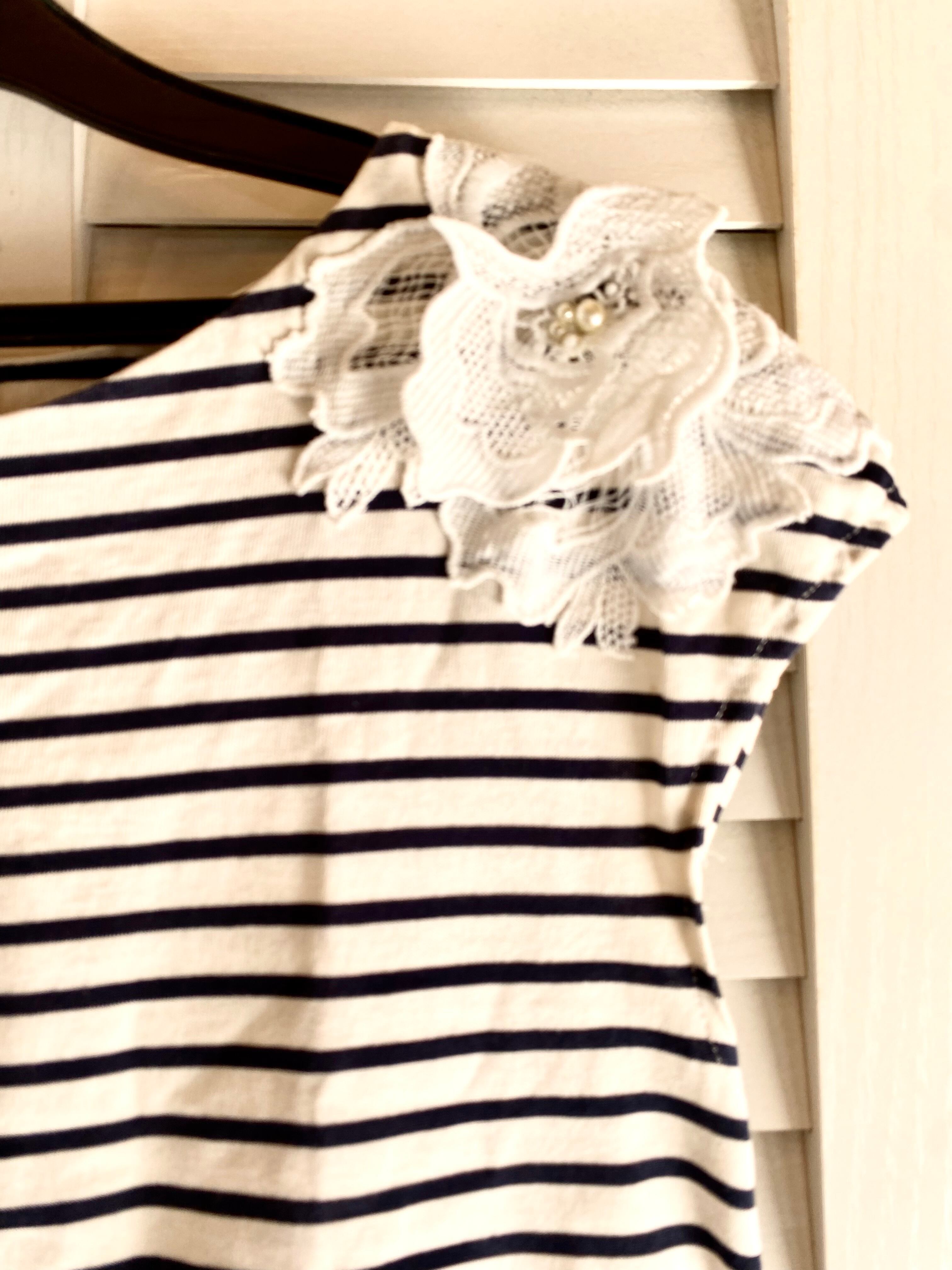 #14 Antelier フラワーレースショルダー フレンチミニスリーブ ボーダーカットソー ネイビー×アイボリー