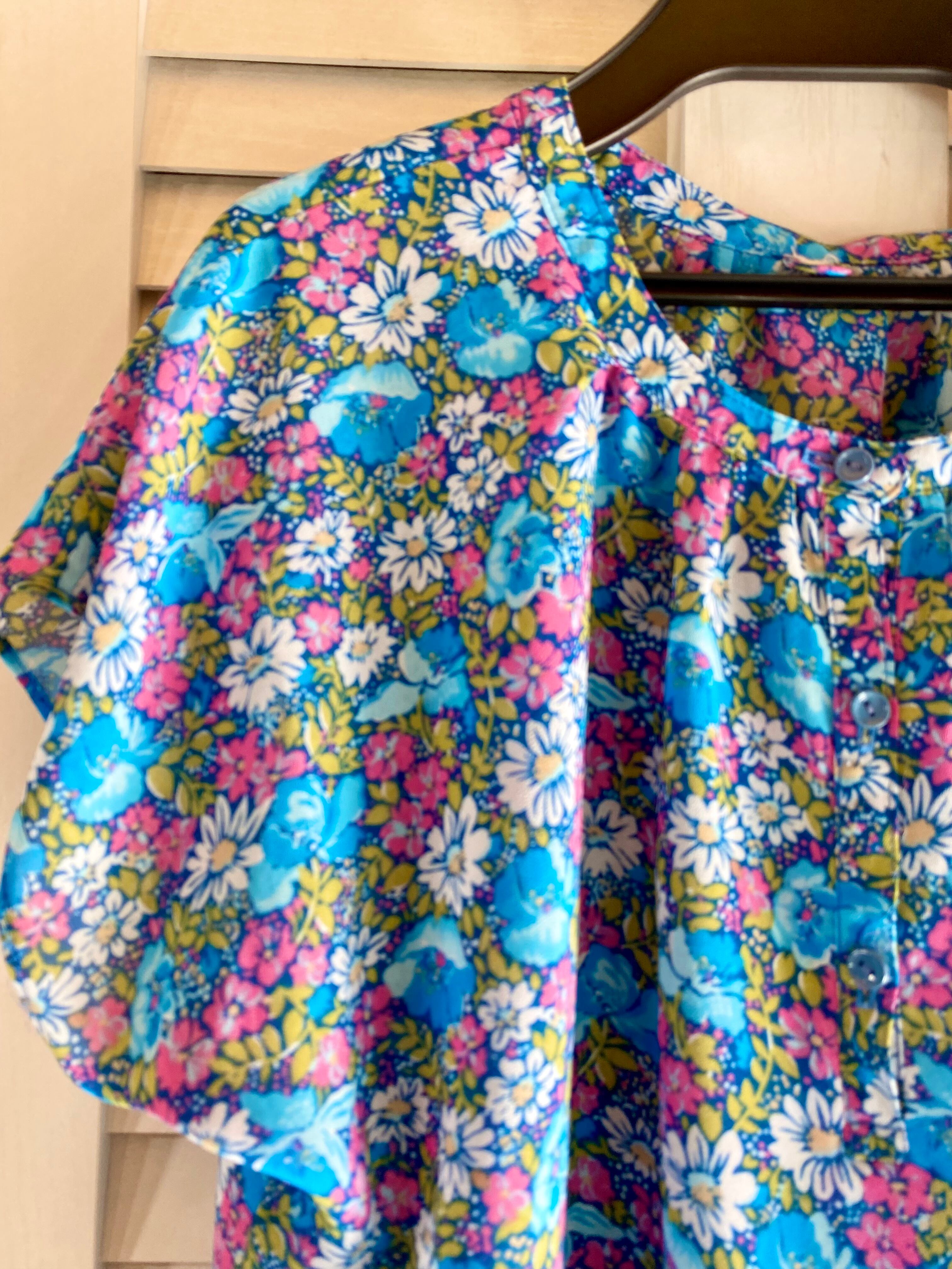 #14【国産古着】70Sヴィンテージ キッチュカラーフラワープリント フレンチスリーブボリュームブラウス ブルー