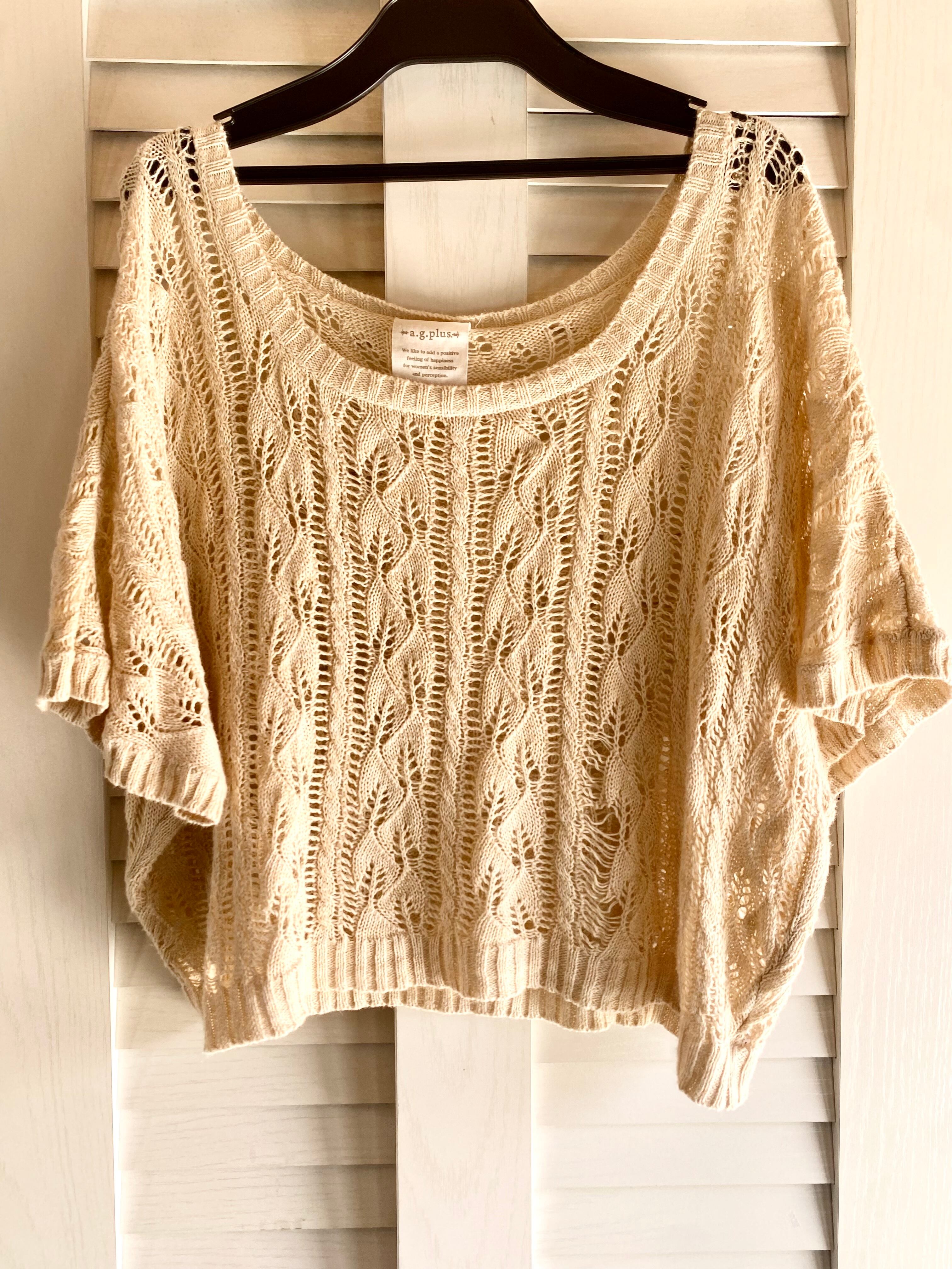 #14 a.g.plus リーフモチーフ透かし編み ショート丈コットンリネンニット ライトクリームベージュ