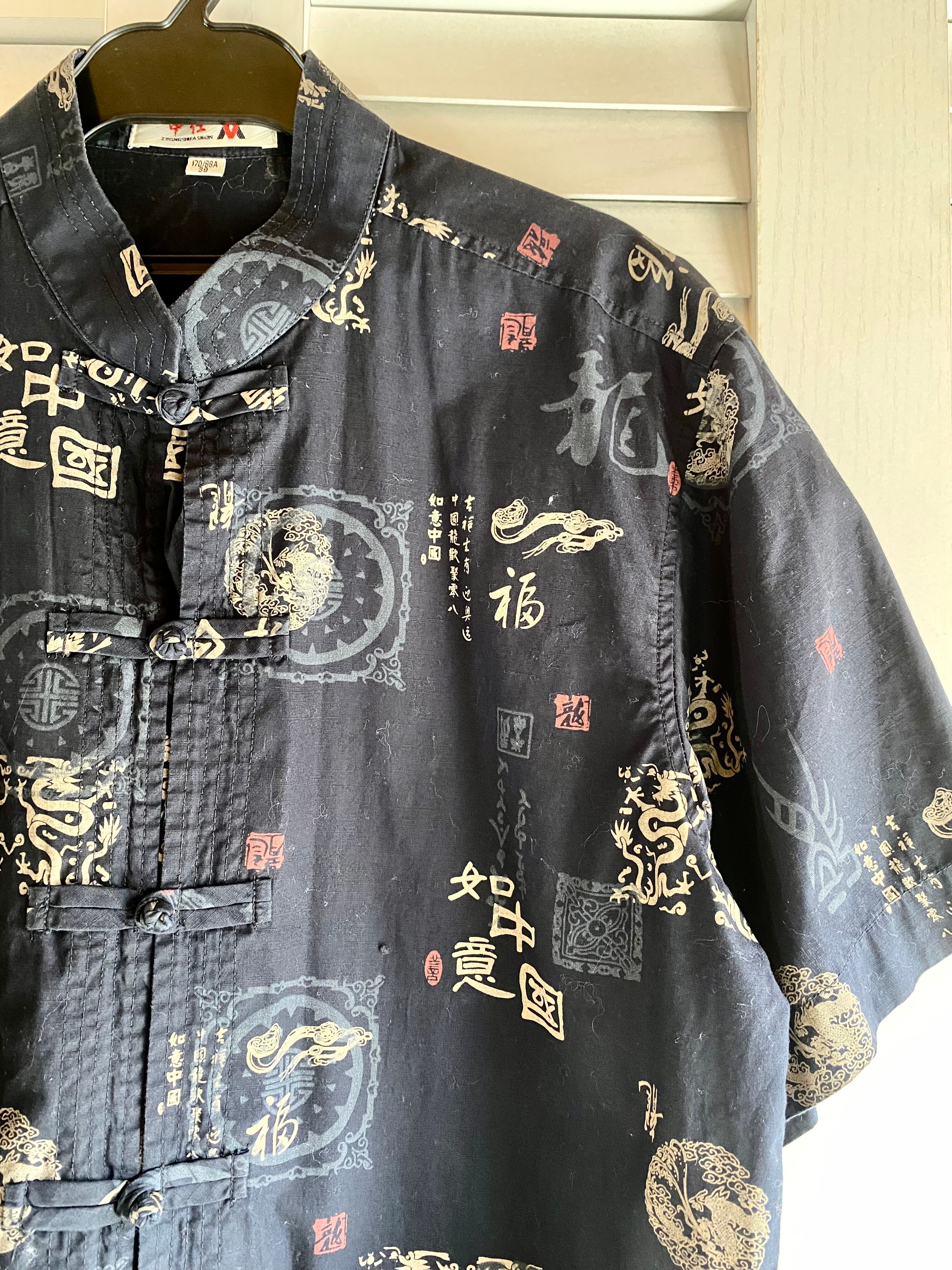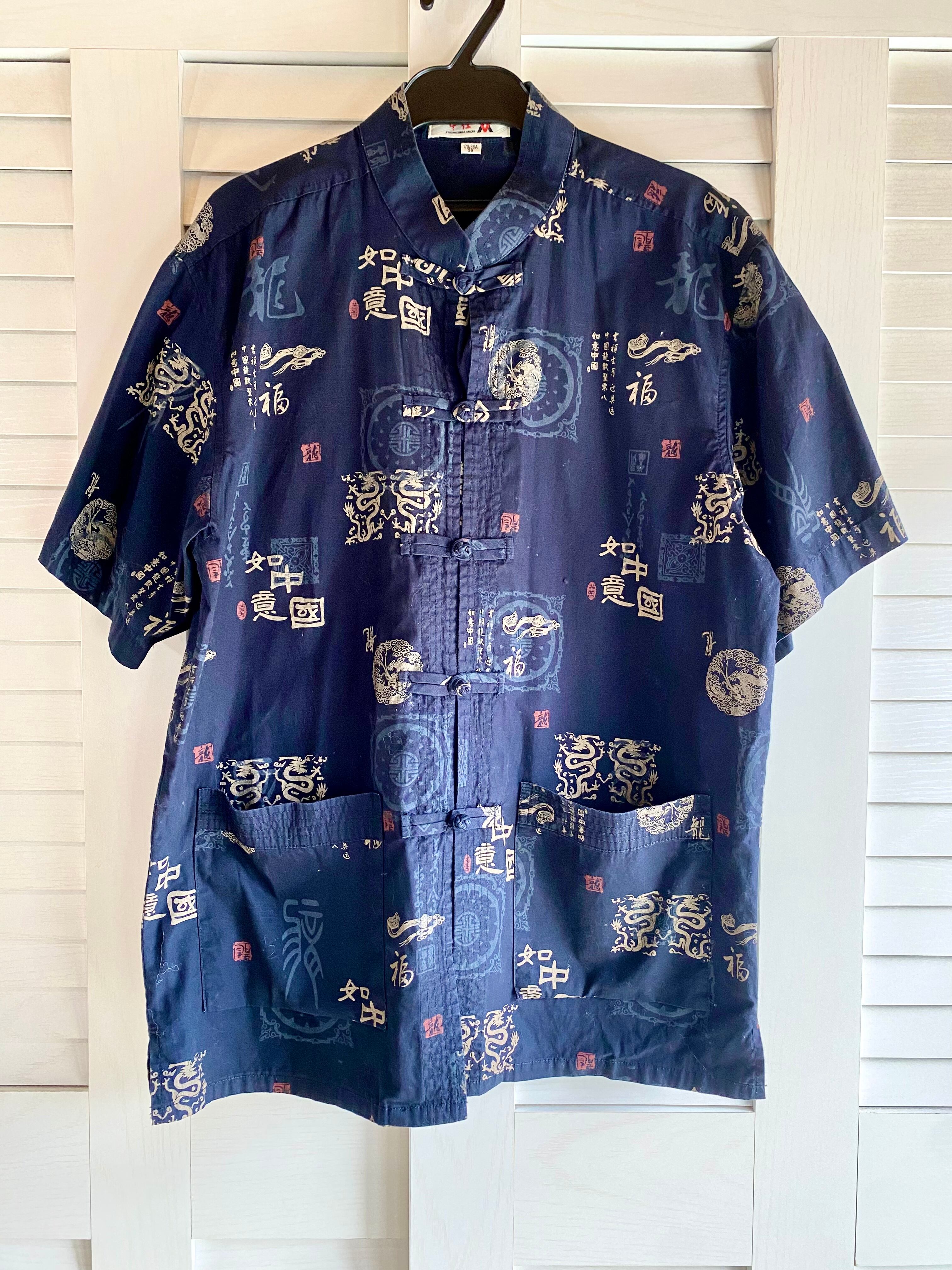 #15【古着屋購入】漢詩プリント チャイナカラーシャツ ネイビー