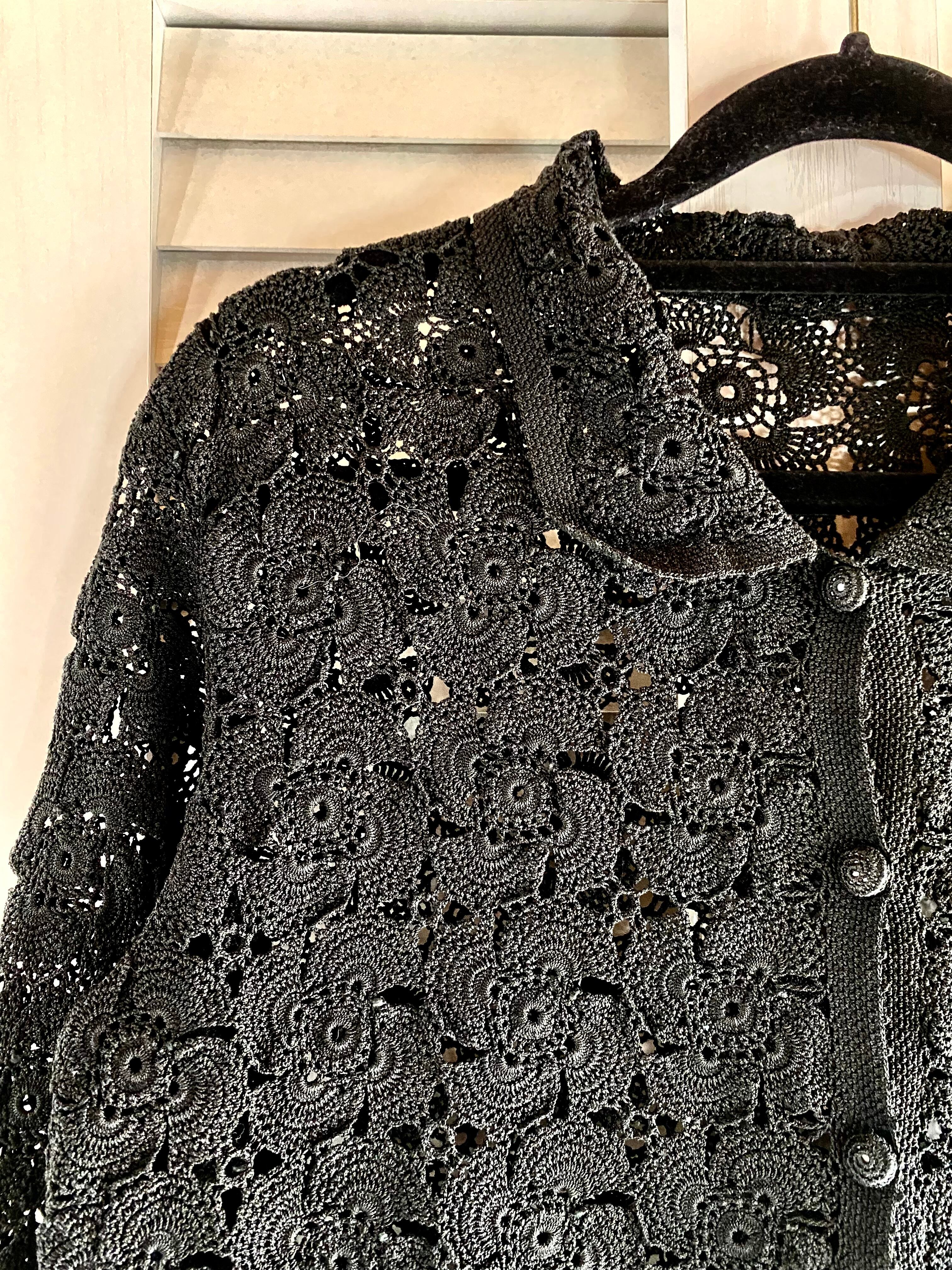 #16【国内古着】70Sヴィンテージ レースモチーフ編み襟付きカーデ ブラック