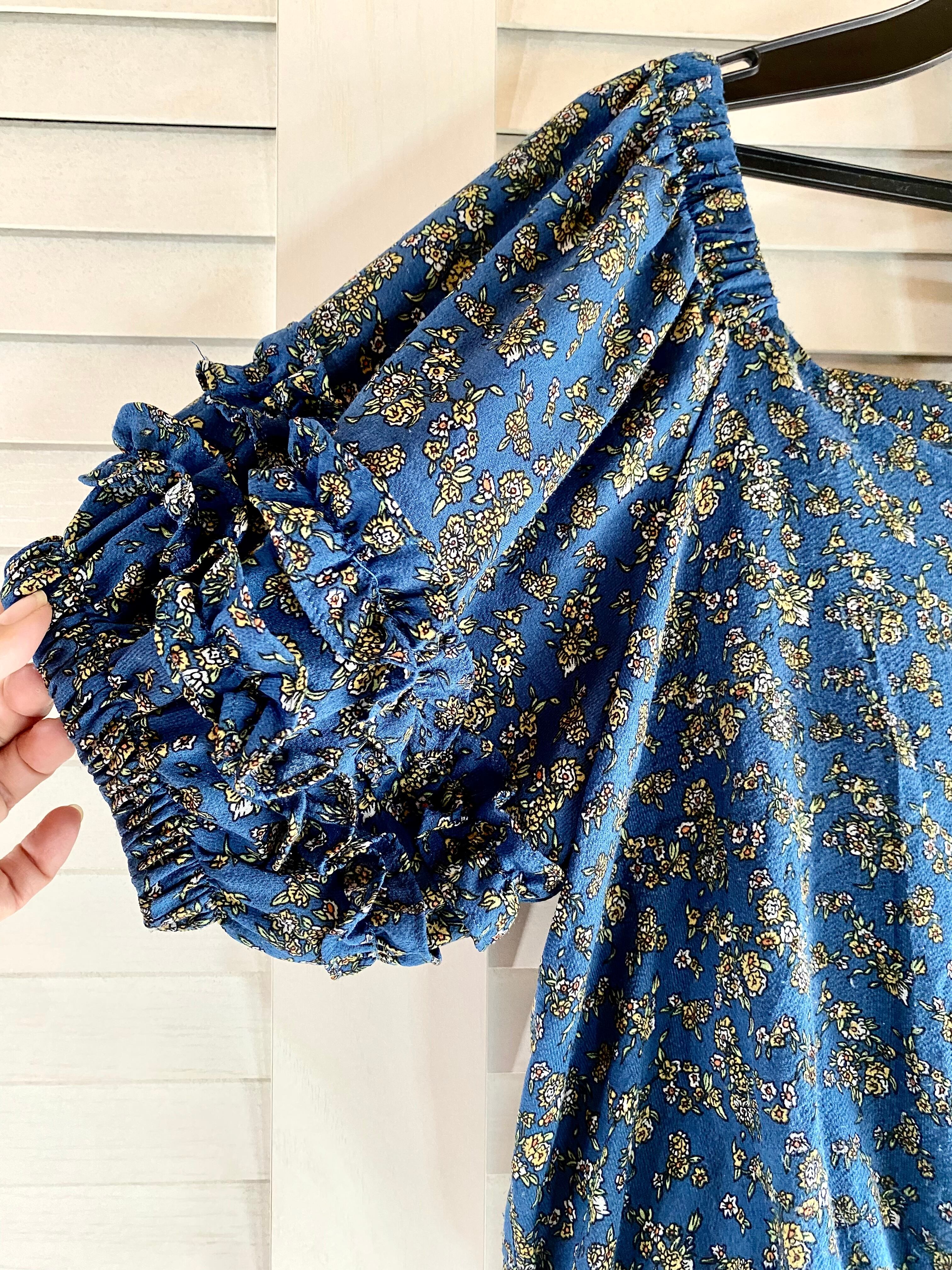 #16 NICE CLAUP 小花柄 フリルスリーブ ショート丈ブラウス ターコイズブルー
