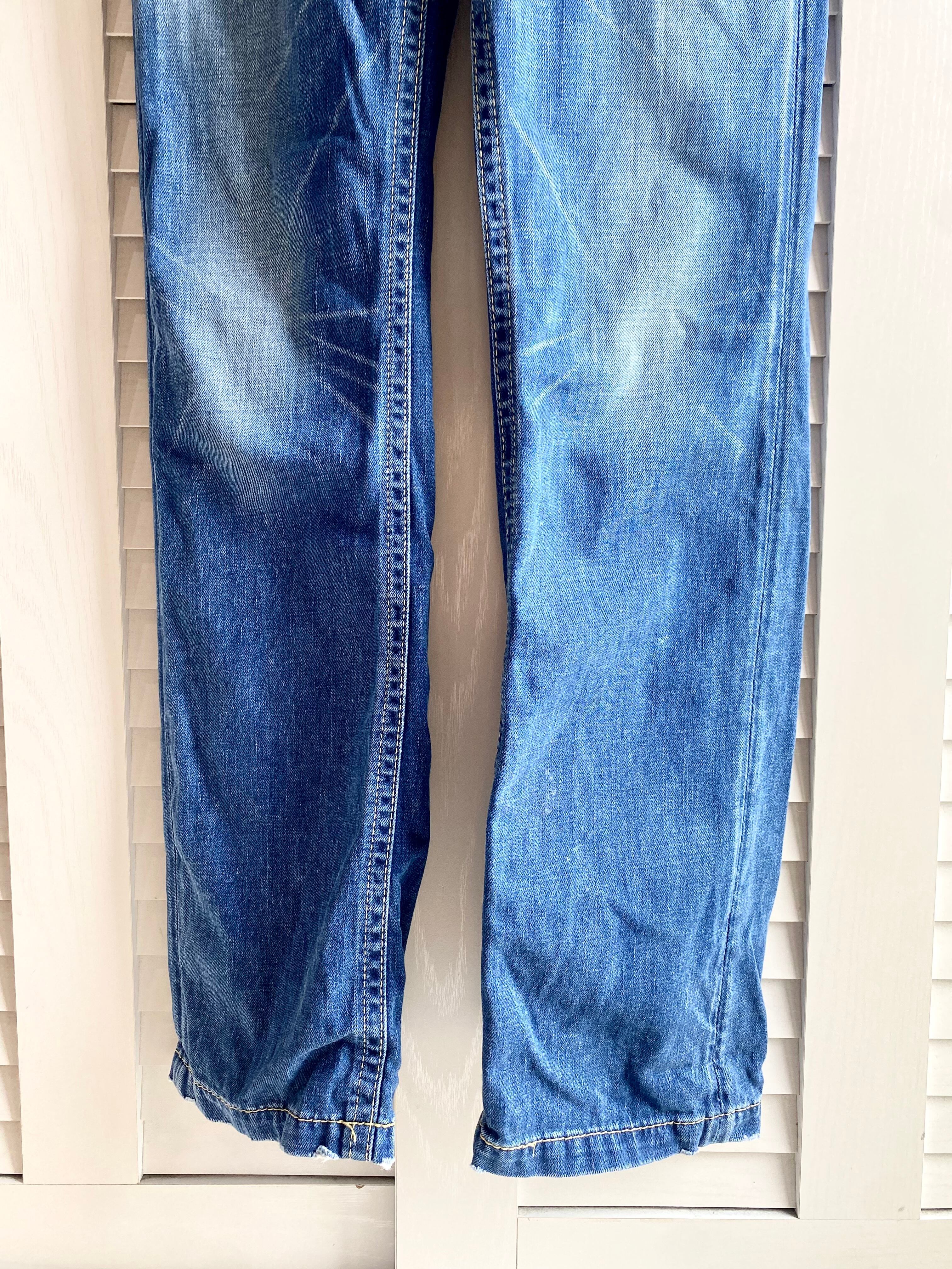 #17 RODEO CROWNS レトロハワイアン柄裏地付き スレンダーデザインサロペットジーンズ ブルー