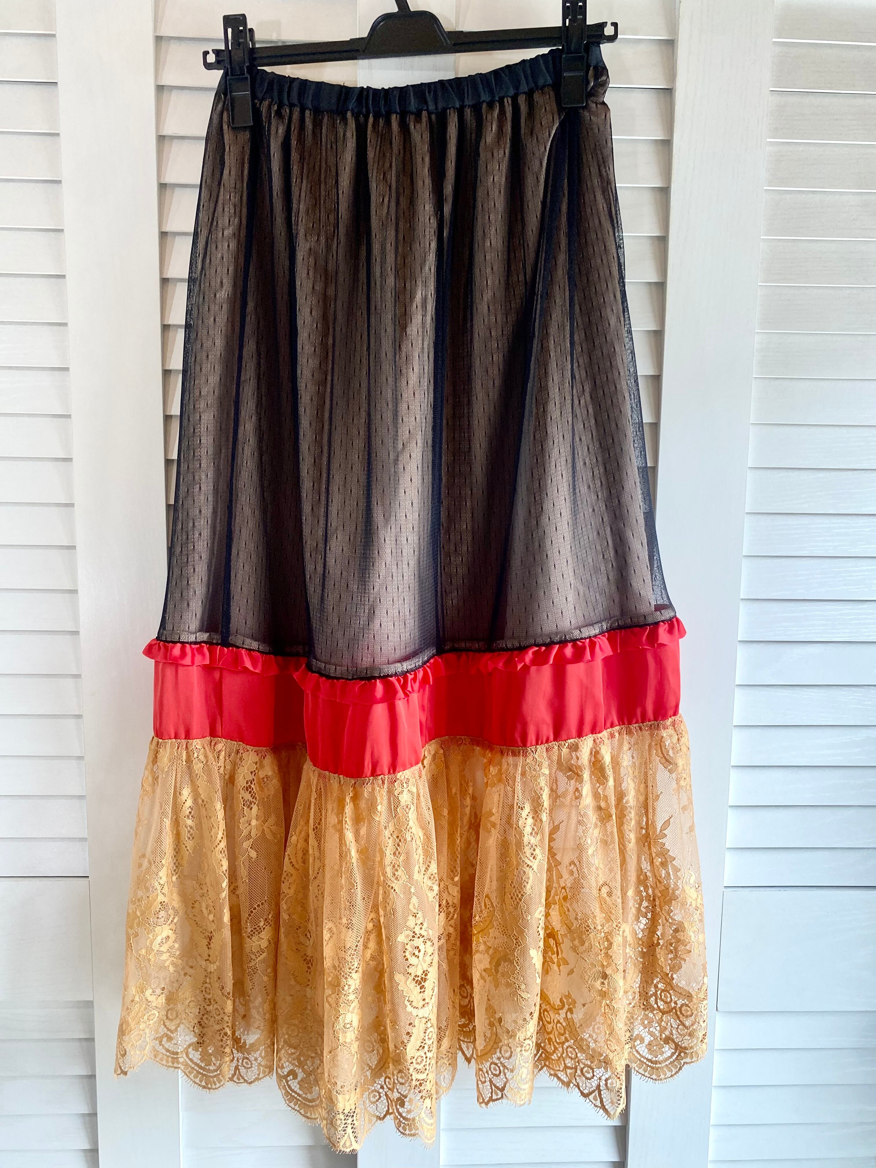 #17【デザインサンプル】配色レース&サテン&チュール ティアードスカート ブラック×レッド×ゴールドイエロー