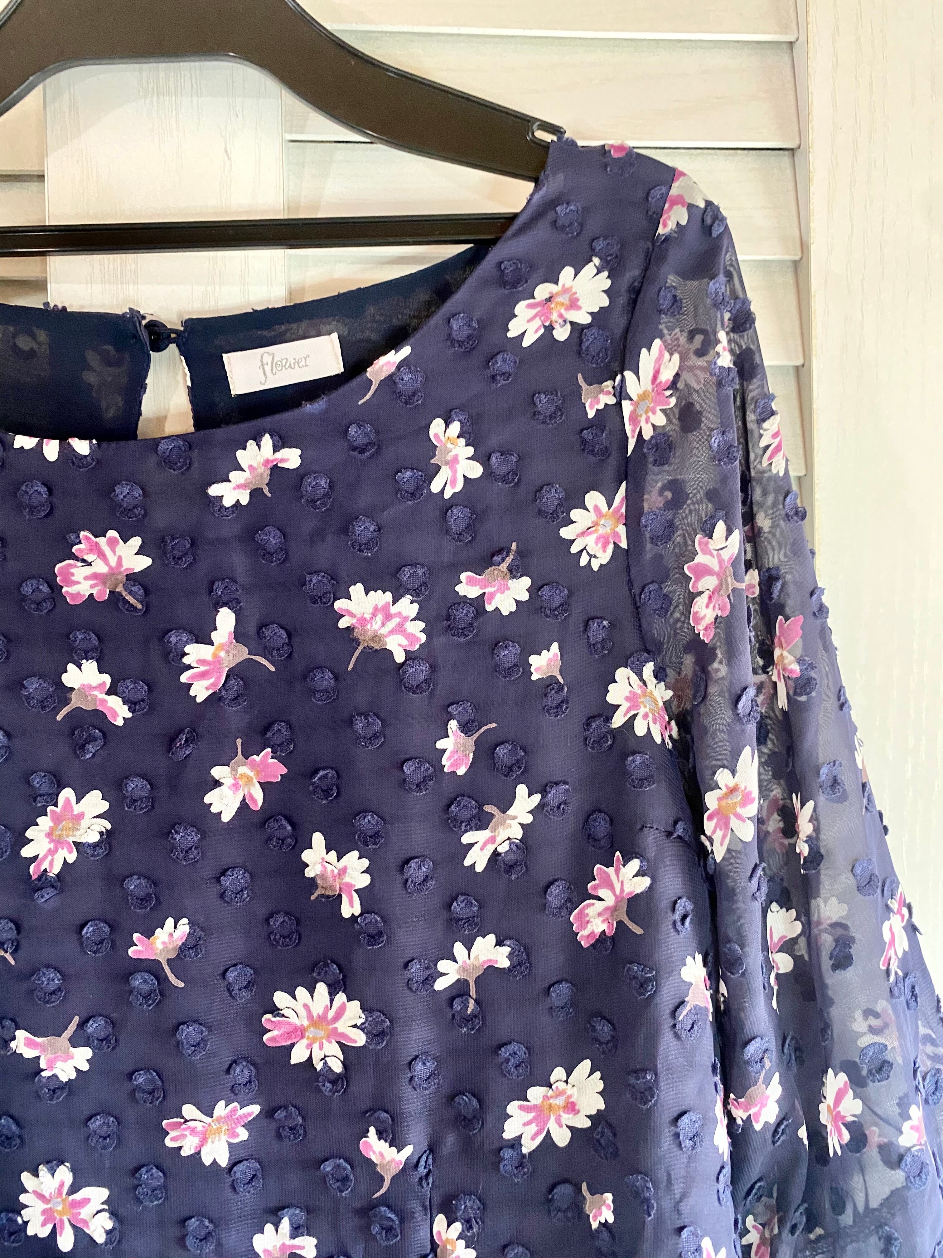 #19 flower ドットシフォン フラワープリント フリンジ切替チュニックワンピ ネイビー