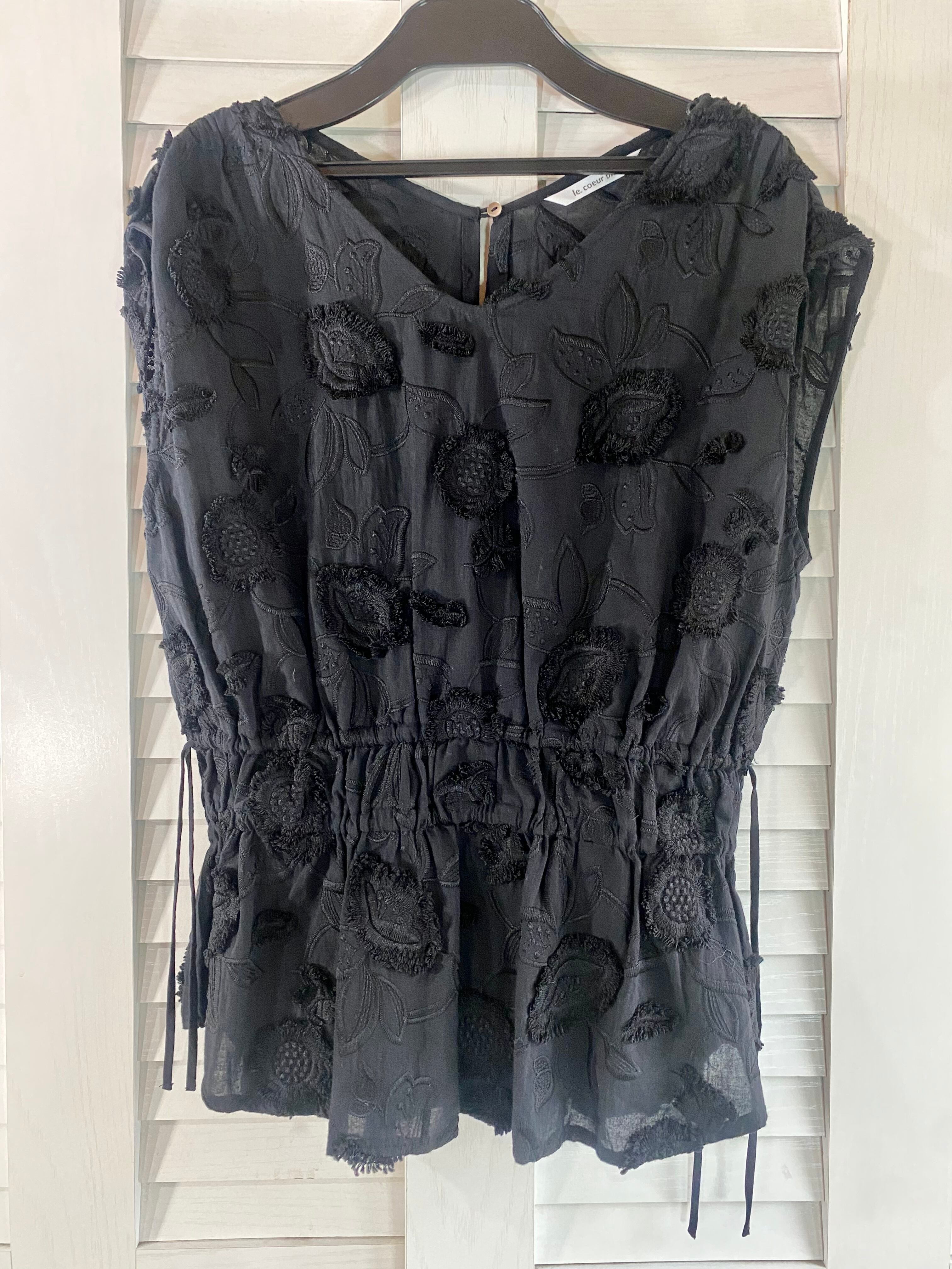 #20 le.cour blanc 立体フラワー刺繍 フレンチスリーブ コットンブラウス ブラック