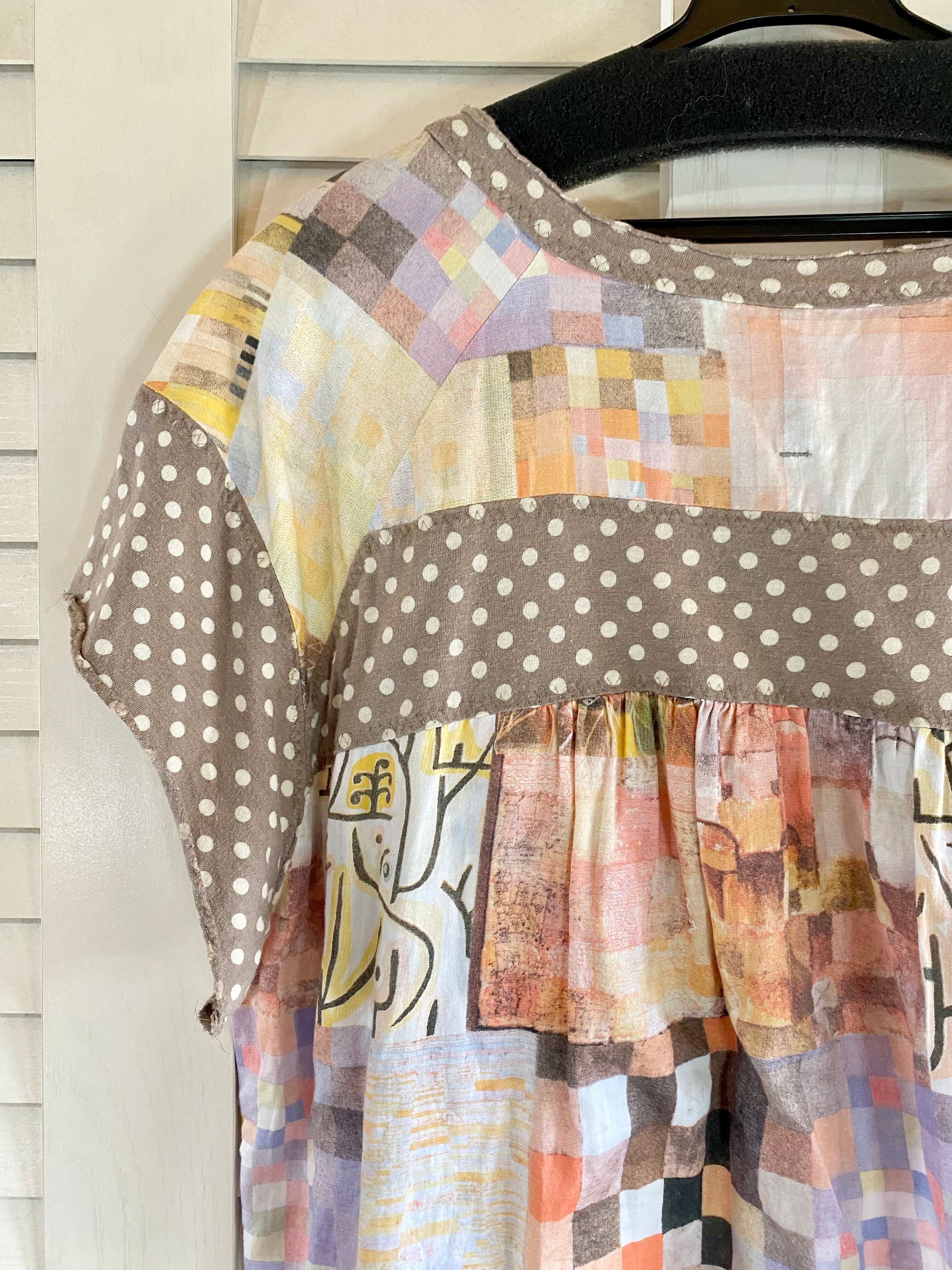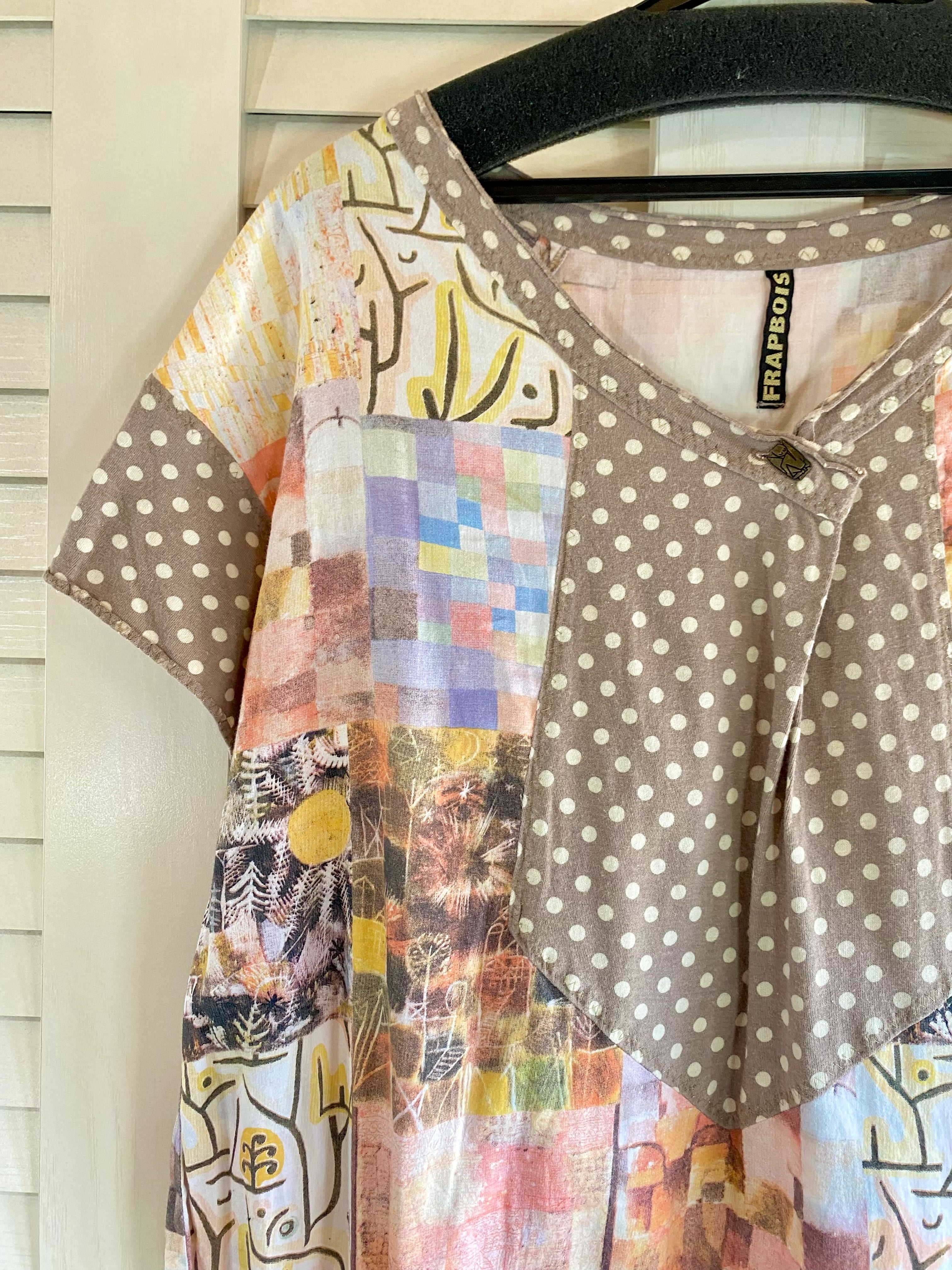#21 FRAPBOIS パッチワークデザイン アンティークモザイク チュニックワンピ モカベージュ